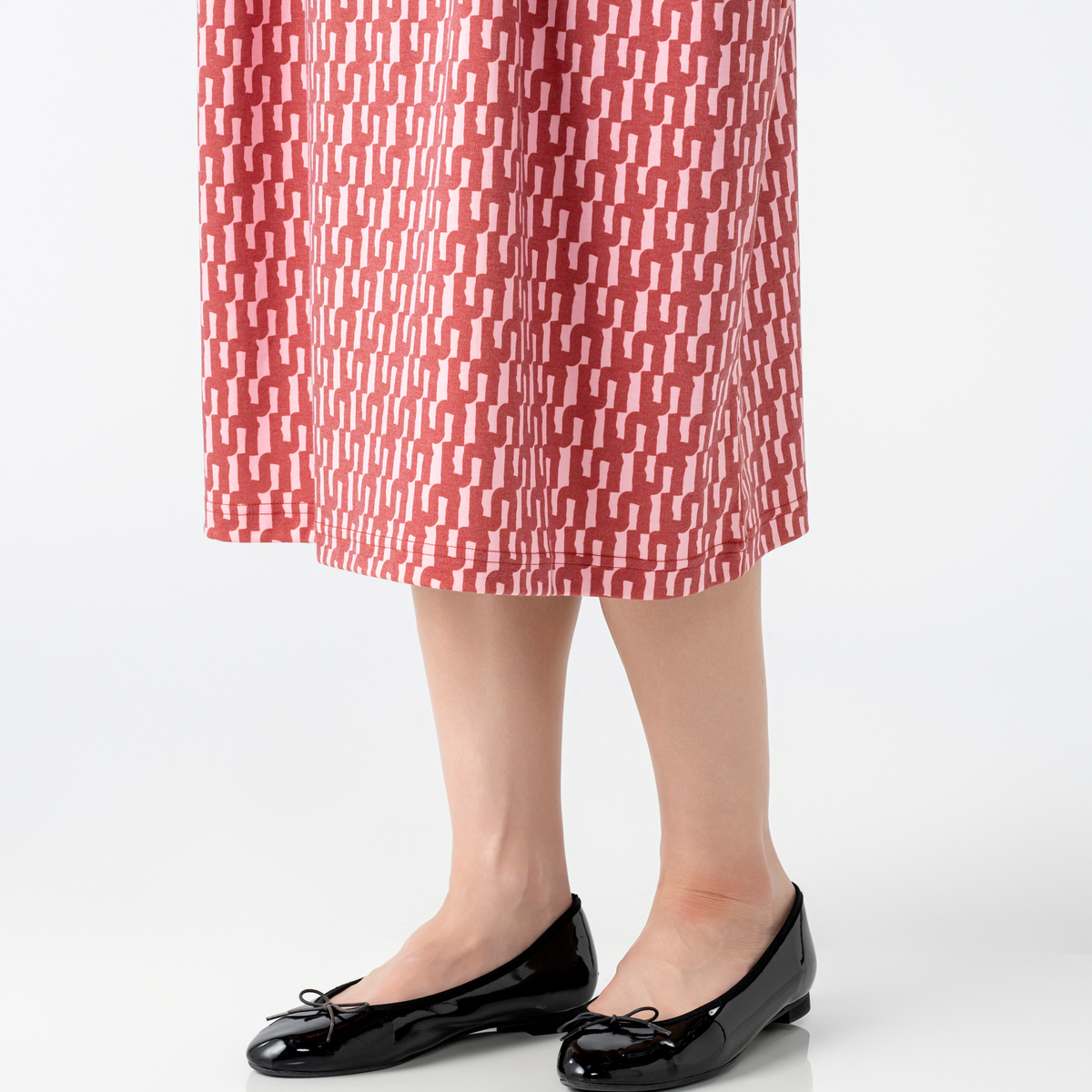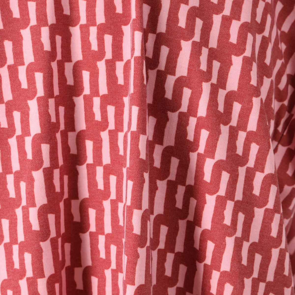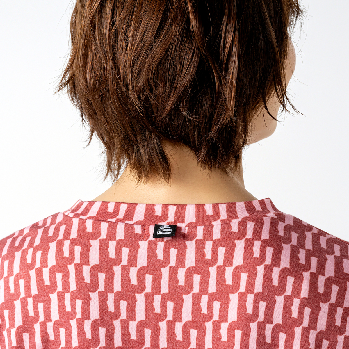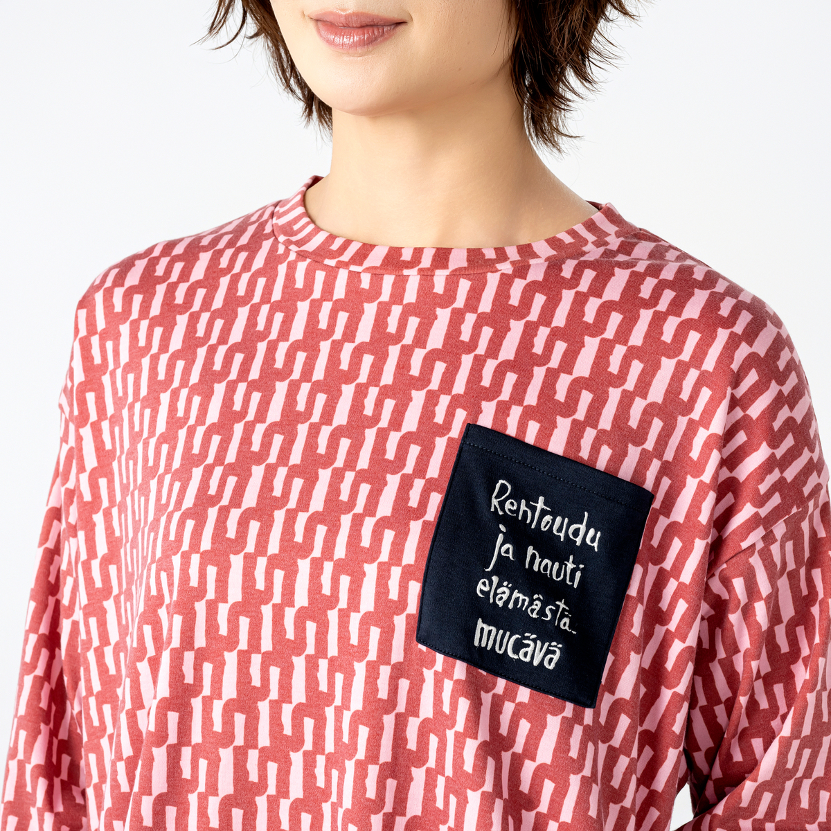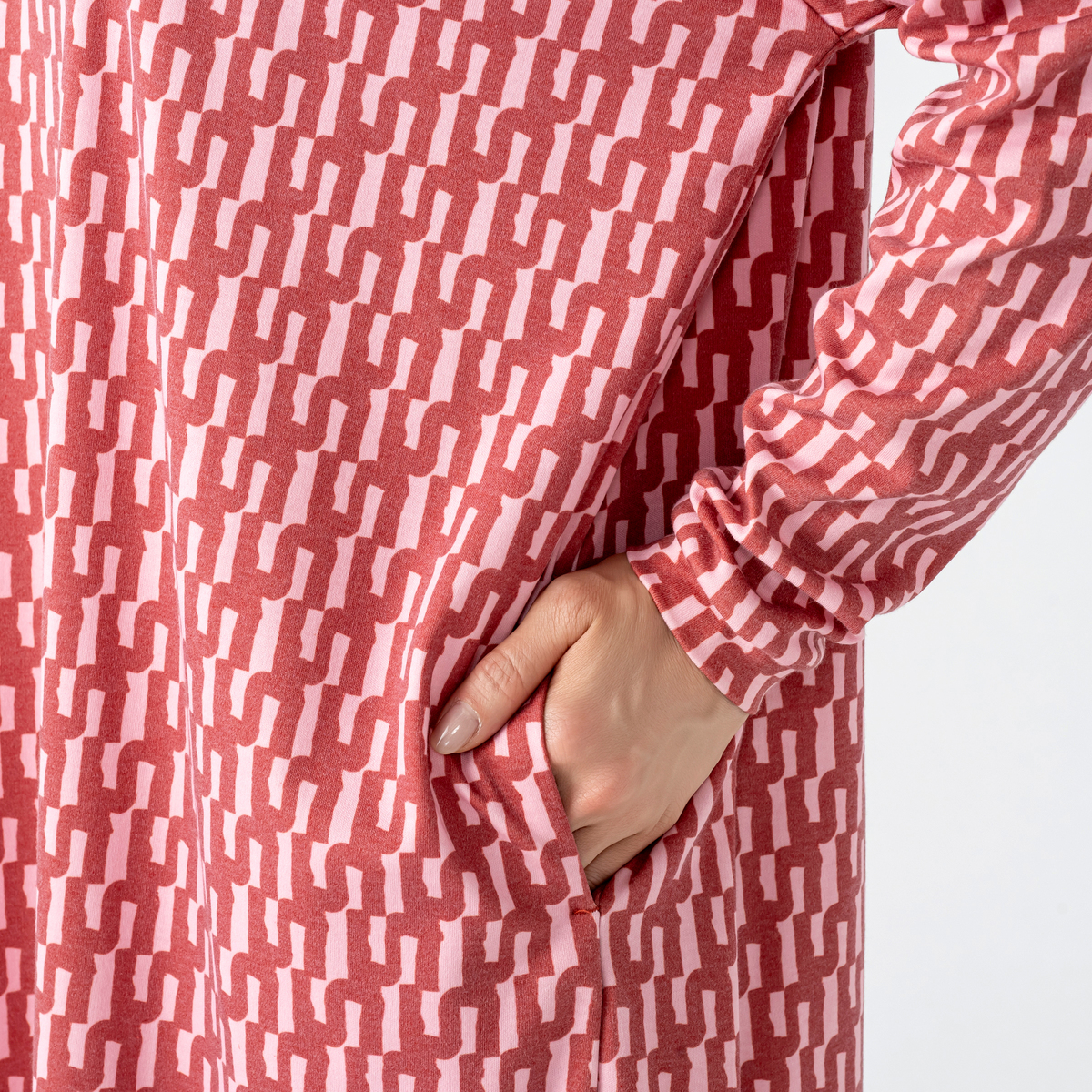 バイカラーで大胆なグラフィックを配したワンピース。フィンランドのアーティスト、イェンニ・トゥオミネン描き下ろしの柄を採用。幾何学的なフォルムと計算された配色で、総柄でも上品にまとまる一枚です