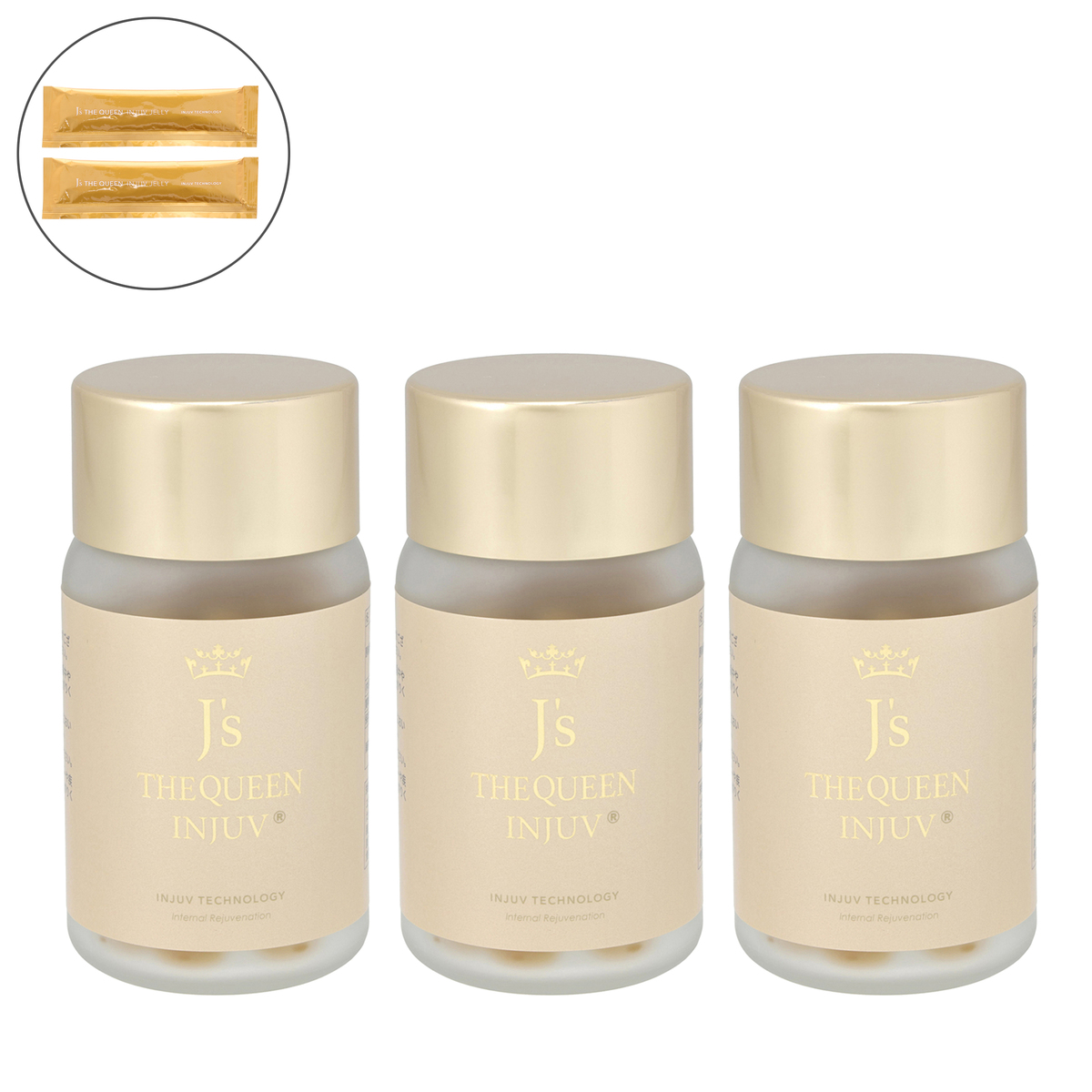 [セット内容] ・超低分子化美容サプリ J’s THE QUEEN INJUV×3 ・J’s THE QUEEN INJUV JELLY 2本(プレゼント) [原材料] 鶏冠分解物(国内製造)、亜麻仁油(国内製造)、エゴマ油/ゼラチン、グリセリン、ミツロウ、グリセリン脂肪酸エステル、植物レシチン(大豆由来)