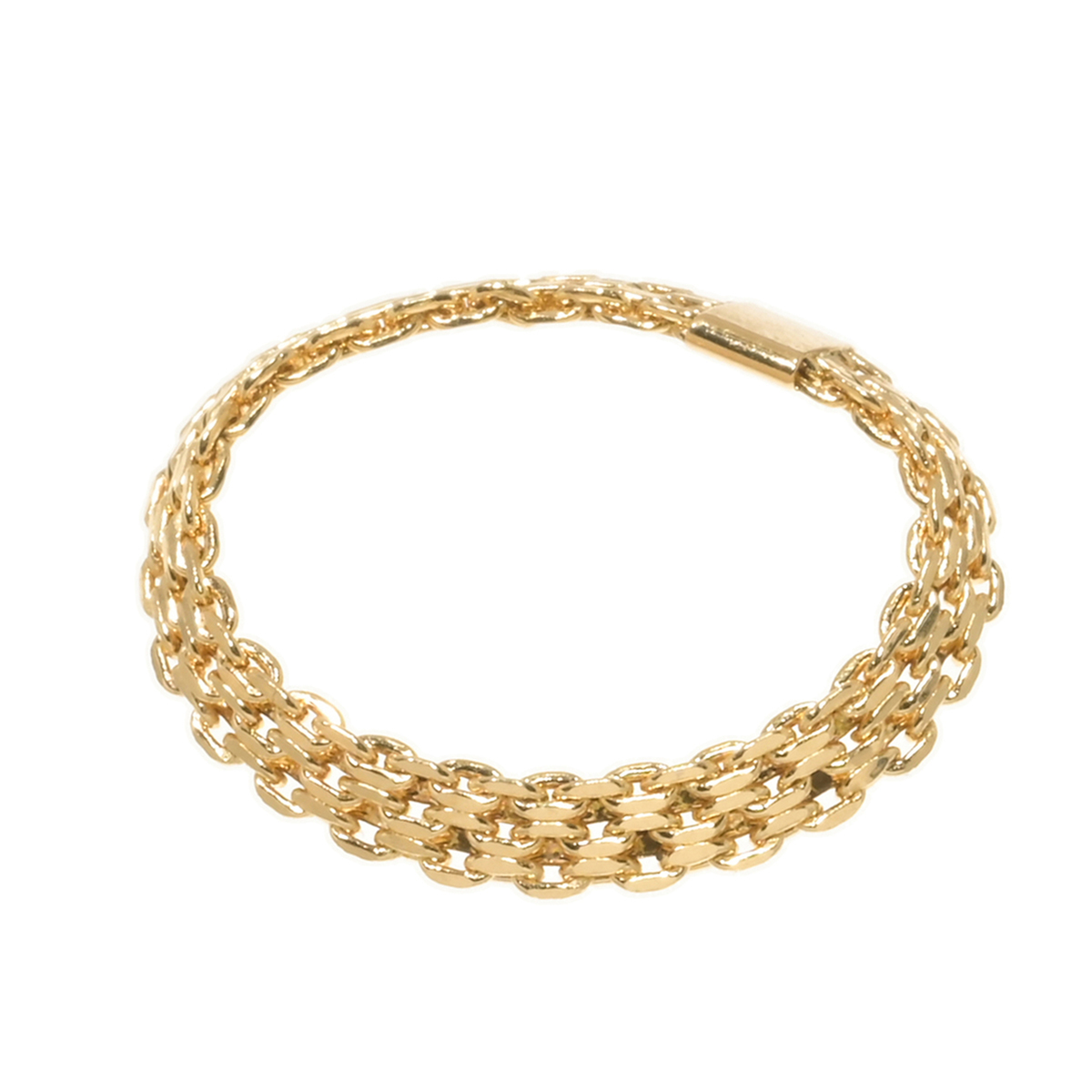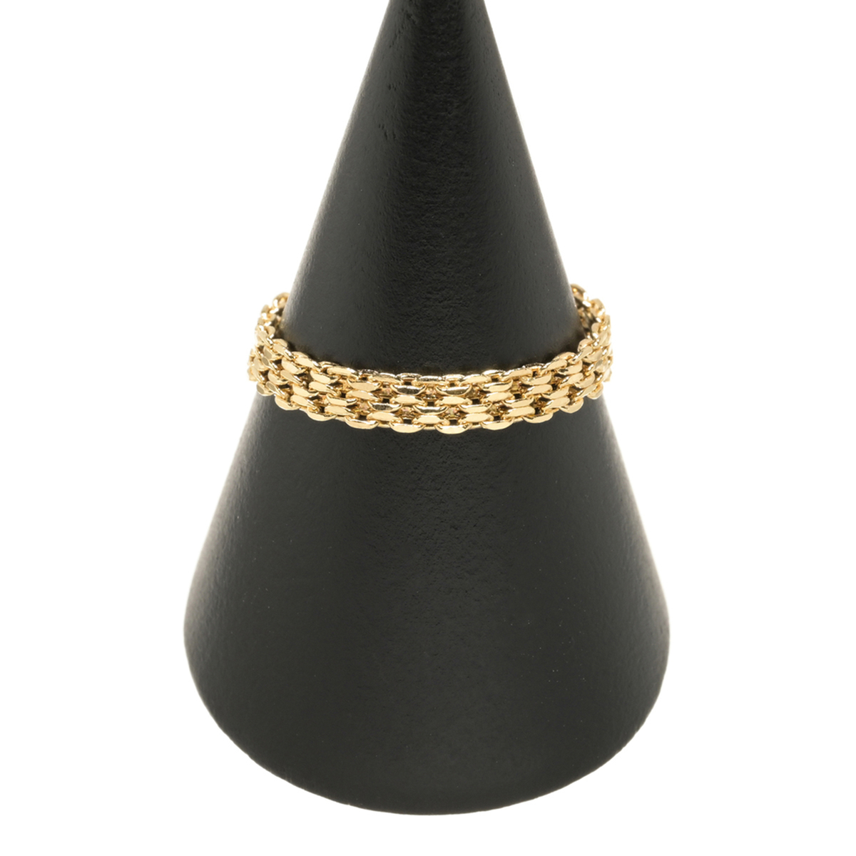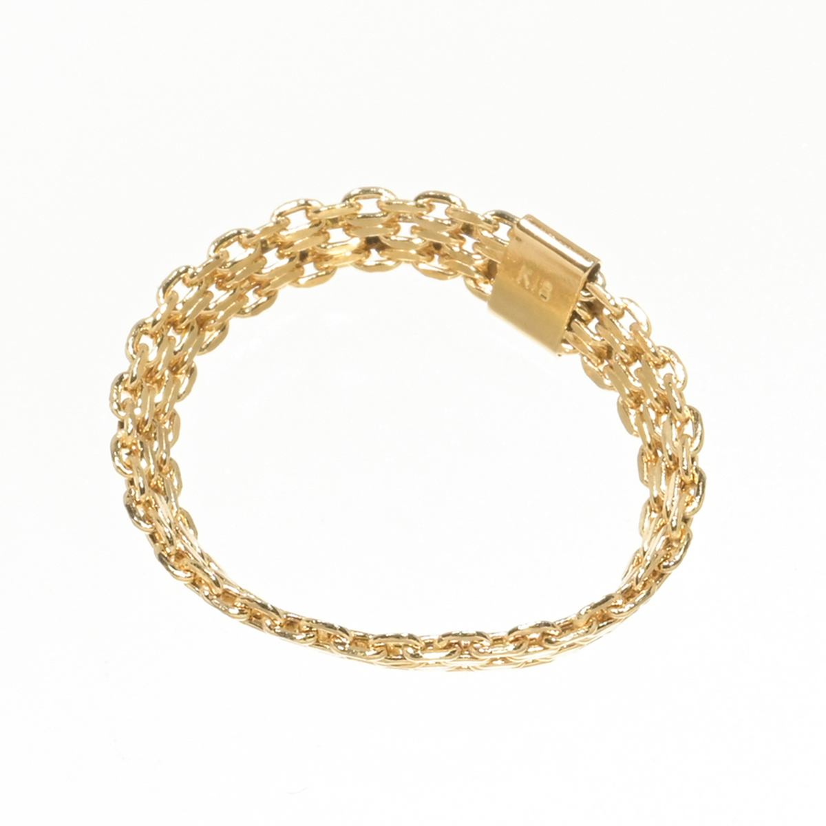 カット小豆チェーンを3列に並べて溶接した、フラットなボリューム感のあるビスマルクチェーンリング。かご編みのような独特な風合いが印象的なデザインは、見た目のボリュームに反して中空タイプで軽やかな着け心地です
