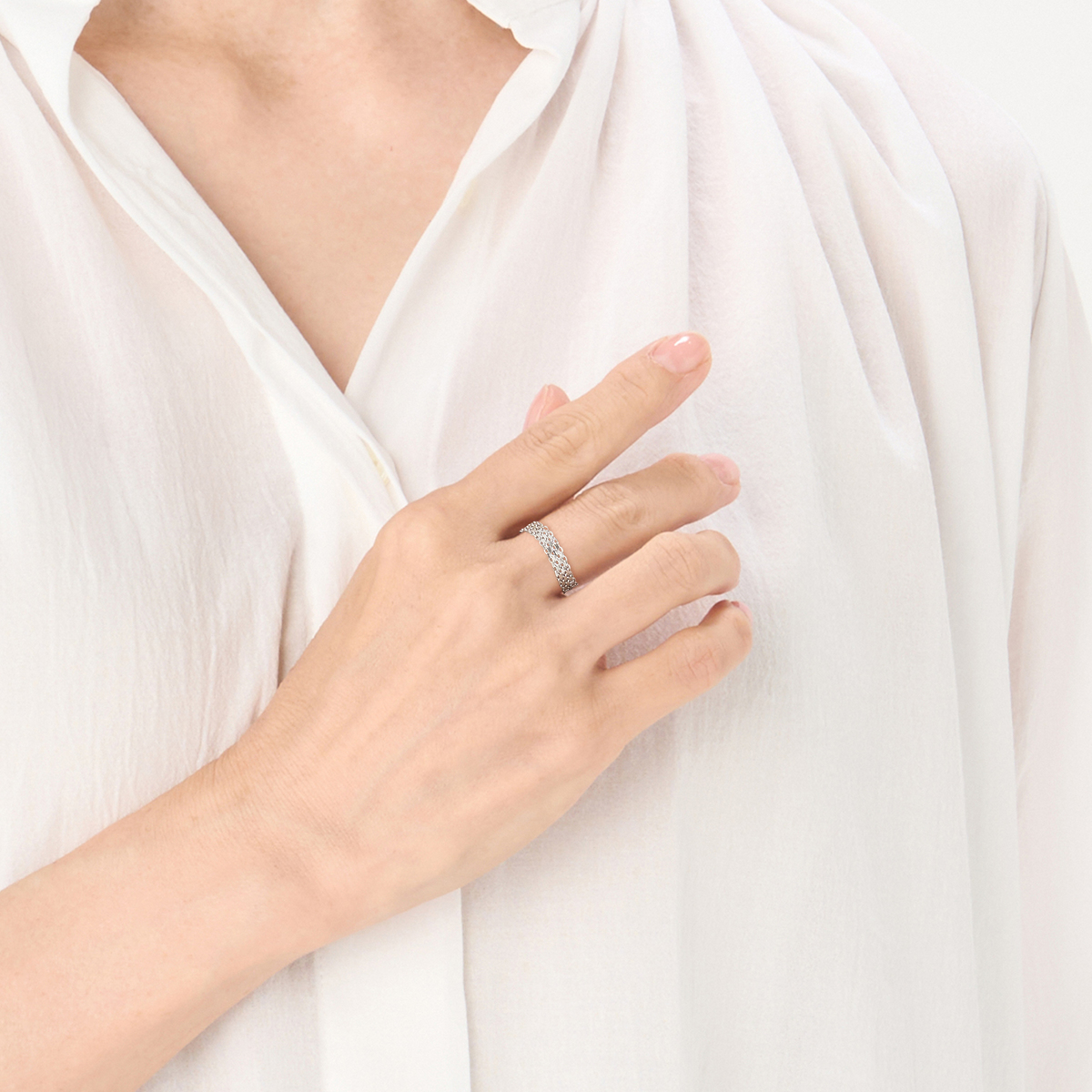 ビスマルクチェーンを使って華やかに仕上げたリング。存在感のあるデザインが個性をプラスし、純プラチナの上品な輝きをお楽しみいただけます