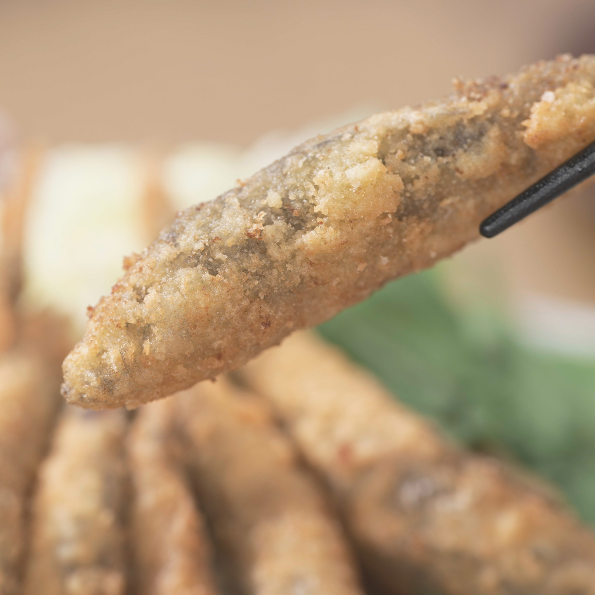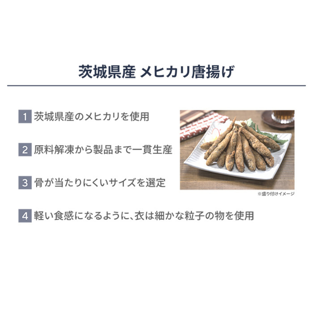 茨城県で水揚げしたメヒカリを使用。170℃の油で約3分を目安に揚げて、お召し上がりください。骨が当たりにくいサイズを選定。頭から尻尾まで丸ごと食べられ、ふっくらとした身と程よい脂が口いっぱいに広がります。ご飯のおかずやお酒のお供にもおすすめです