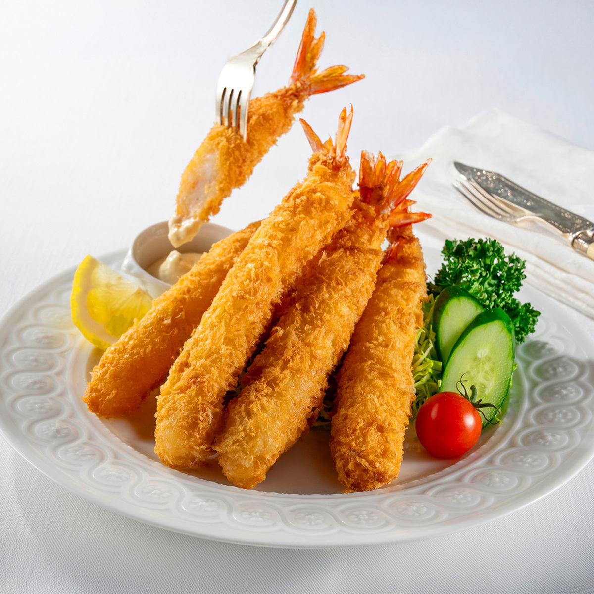 冷凍庫にストックしておけば、晩御飯のおかずや急な来客などにも重宝。大きなエビフライが食卓を彩ります。また、カレーにのせたり、卵でとじて丼にしたり、サンドイッチにしたりと、様々なアレンジもお楽しみください