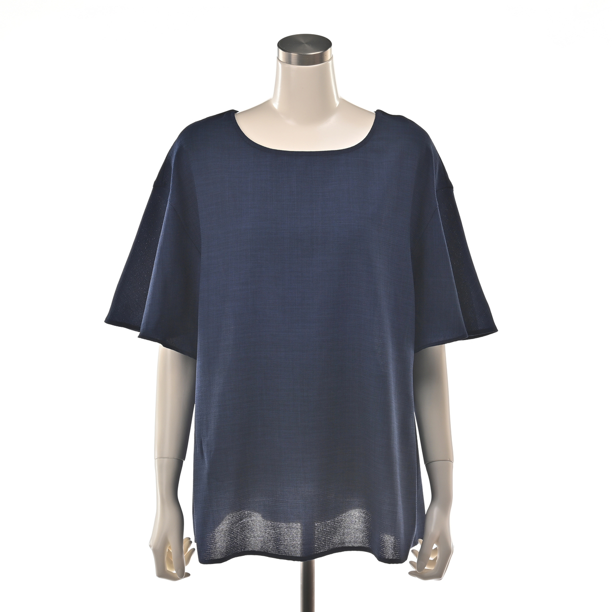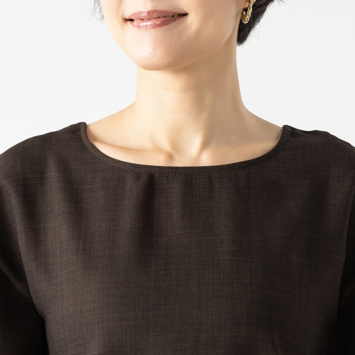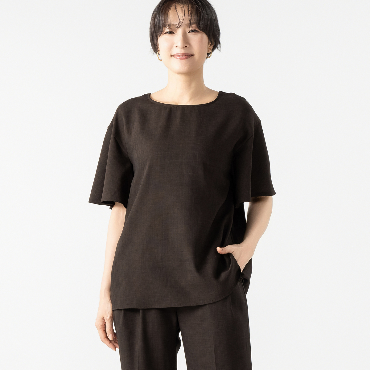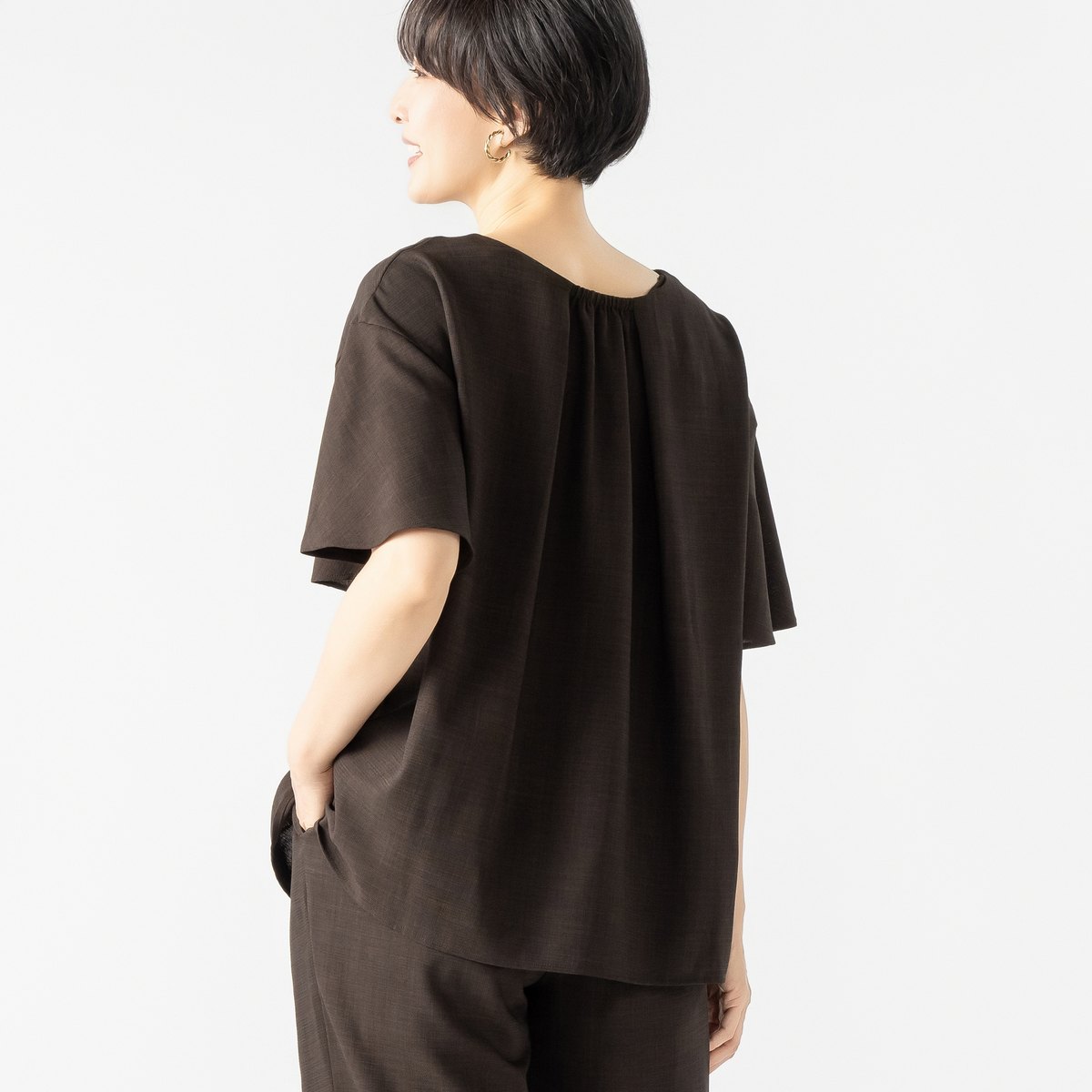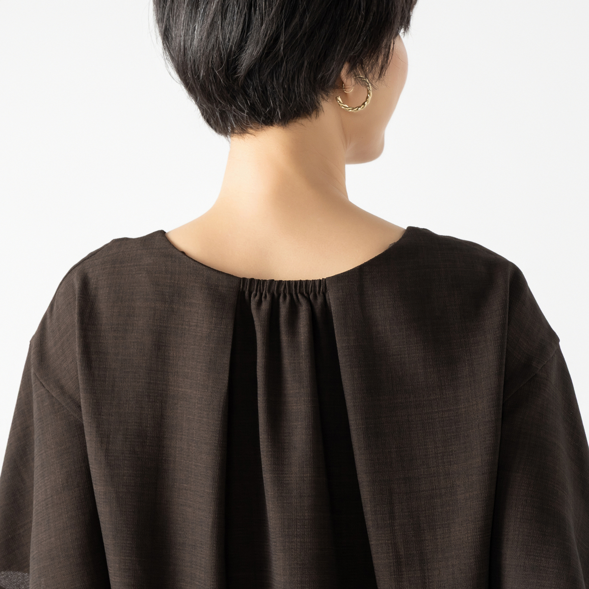 ベーシックなデザインのプルオーバー。袖に少しフレアを入れたデザインです。後ろネック部分にゴムを入れたかぶり仕様ながら、着脱しやすくなっています