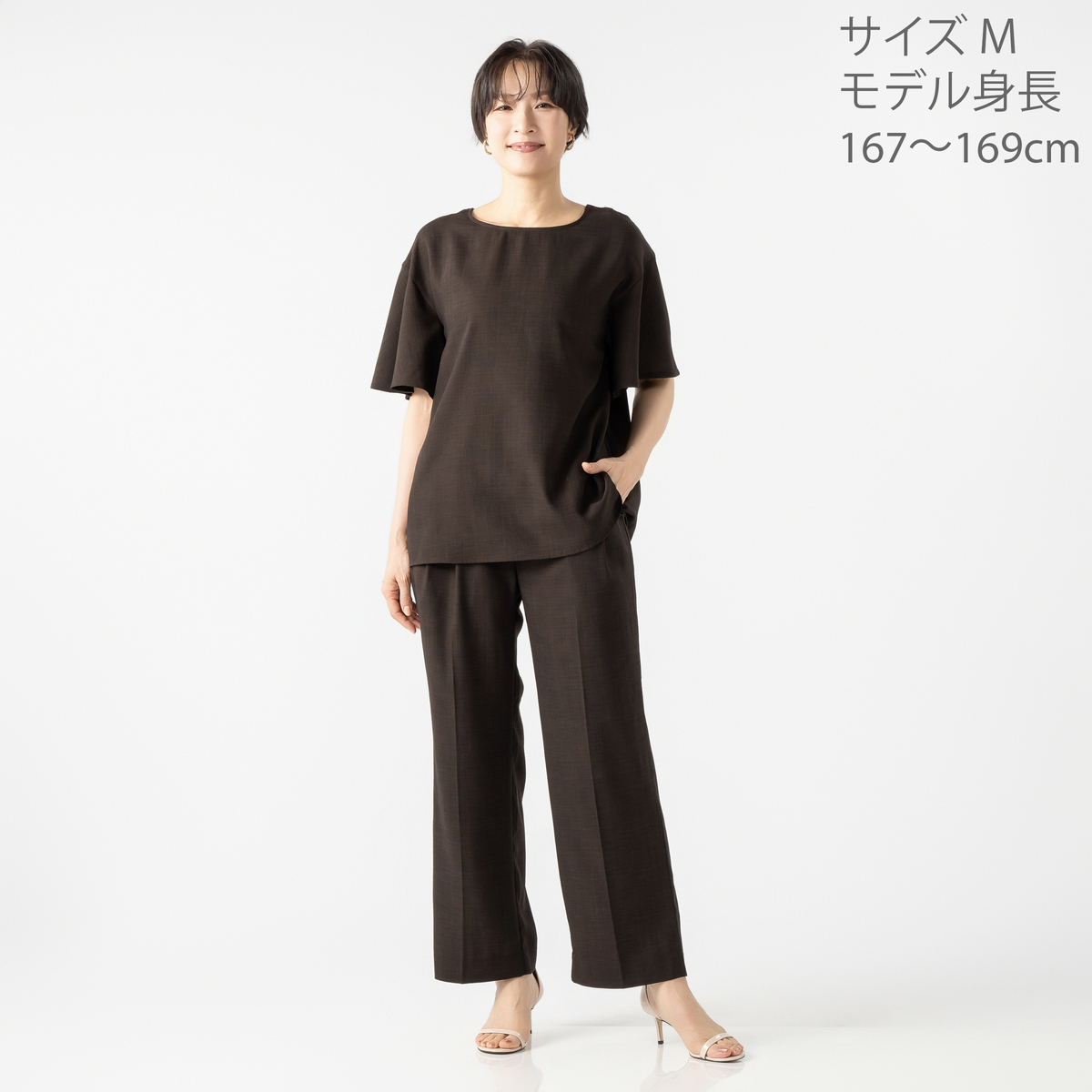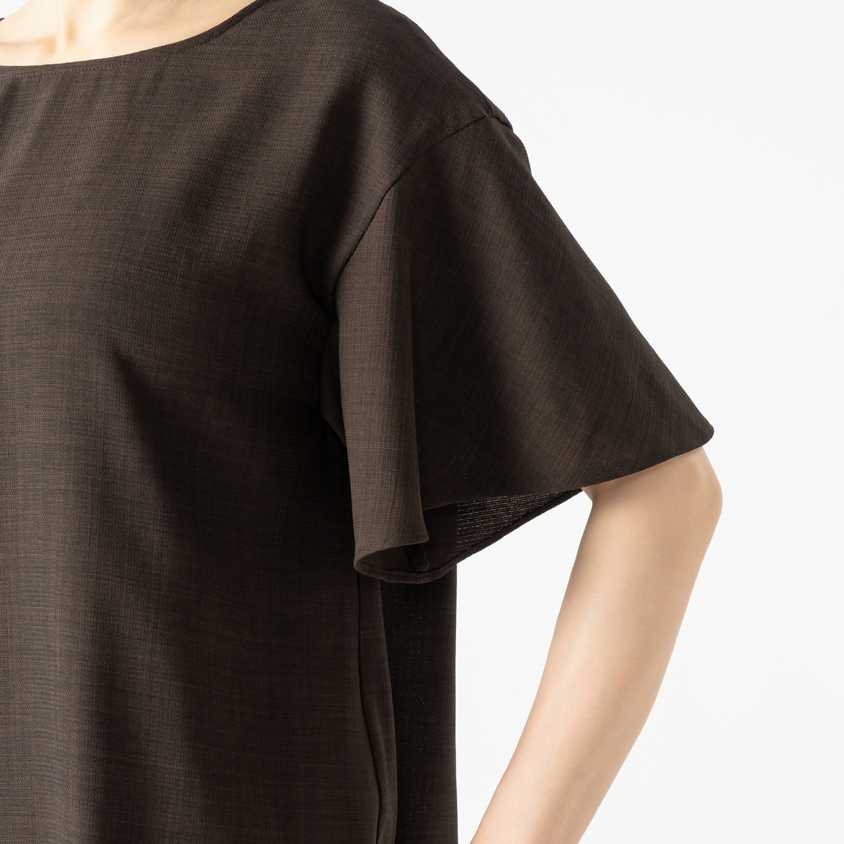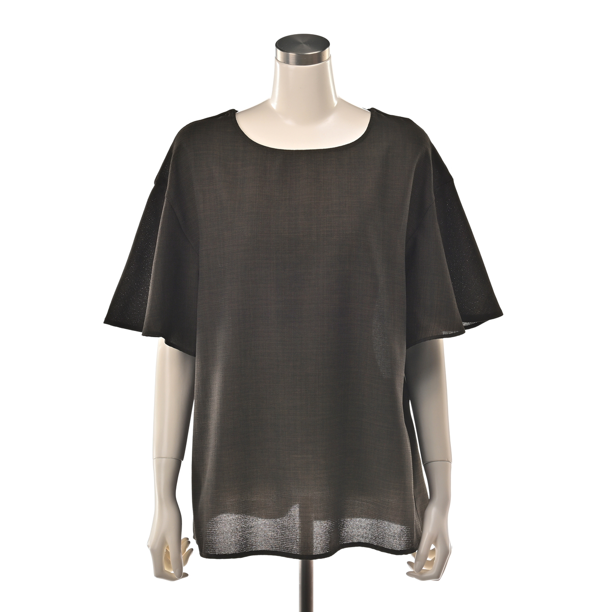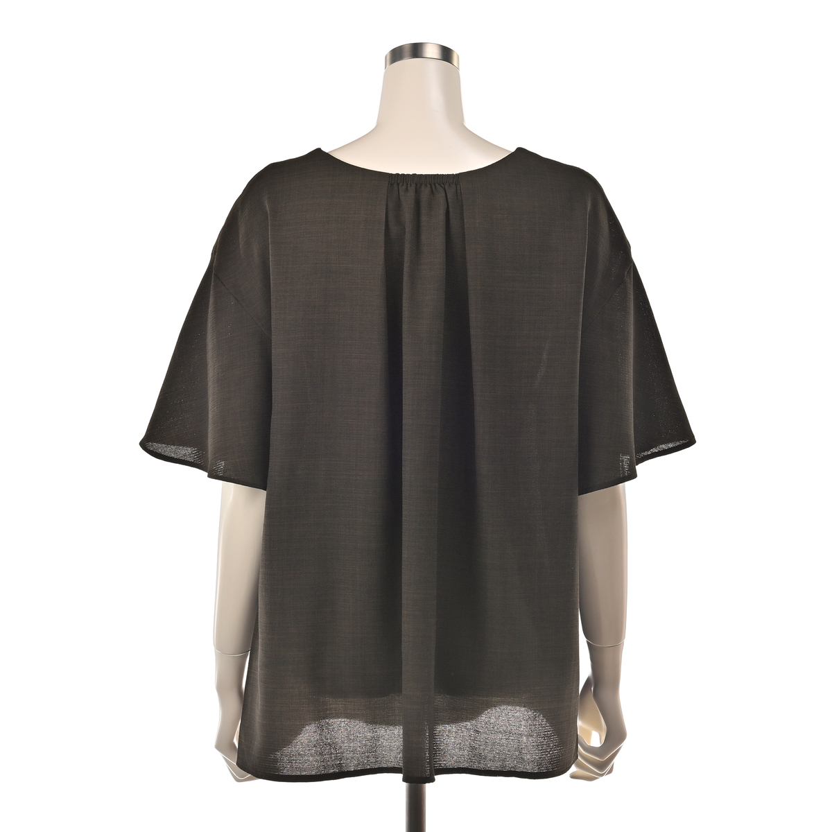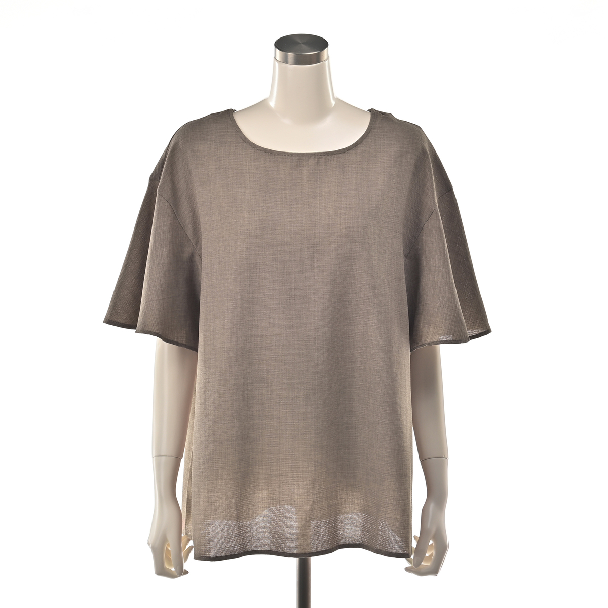 ベーシックなデザインのプルオーバー。袖に少しフレアを入れたデザインです。後ろネック部分にゴムを入れたかぶり仕様ながら、着脱しやすくなっています