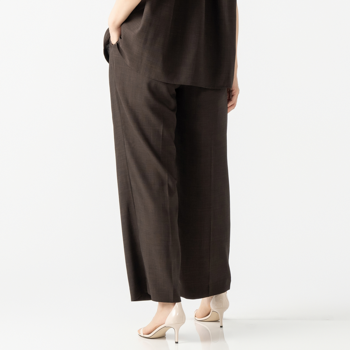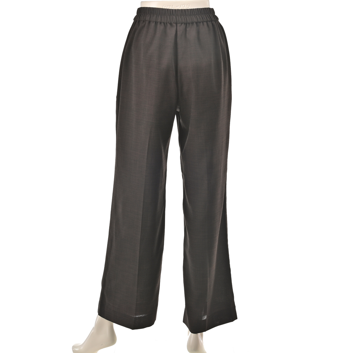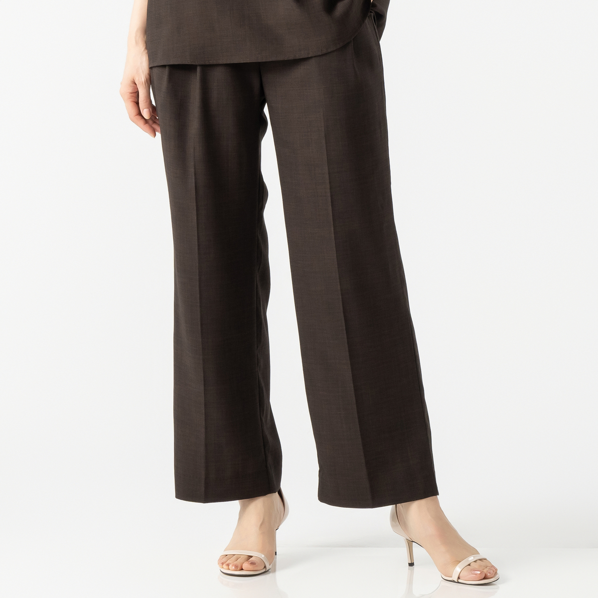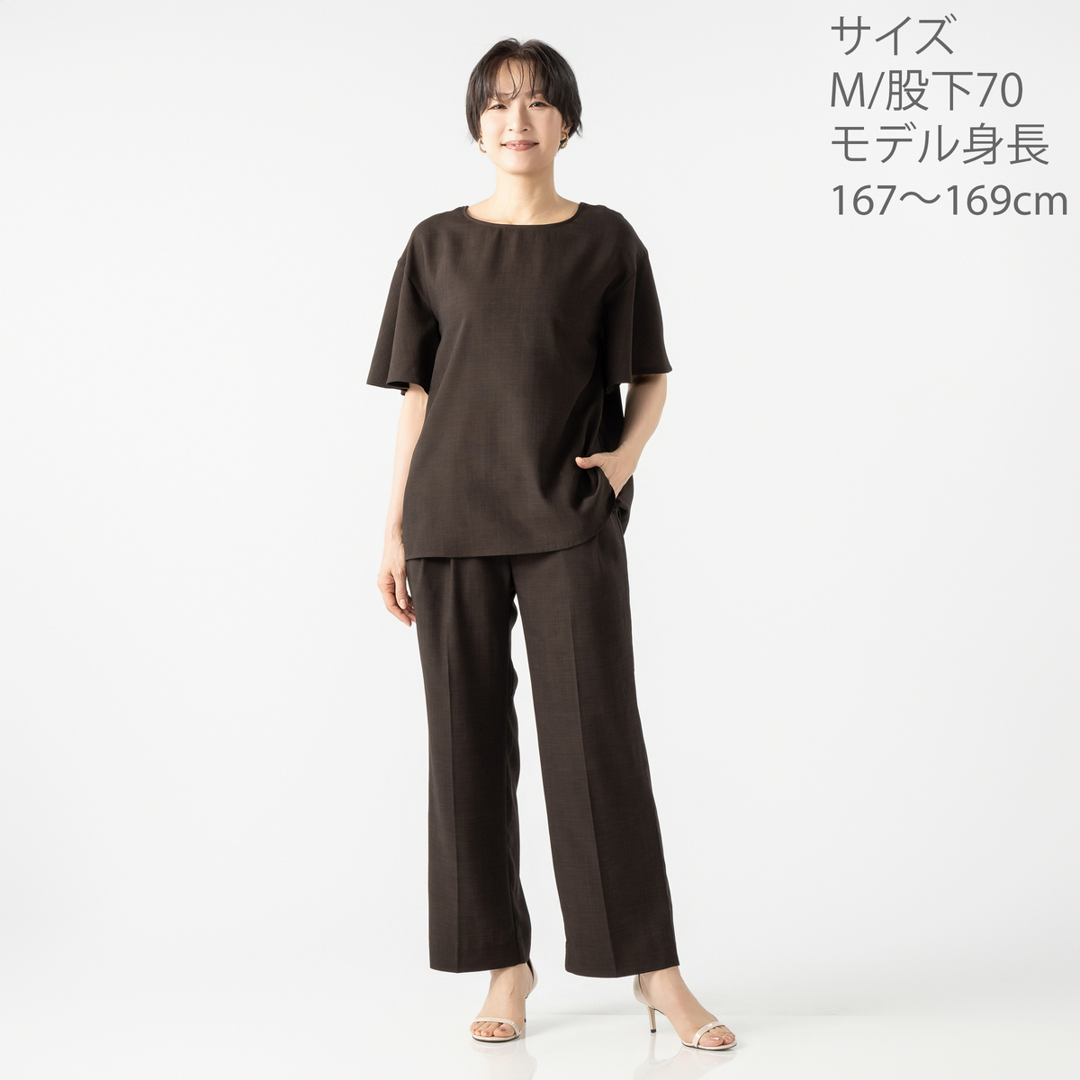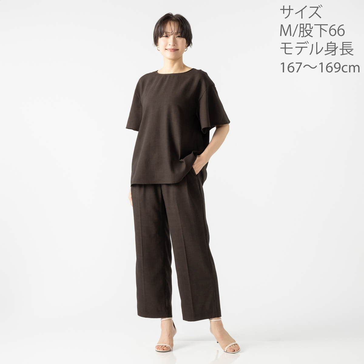 すっきりしたシルエットのタックセミワイドパンツ。ウエストは後ろゴム仕様でらくちんながら、センタープレスが縦ラインを強調して脚をすっきり見せてくれます。半裏付きで透け感をカバーし、安心して着用いただけます