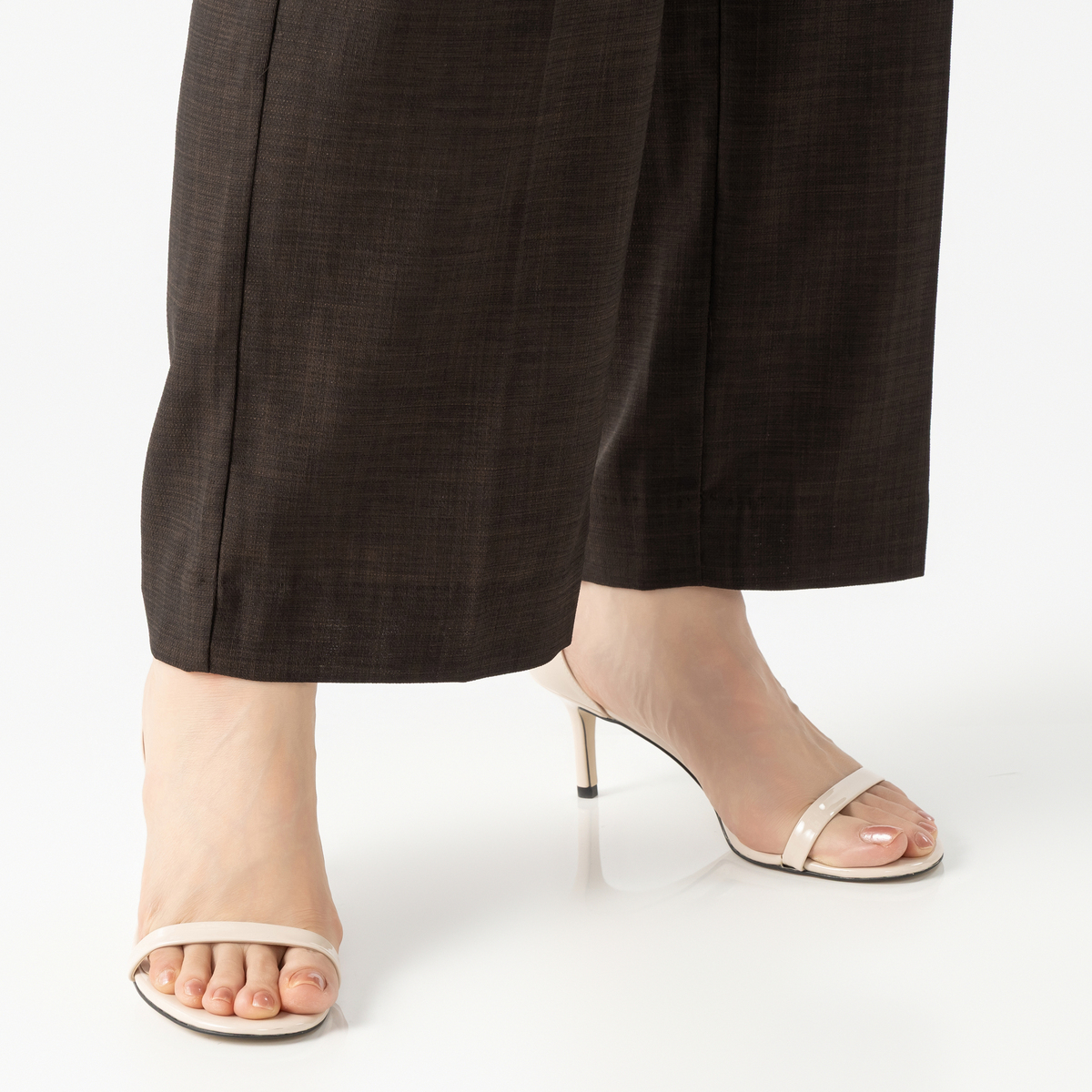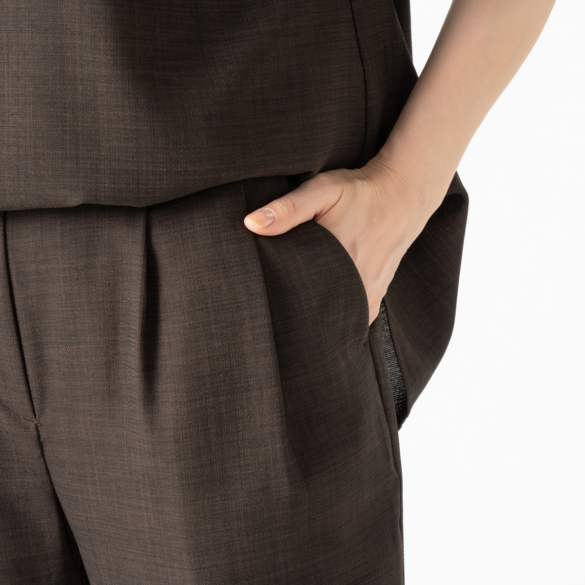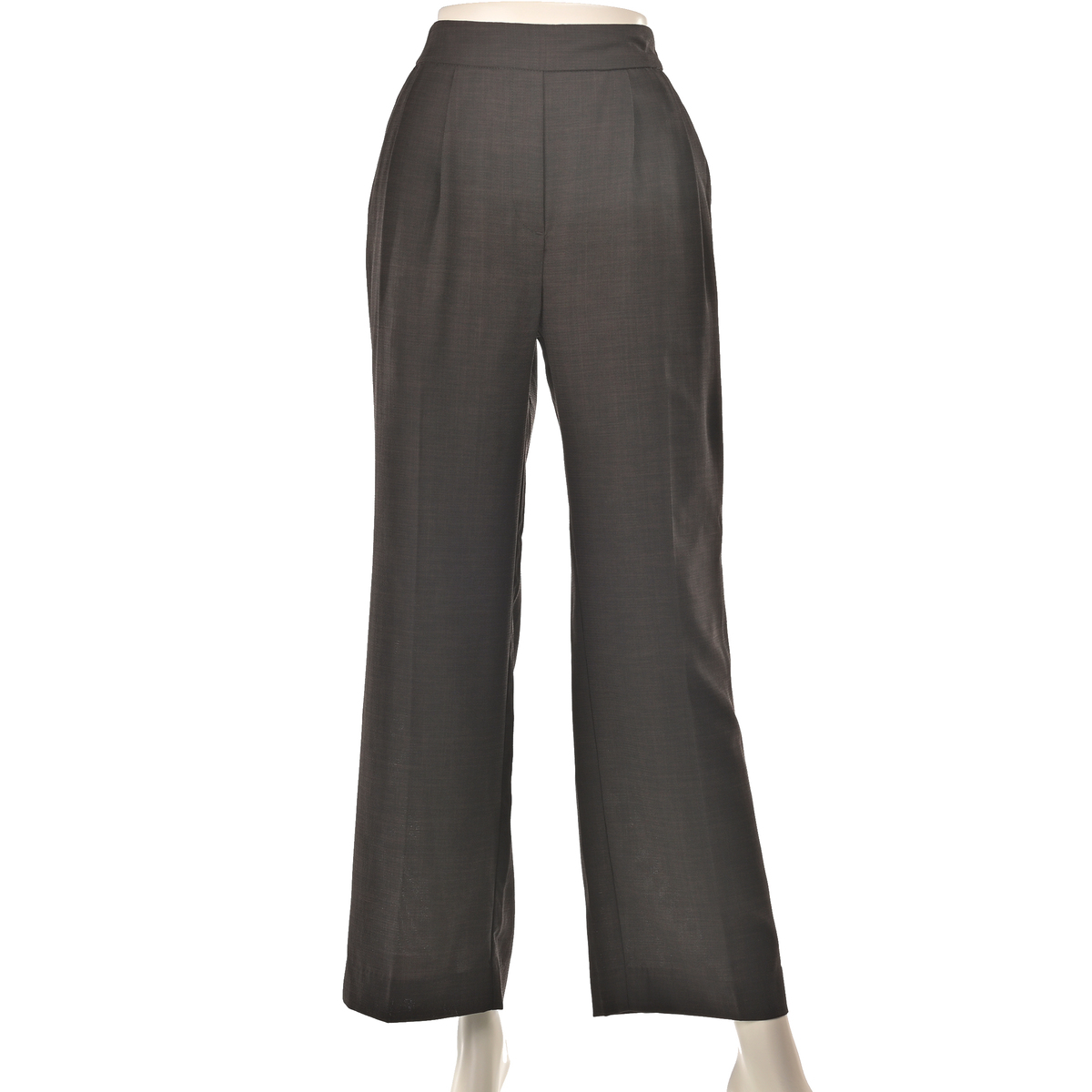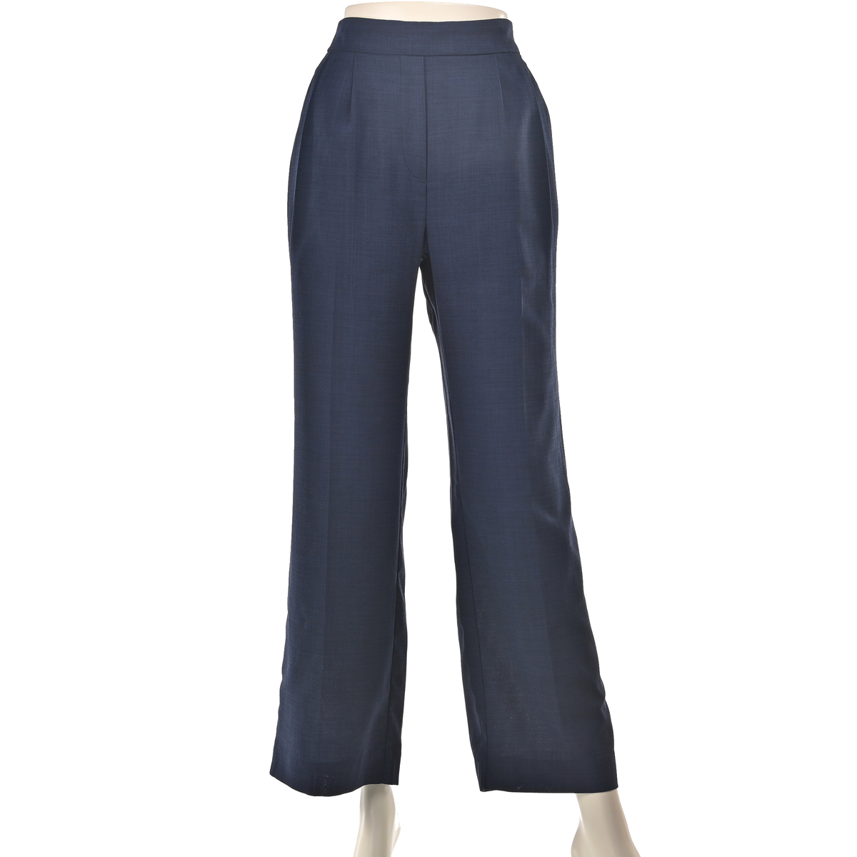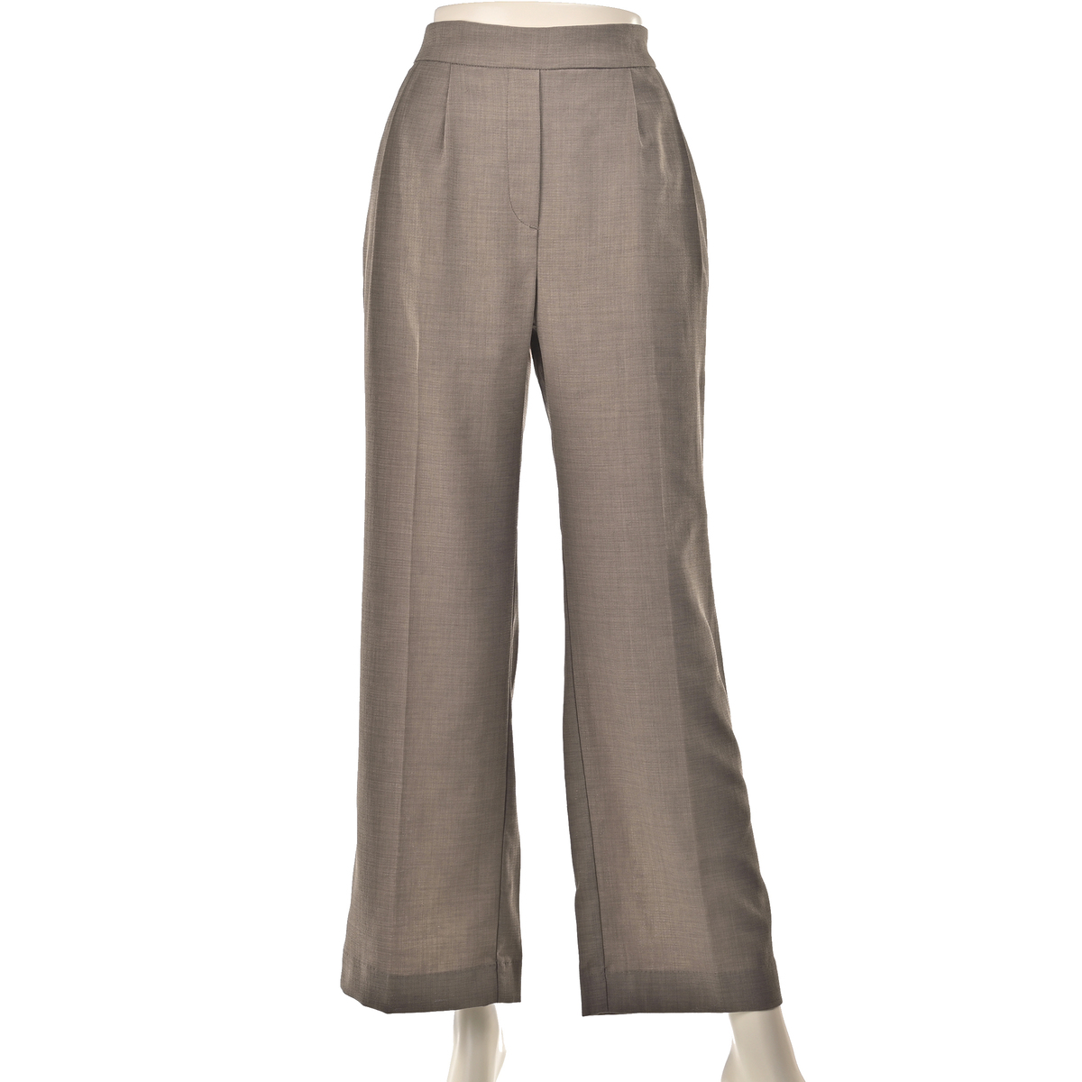 すっきりしたシルエットのタックセミワイドパンツ。ウエストは後ろゴム仕様でらくちんながら、センタープレスが縦ラインを強調して脚をすっきり見せてくれます。半裏付きで透け感をカバーし、安心して着用いただけます