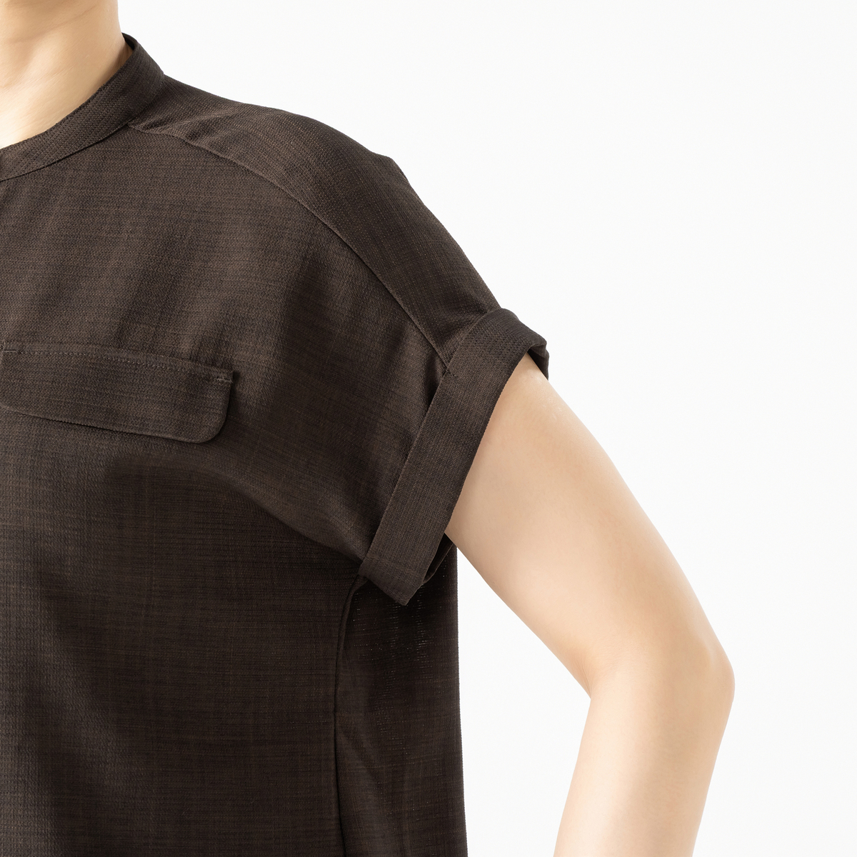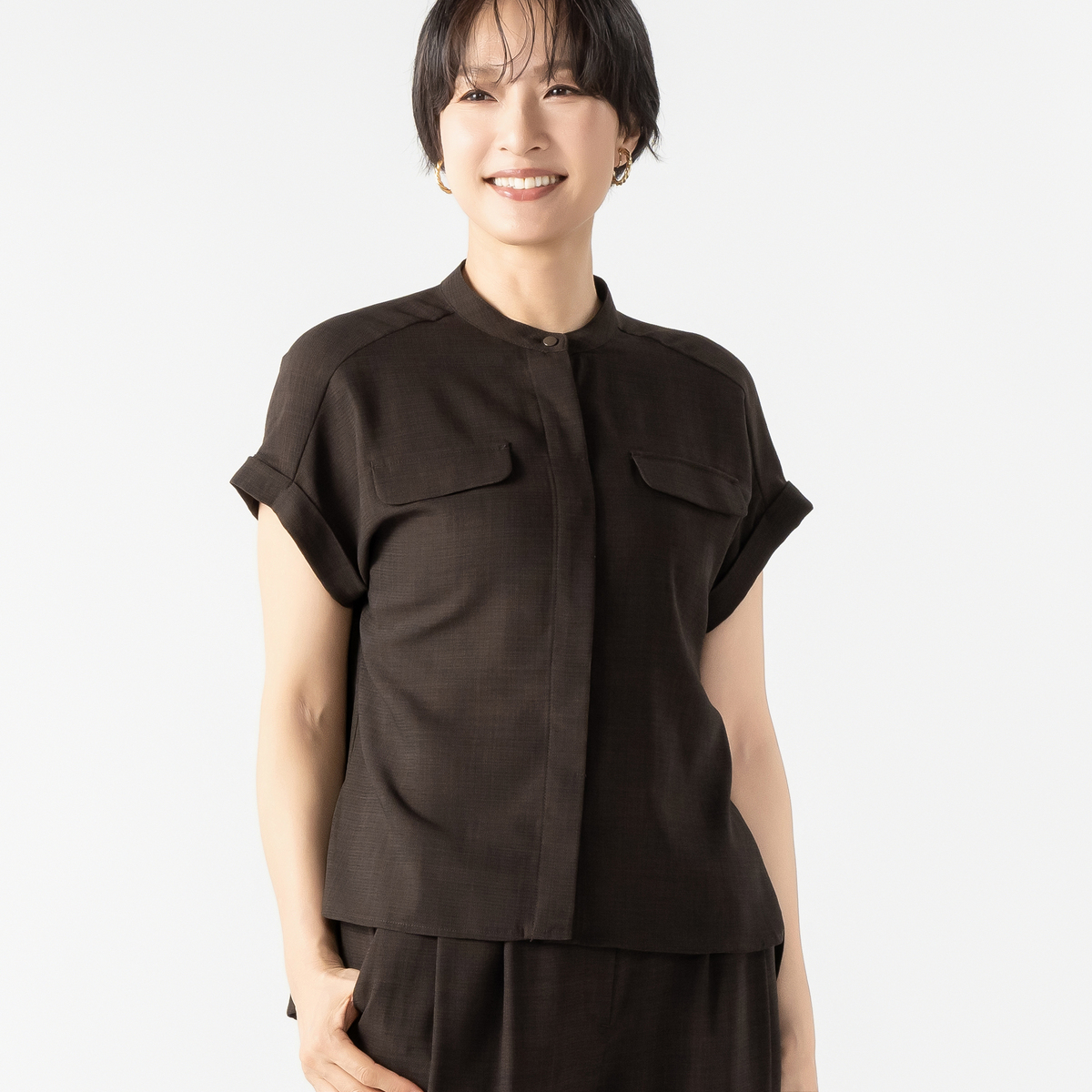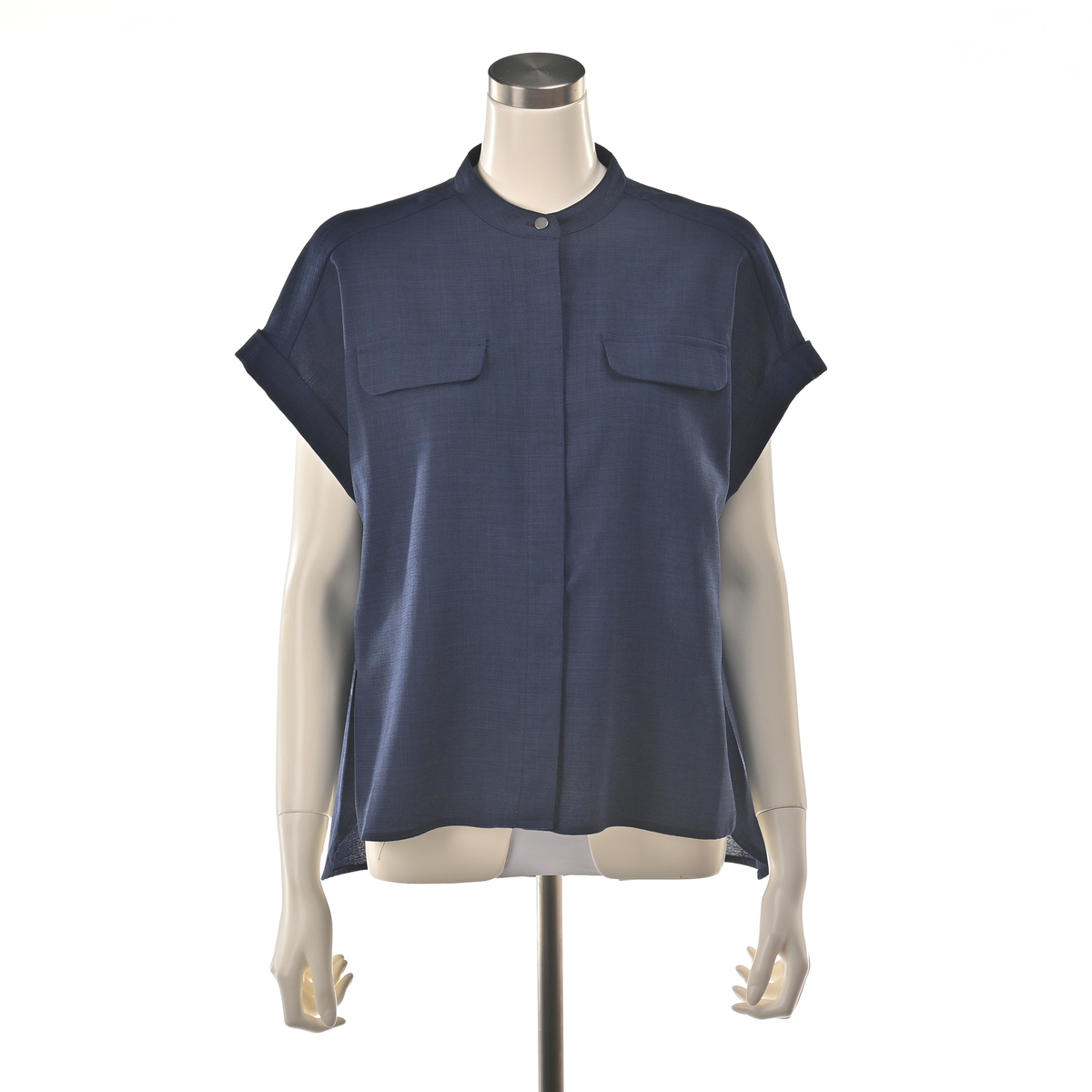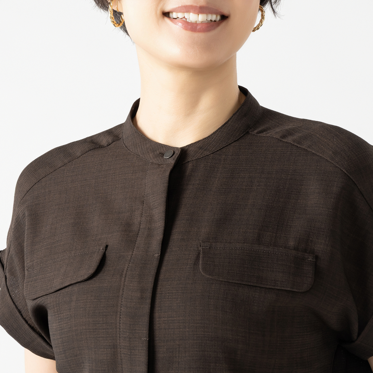 バンドカラーのブラウスです。前開きはボタンを隠した比翼仕立てで、胸元両サイドにフラップを付けてアクセントにしています。着丈はボトムインと裾出しのどちらにも対応し、袖はロールアップした仕様です