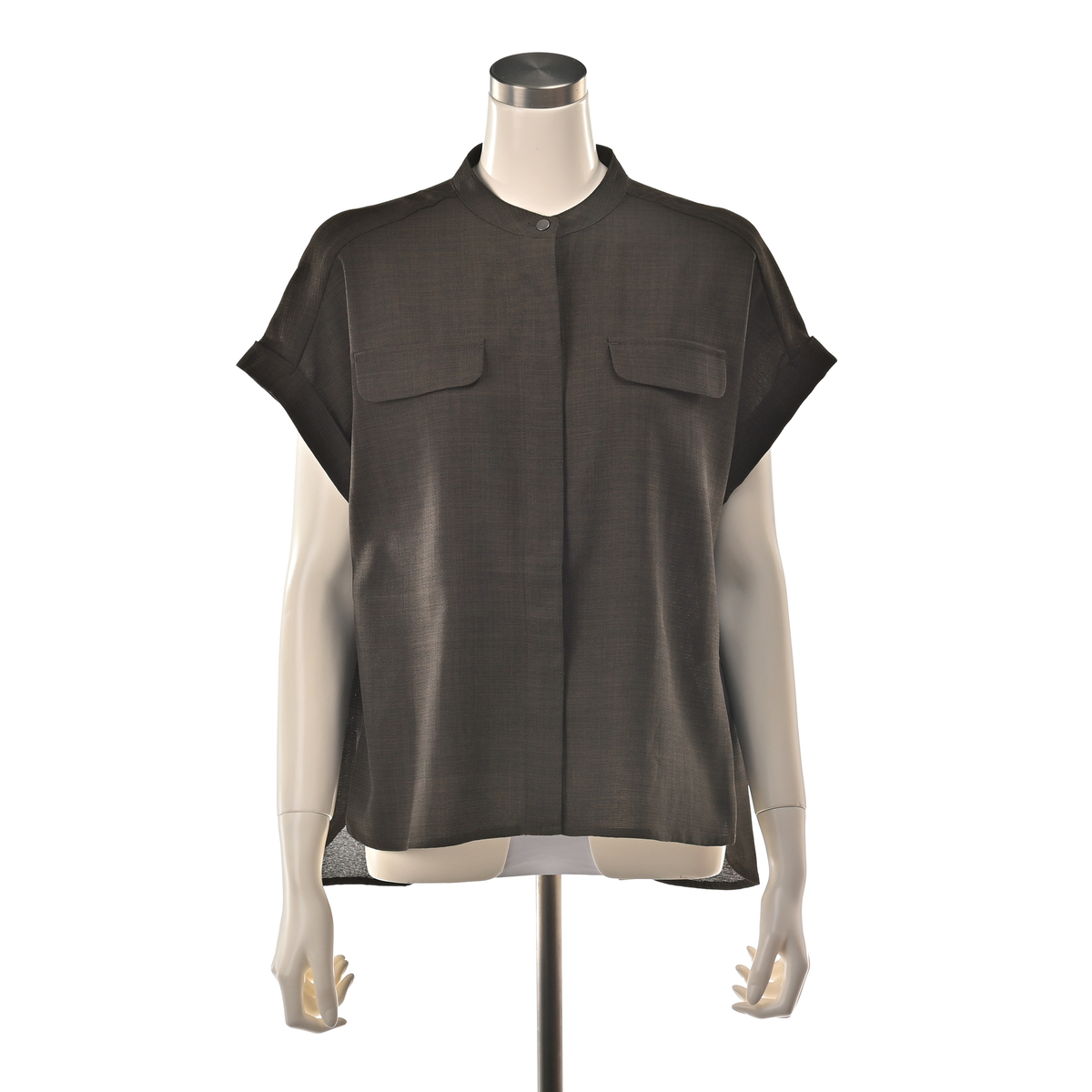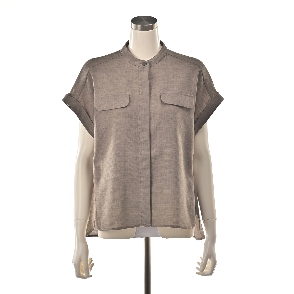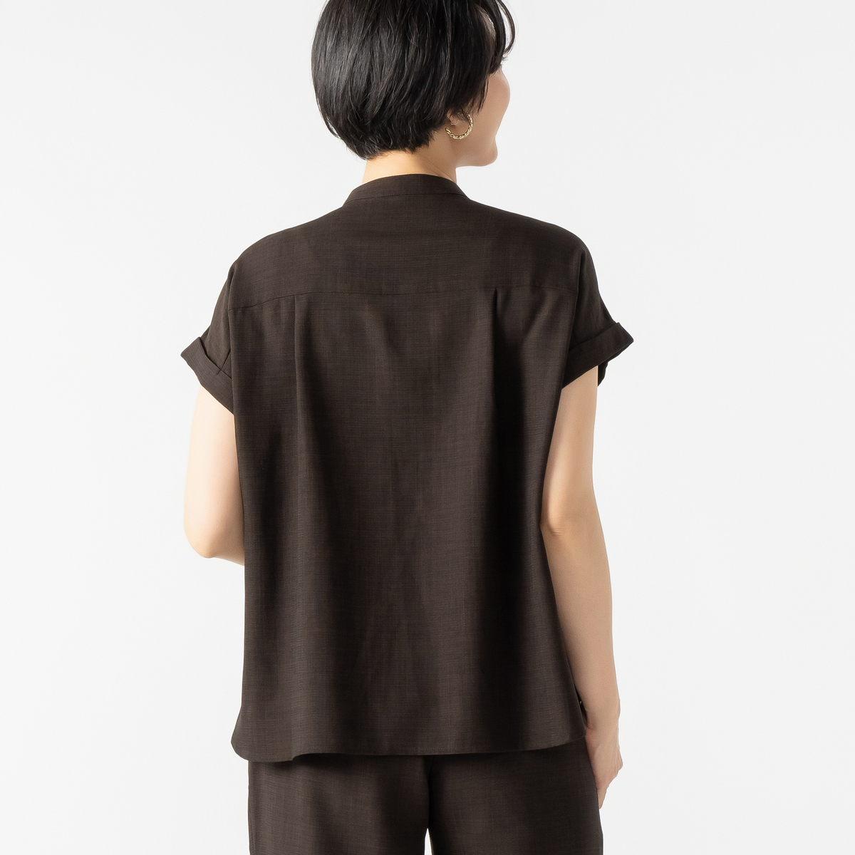 バンドカラーのブラウスです。前開きはボタンを隠した比翼仕立てで、胸元両サイドにフラップを付けてアクセントにしています。着丈はボトムインと裾出しのどちらにも対応し、袖はロールアップした仕様です