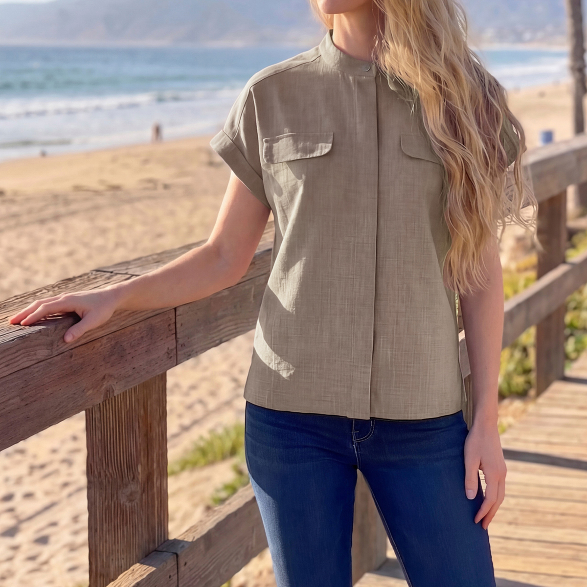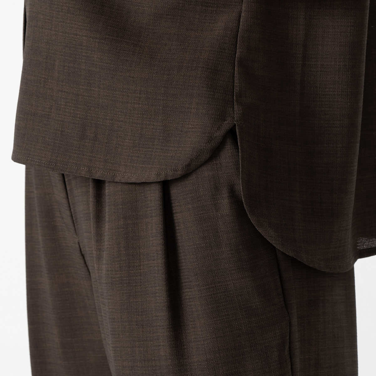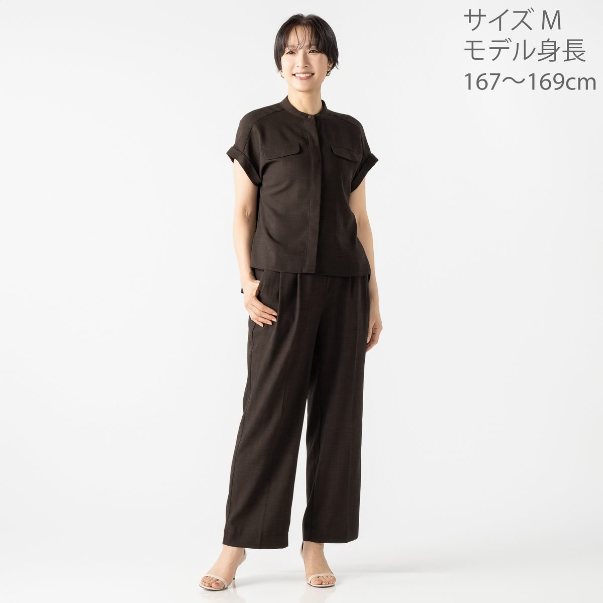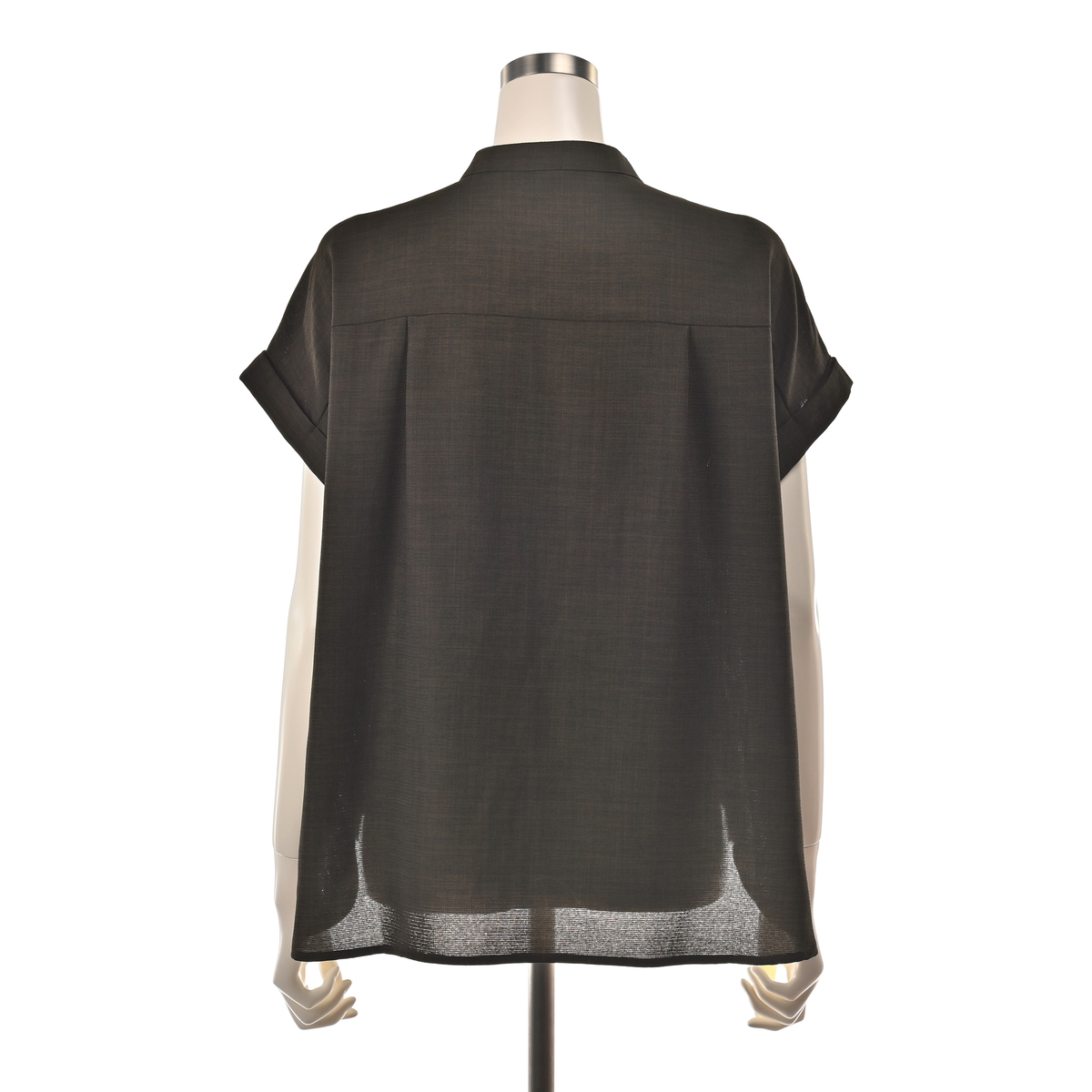 バンドカラーのブラウスです。前開きはボタンを隠した比翼仕立てで、胸元両サイドにフラップを付けてアクセントにしています。着丈はボトムインと裾出しのどちらにも対応し、袖はロールアップした仕様です