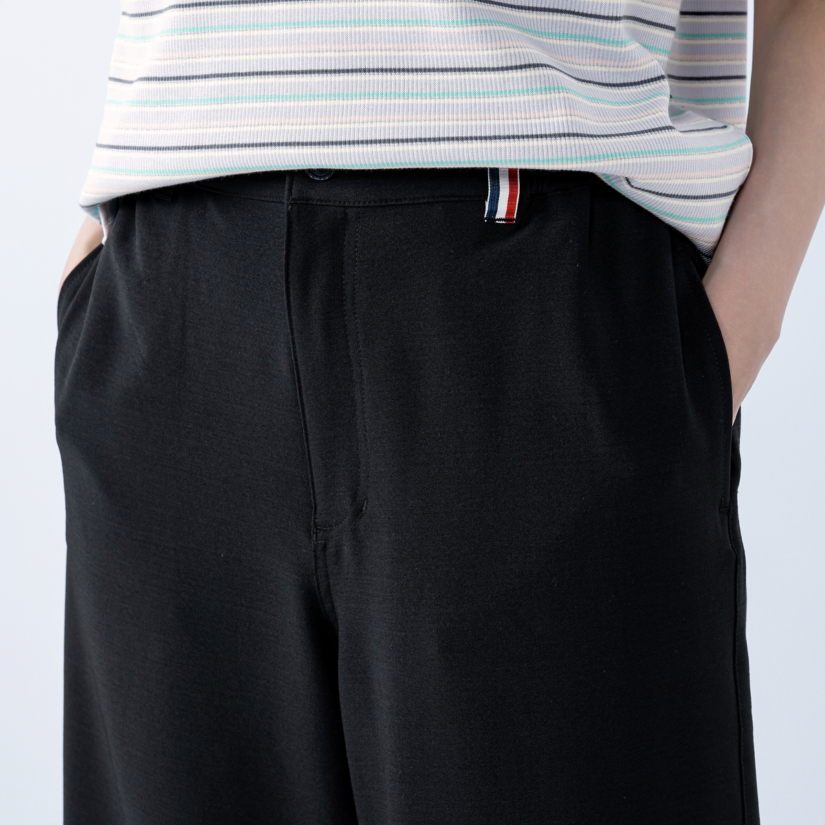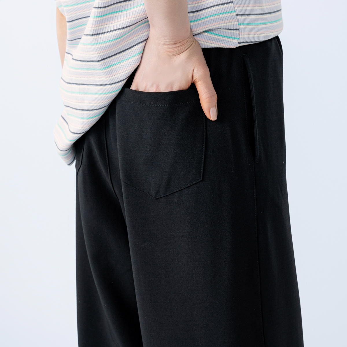 さらりとした落ち感のある合繊素材で仕立てたワイドストレートパンツです。裾のスピンドルで絞り具合を調整でき、気分やスタイルに合わせてシルエットを変えて楽しめます