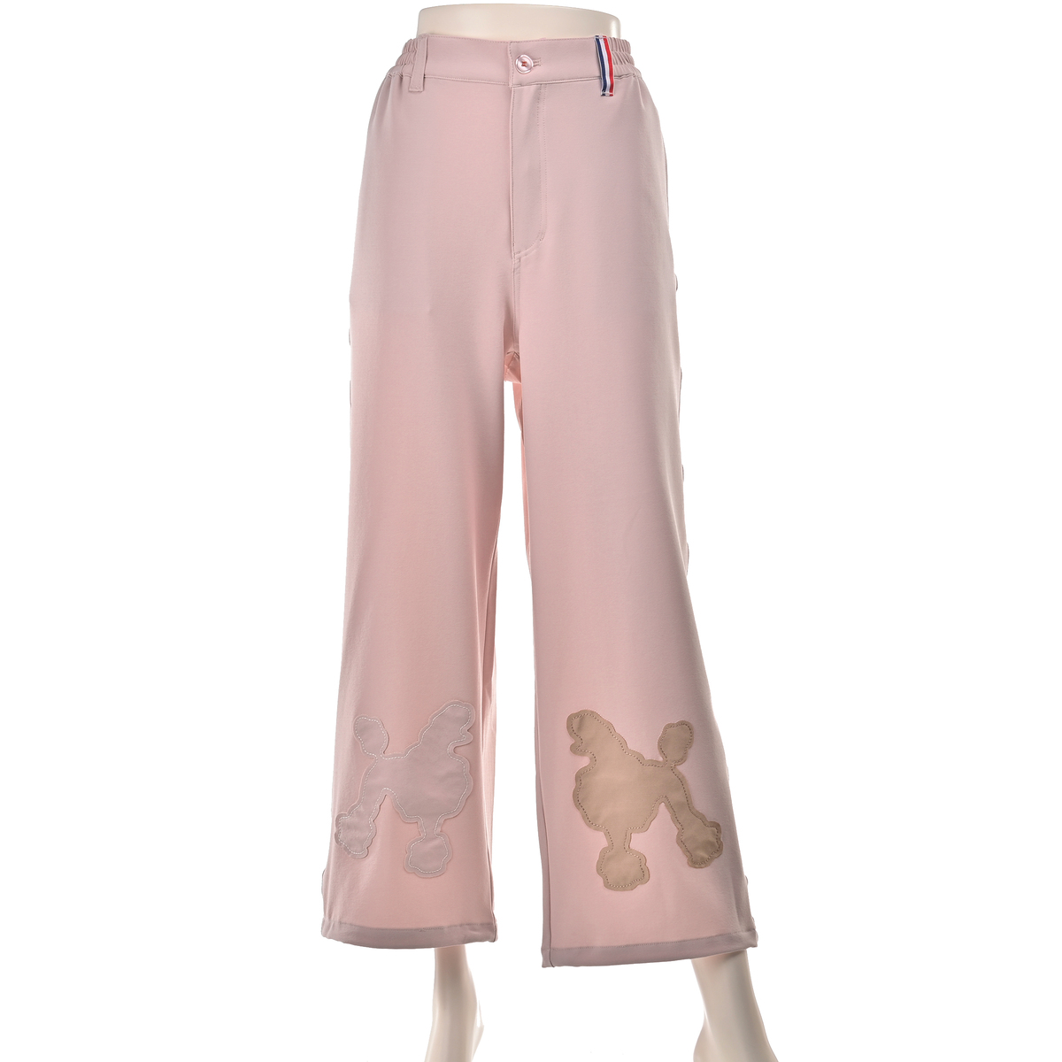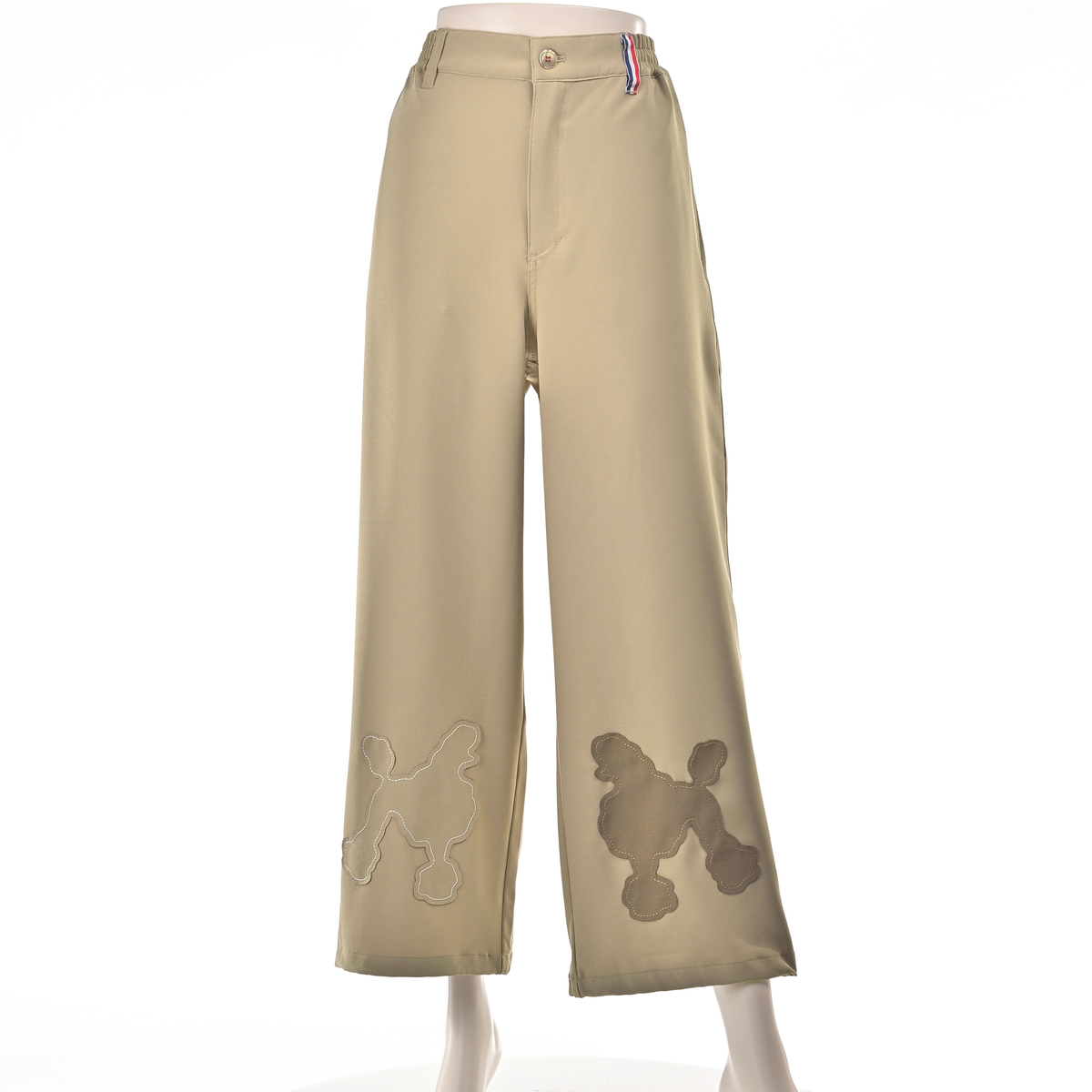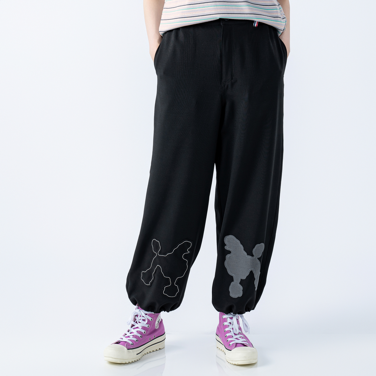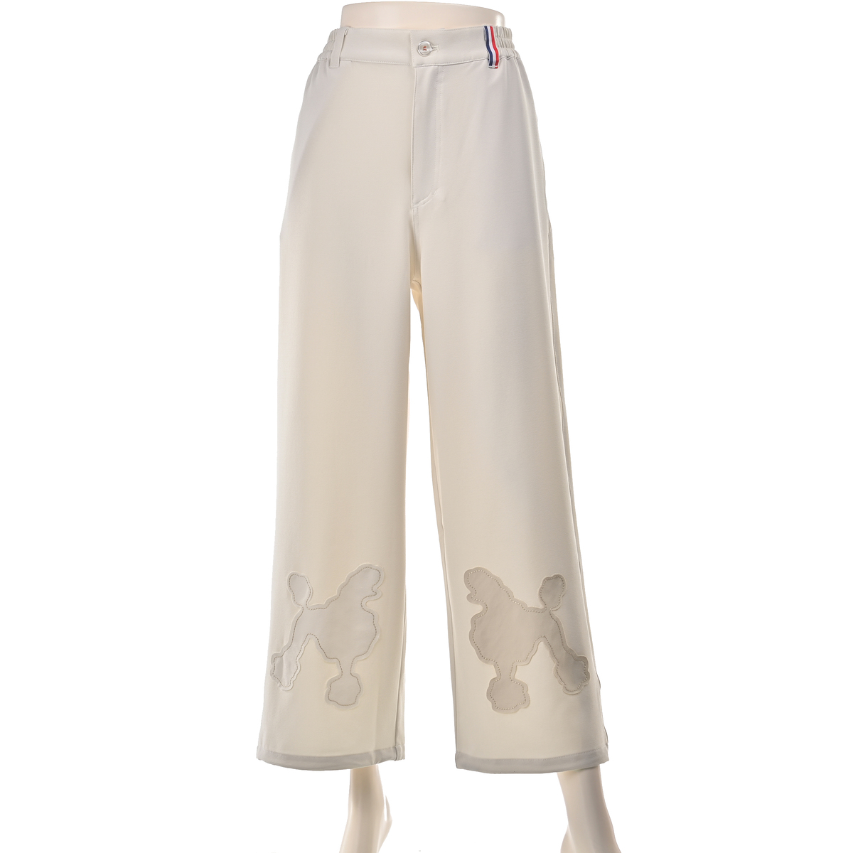 裾のプードルモチーフのアップリケが着こなしに遊び心を添えるデザイン。シンプルなトップスと合わせるだけで、さりげなく個性を演出します