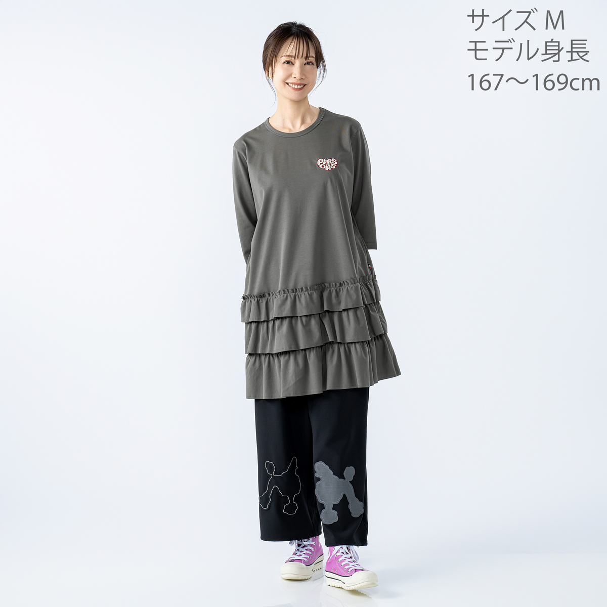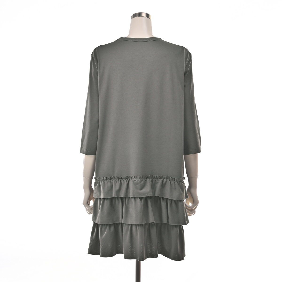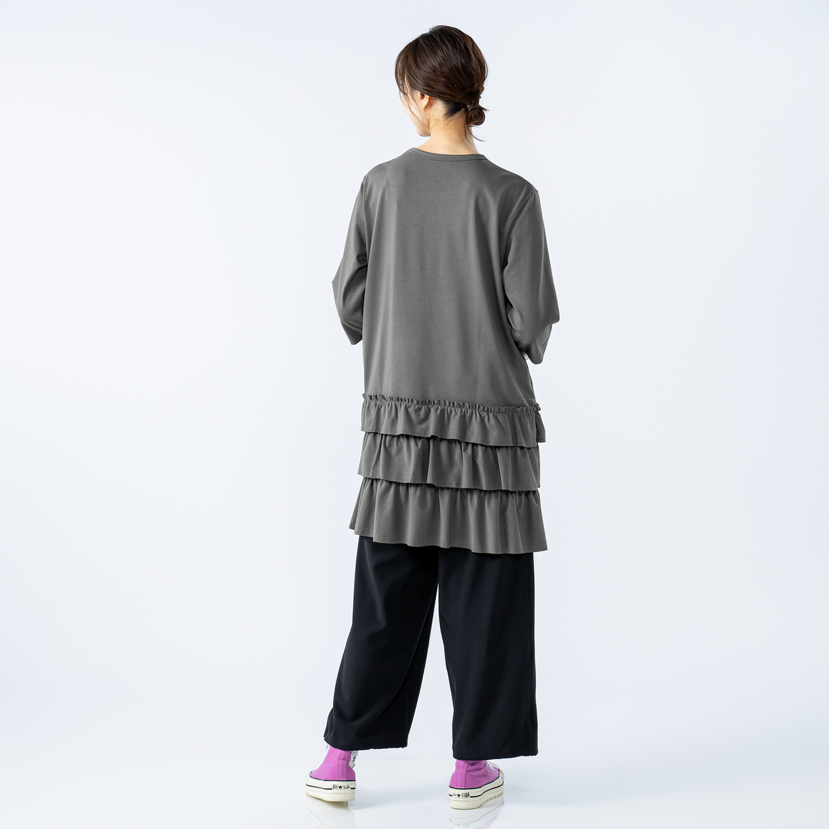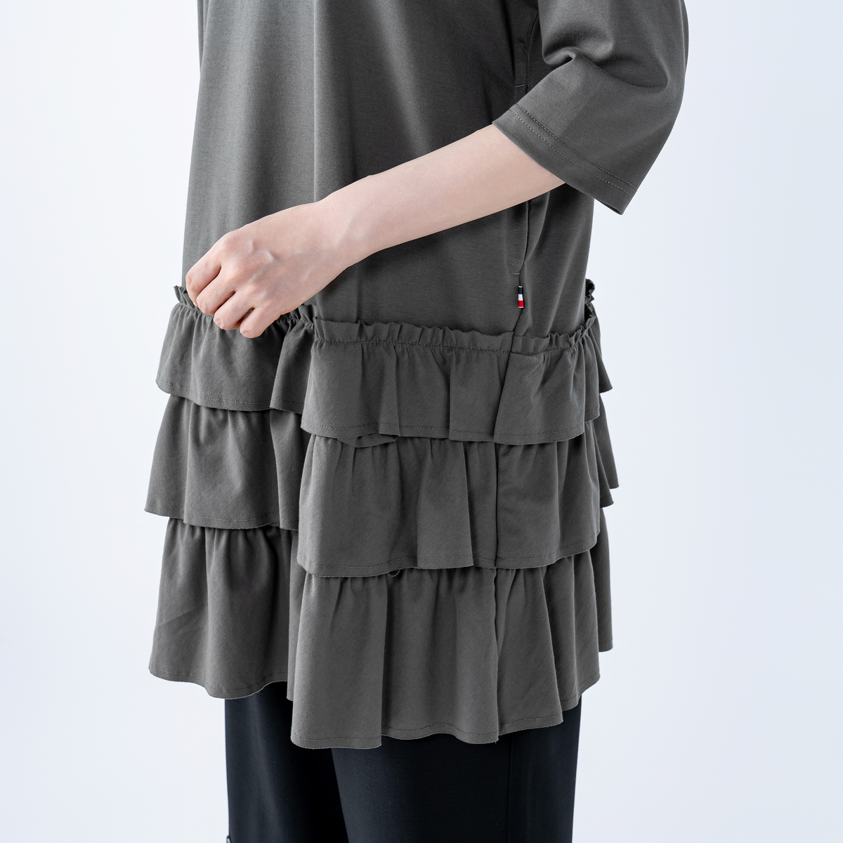 カットソー素材を使用した、ローウエスト切り替えのフリルチュニック。ゆったりとした着心地で、肩や身頃に無理なく沿う設計。7分丈の長めの袖丈が全体のバランスを整え、落ち着いた印象で着られます