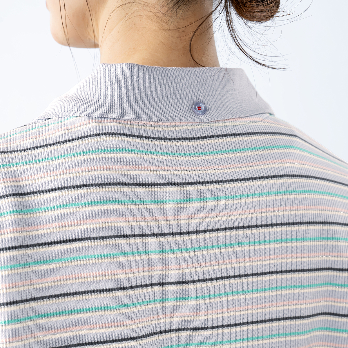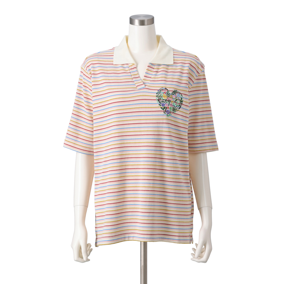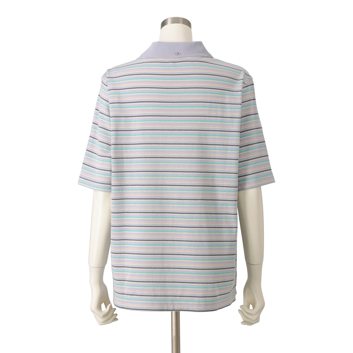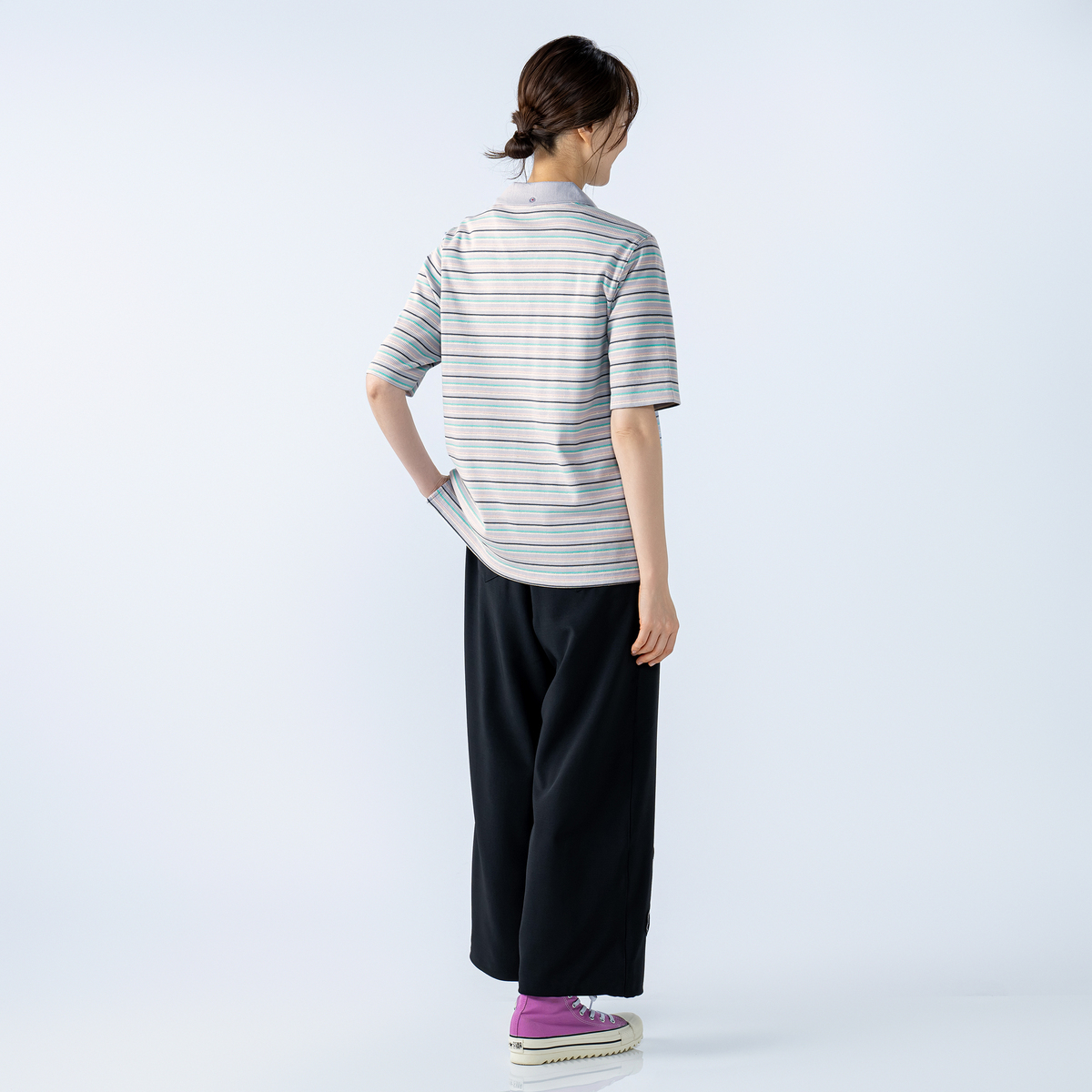 多色ボーダー柄のテレコ素材を使用した半袖トップスです。スキッパー衿が首元をすっきり見せ、ほどよくゆとりのあるシルエットがリラックス感をもたらします