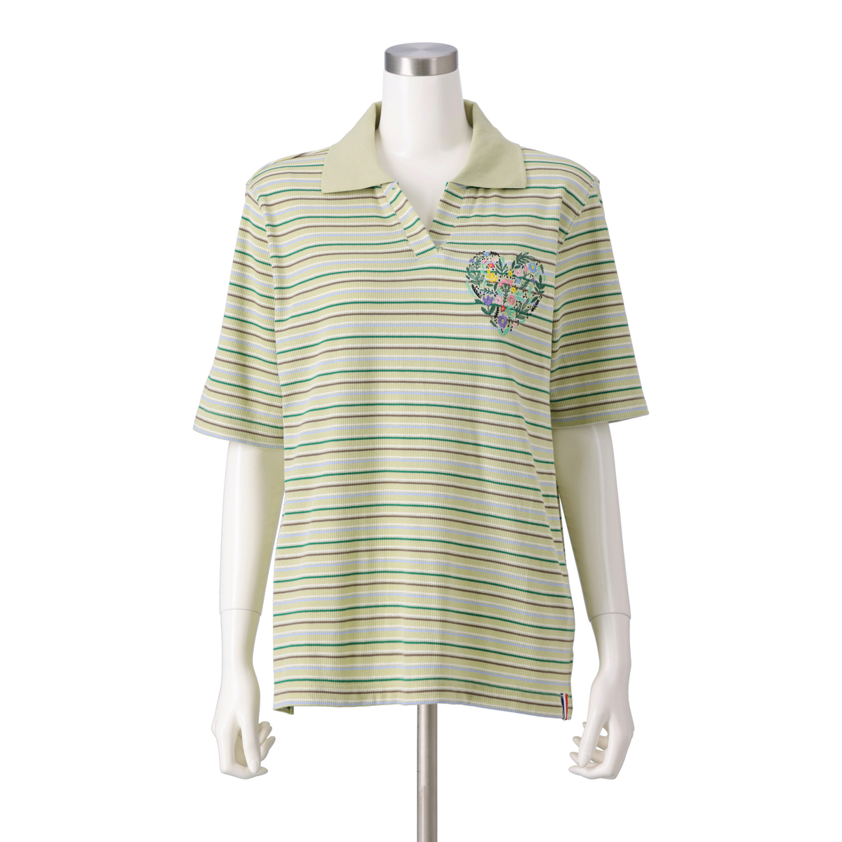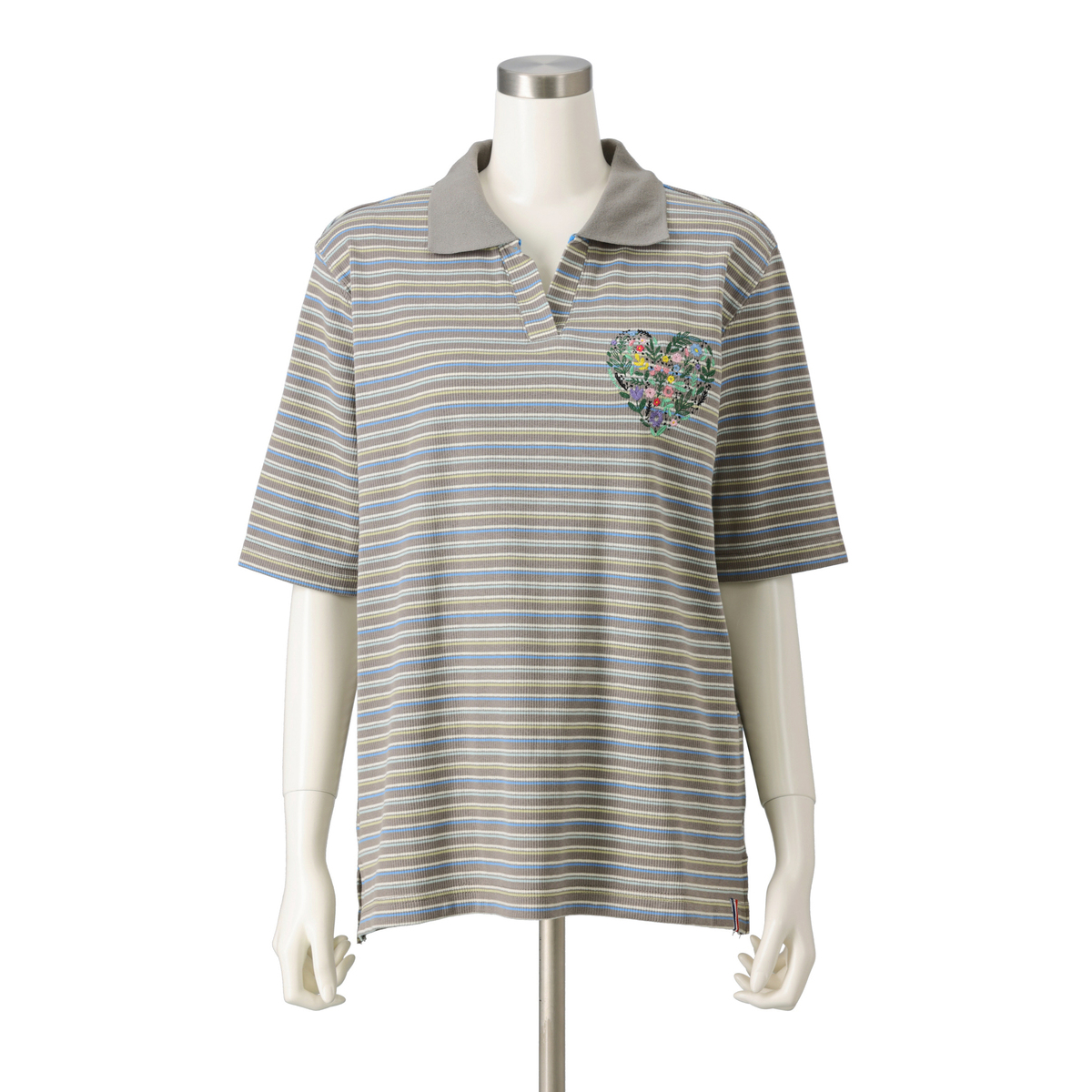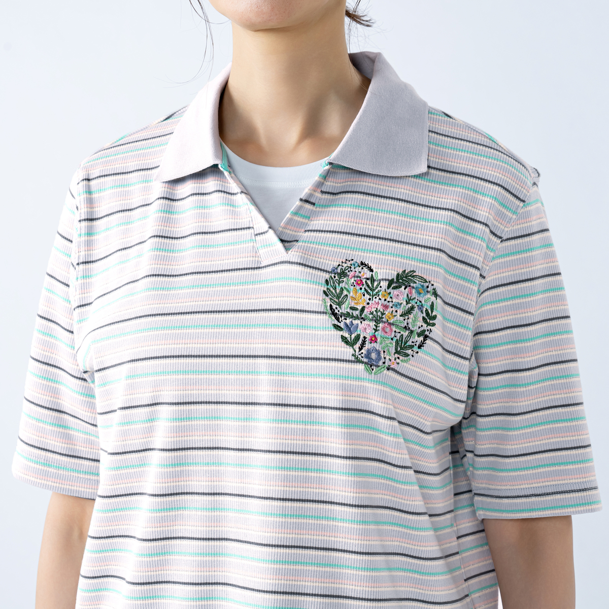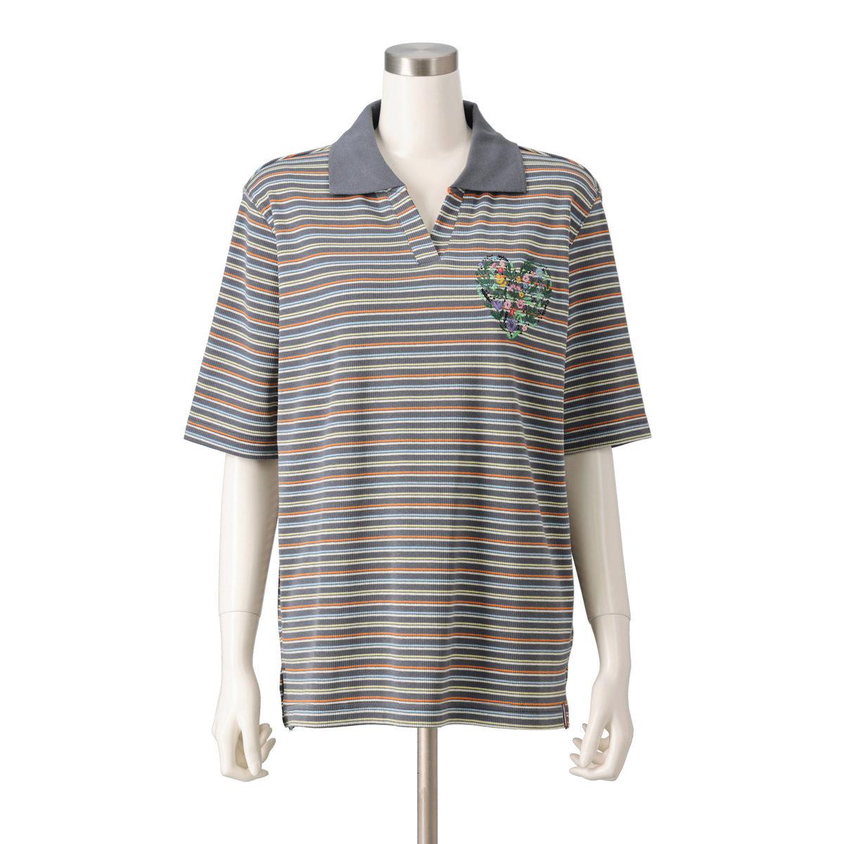 多色ボーダー柄のテレコ素材を使用した半袖トップスです。スキッパー衿が首元をすっきり見せ、ほどよくゆとりのあるシルエットがリラックス感をもたらします