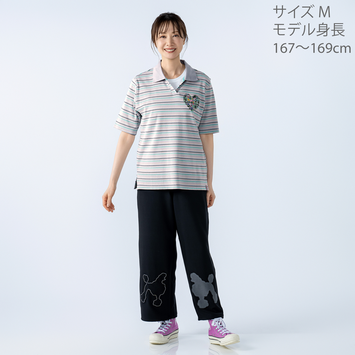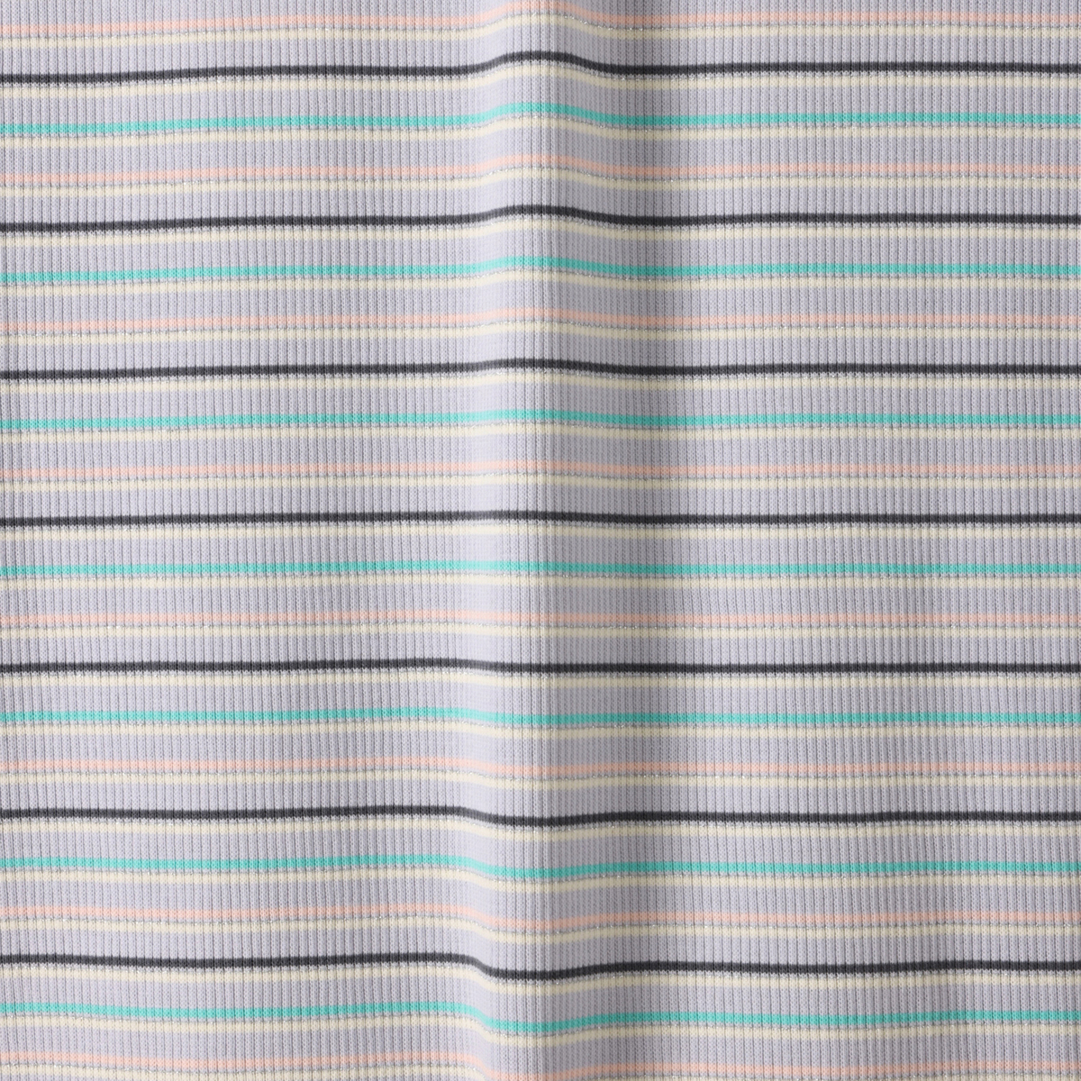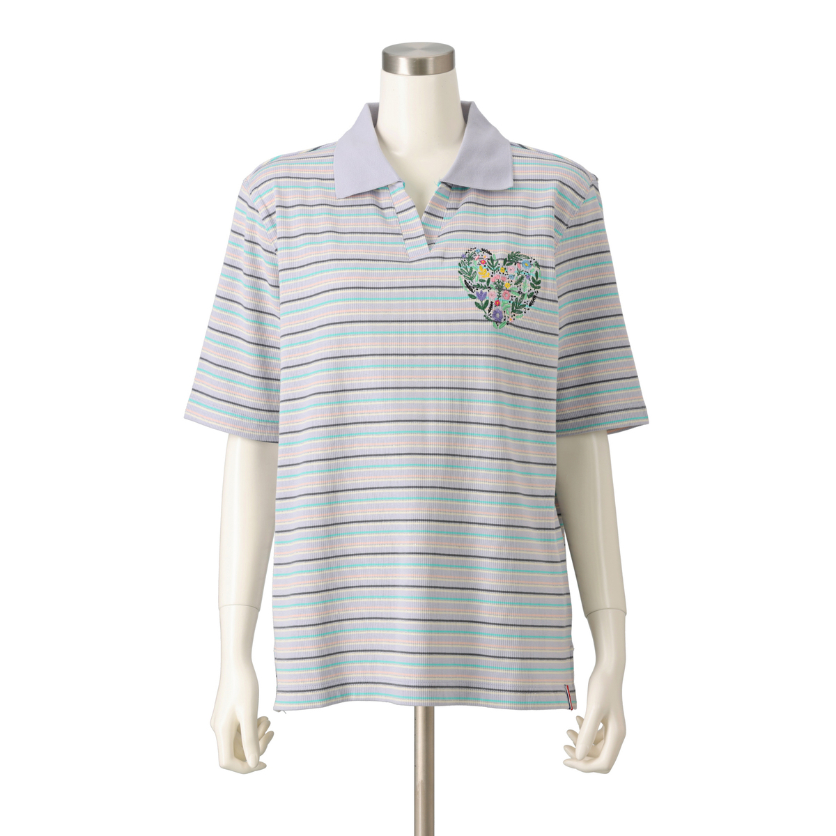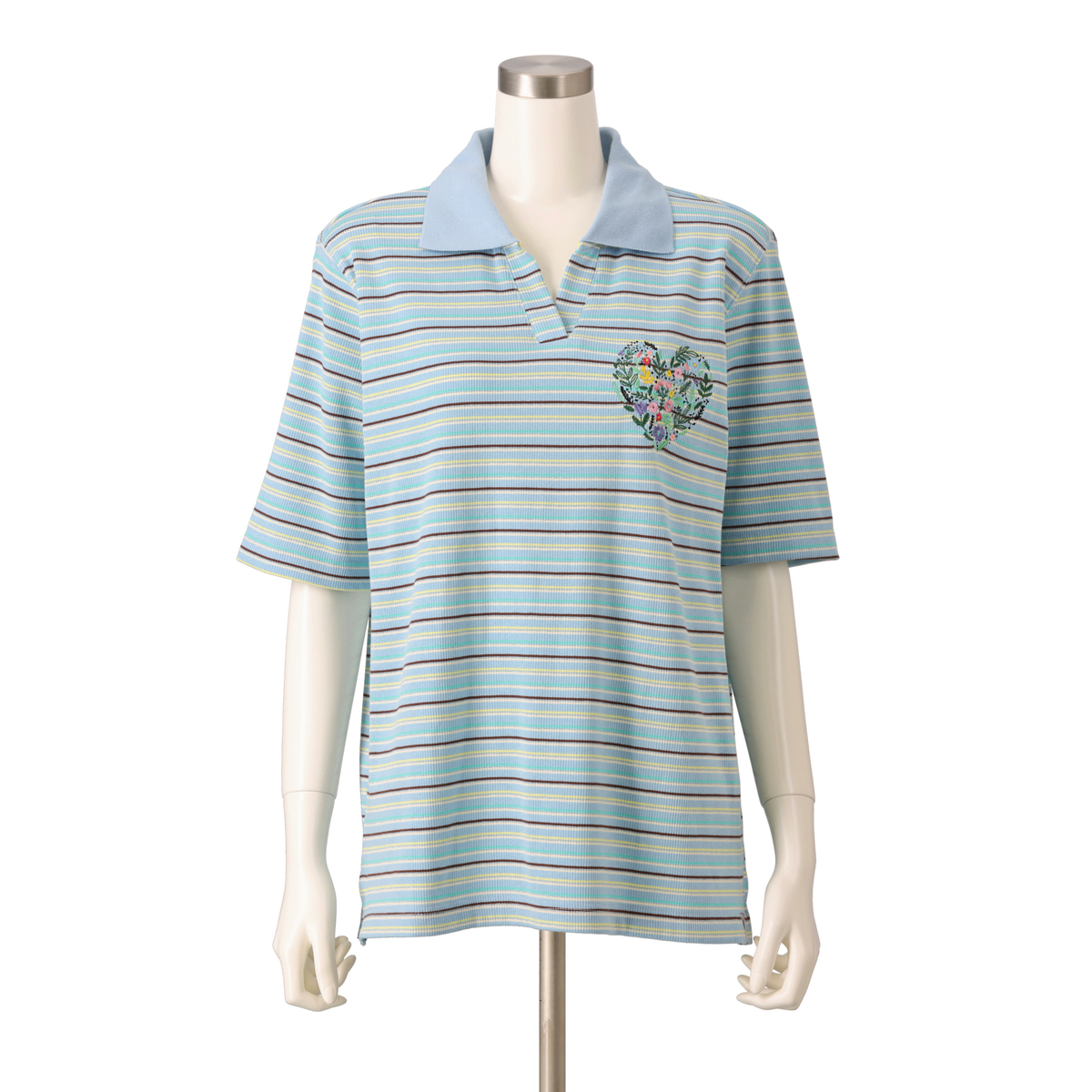 多色ボーダー柄のテレコ素材を使用した半袖トップスです。スキッパー衿が首元をすっきり見せ、ほどよくゆとりのあるシルエットがリラックス感をもたらします