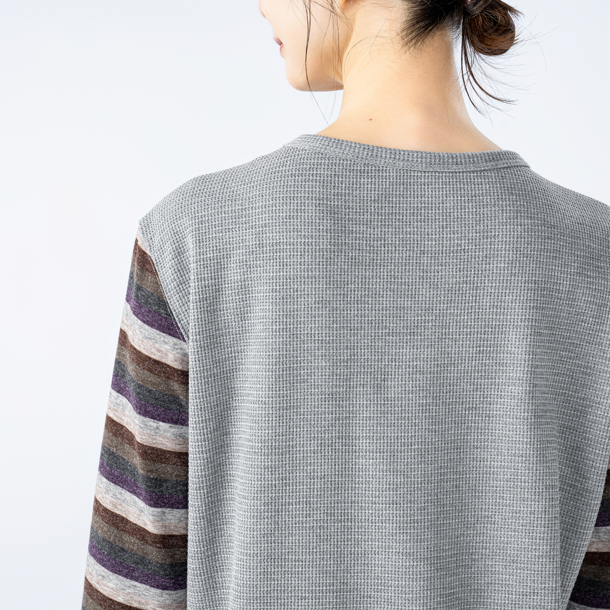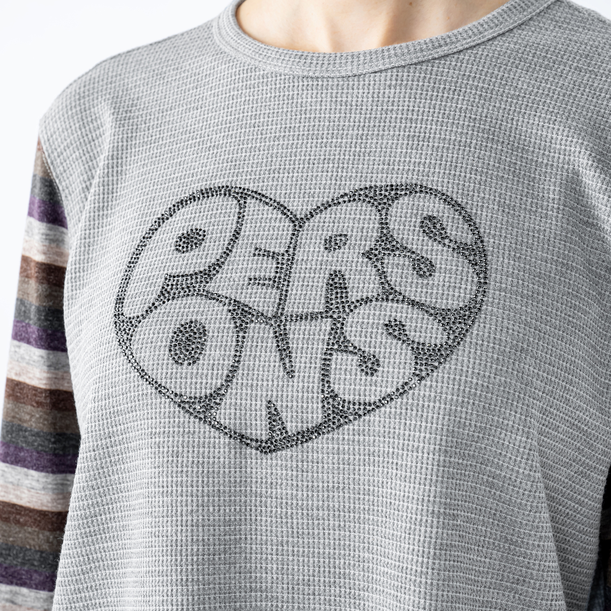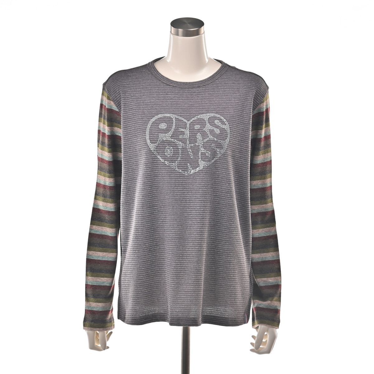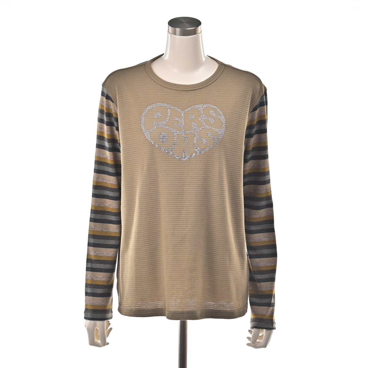 ワッフル素材と多色ボーダー柄のカットソーを組合せた長袖Tシャツです。異素材が着こなしに遊び心をプラスし、胸元のラインストーンのハートロゴが個性を引き立てます