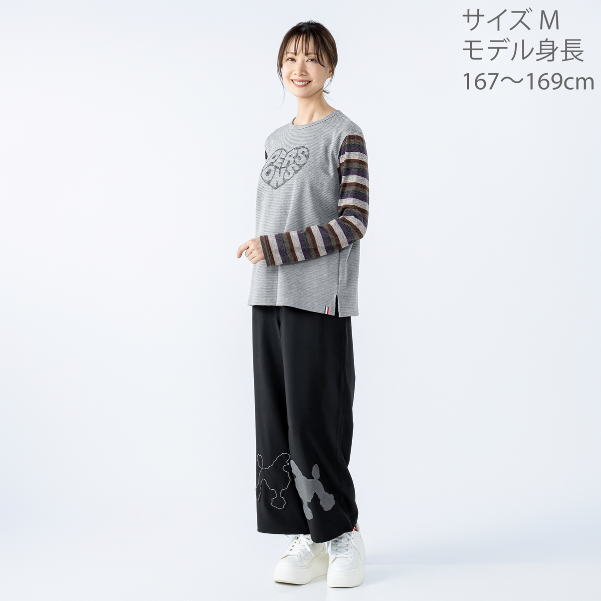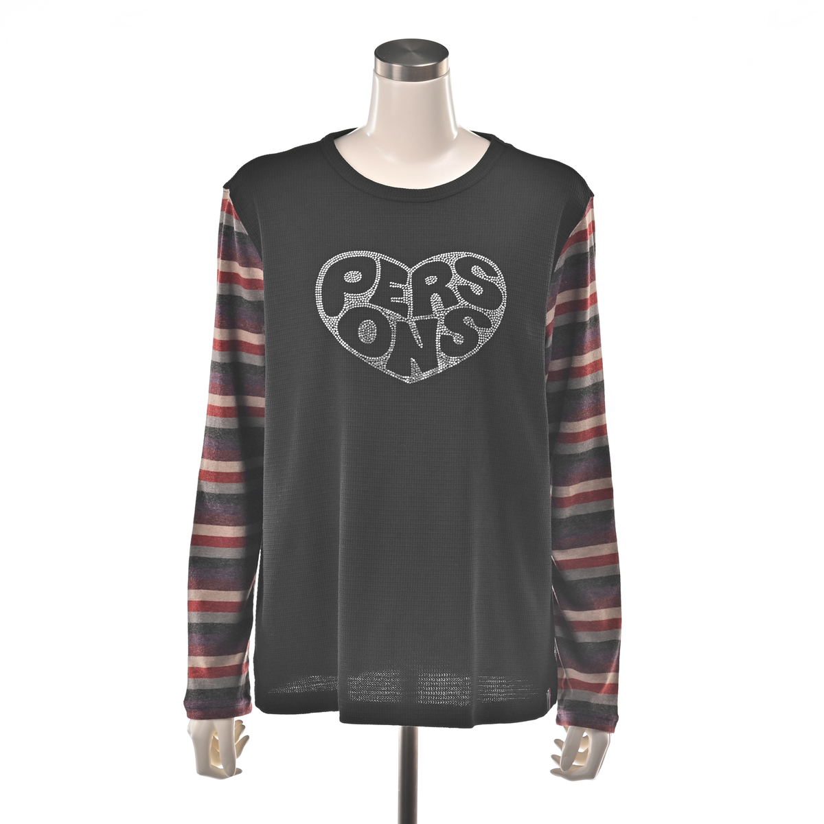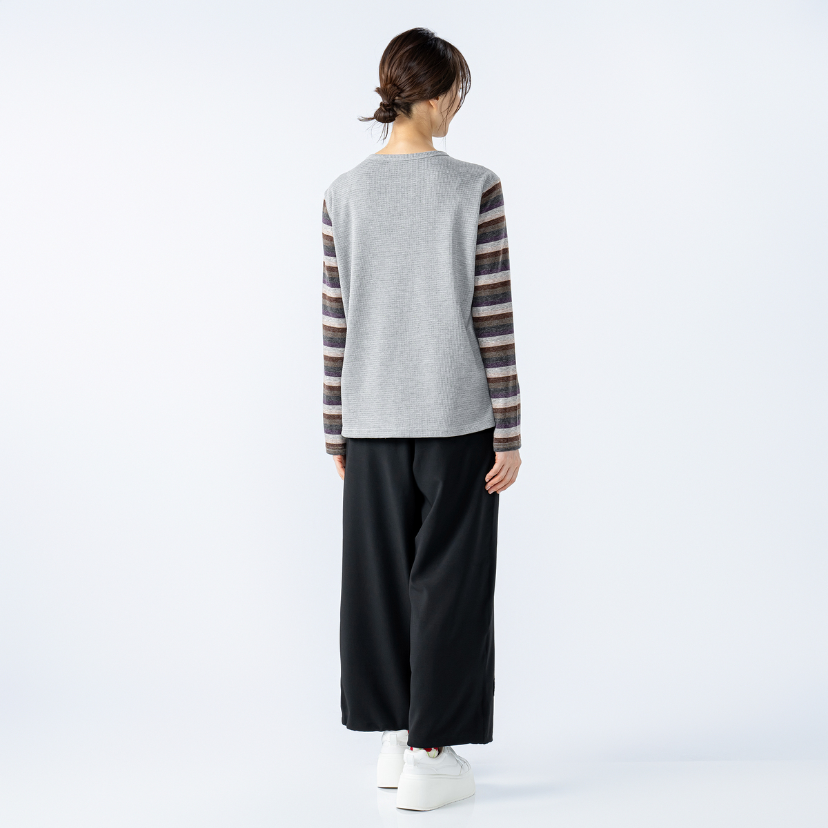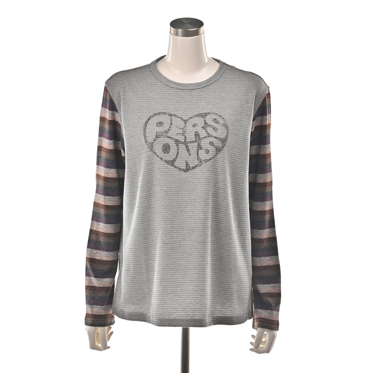 ワッフル素材と多色ボーダー柄のカットソーを組合せた長袖Tシャツです。異素材が着こなしに遊び心をプラスし、胸元のラインストーンのハートロゴが個性を引き立てます
