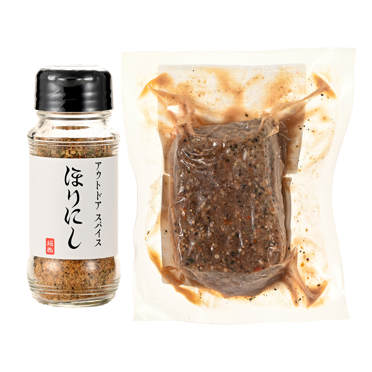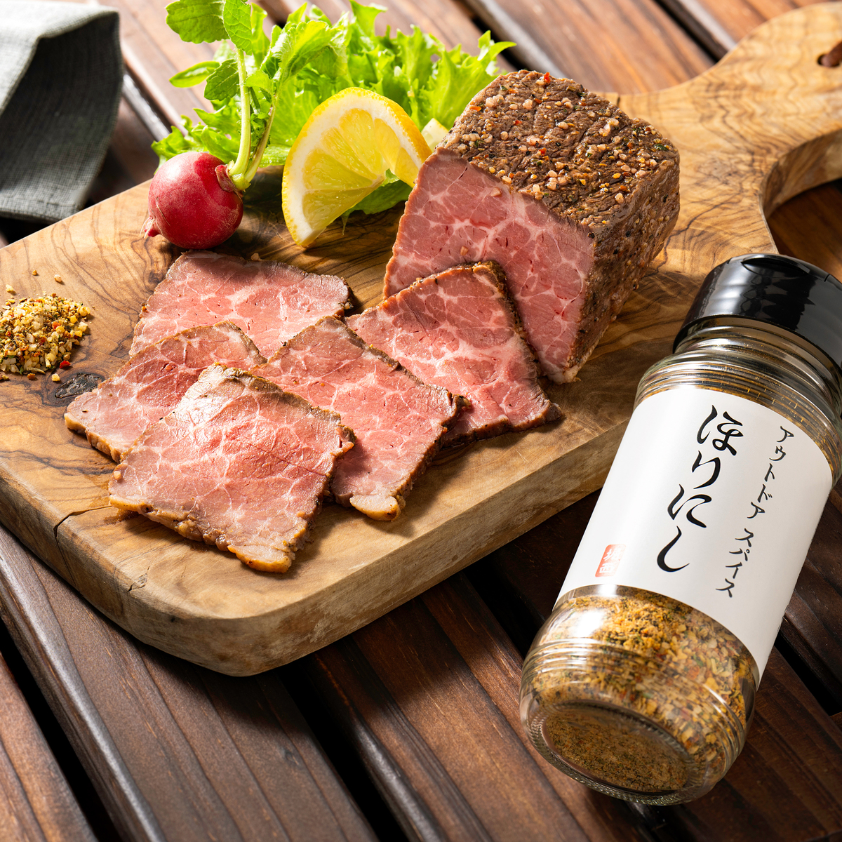 様々なスパイスや調味料を20種ほどブレンドし、独自配合した万能調味料“ほりにしアウトドアスパイス”と、肉本来の旨味を最大限に引き出したローストビーフをセットでお届けします