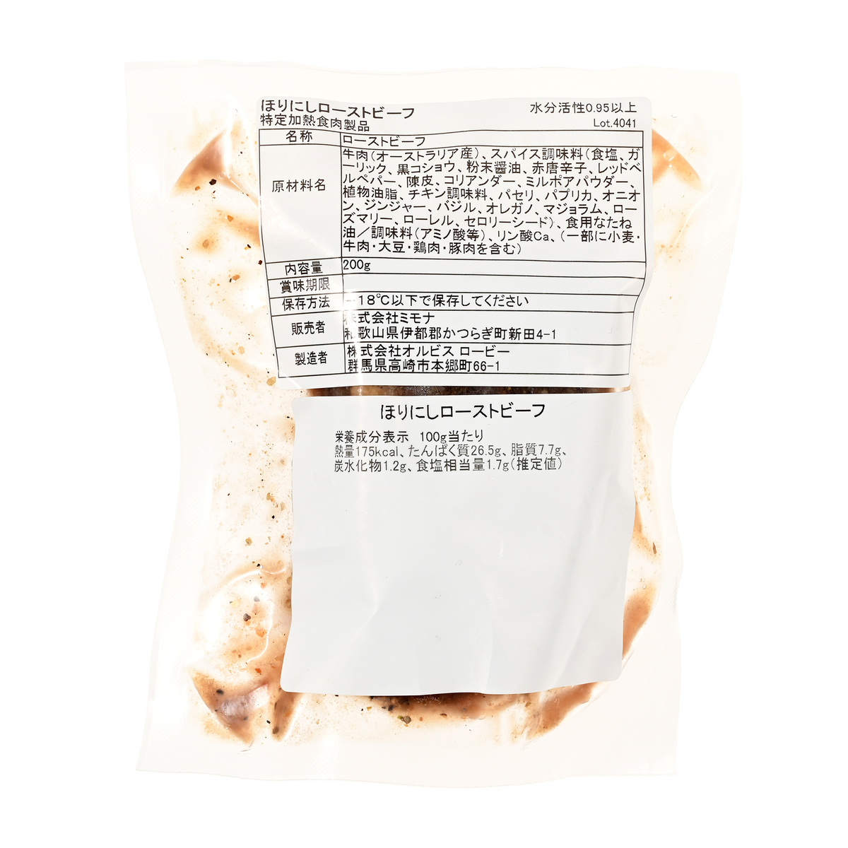 [アレルギー物質特定原材料8品目] 小麦 [商品内容] ・ローストビーフ 200g ・ほりにしアウトドアスパイス 100g [賞味期限] 出荷時点で賞味期限まで120日以上ある商品をお届けします [保存方法] <ほりにしローストビーフ> 開封前:冷凍(ー18℃以下)で保存してください 開封後:開封後はお早めにお召し上がりください <アウトドアスパイスほりにし> 開封前:直射日光、高温多湿を避けて保存してください 開封後:開封後はお早めにお召し上がりください [お召し上がり方] <解凍方法> 冷蔵庫(10℃) で12時間を目安に解凍して下さい <スライスの向き> 肉の繊維に対して垂直に切ると、繊維が断ちきられ柔らかい食感になります <スライスの厚さ> お肉の厚さは、3mm以下でスライスして下さい [注意事項] ※味付けしてありますが、ほりにしスパイスを振りかけると更に味が引き立ちます ※解凍後は、なるべくお早めにお召し上がり下さい ※お肉のドリップが少々出ますが、加熱調理をしてありますので安心してお召し上がり下さい [原料原産地] ローストビーフ:牛肉(オーストラリア産) アウトドアスパイス:食塩(国内製造、アメリカ製造、ドイツ製造) [原産国] 日本 [原材料] ■ほりにしローストビーフ:牛肉(オーストラリア産)、スパイス調味料(食塩、ガーリック、黒コショウ、粉末醤油、赤唐辛子、レッドベルペパー、陳皮、コリアンダー、ミルポアパウダー、植物油脂、チキン調味料、パセリ、パプリカ、オニオン、ジンジャー、バジル、オレガノ、マジョラム、ローズマリー、ローレル、セロリーシード)、食用なたね油/調味料(アミノ酸等)、リン酸Ca、(一部に小麦・牛肉・大豆・鶏肉・豚肉を含む) ■アウトドアスパイスほりにし:食塩(国内製造、アメリカ製造、ドイツ製造)、ガーリック、黒コショウ、粉末醤油、赤唐辛子、レッドベルぺパー、陳皮、コリアンダー、ミルポアパウダー、植物油脂、チキン調味料、パセリ、パプリカ、オニオン、ジンジャー、バジル、オレガノ、マジョラム、ローズマリー、ローレル、セロリーシード/調味料(アミノ酸等)、リン酸Ca、(一部に小麦・大豆・鶏肉・豚肉を含む)