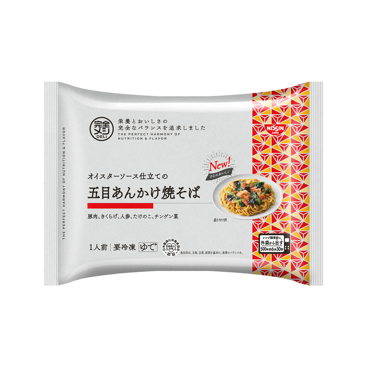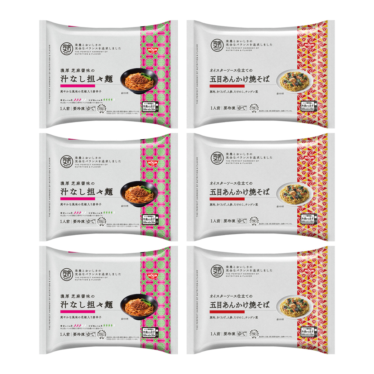 [アレルギー物質特定原材料8品目] 卵、小麦、乳 [セット内容] ・冷凍 完全メシ DELI 五目あんかけ焼そば 1食(350g)×3食 ・冷凍 完全メシ DELI 汁なし担々麺 1食(350g)×3食 [賞味期限] 出荷時点で賞味期限まで120日以上ある商品をお届けします [保存方法] 開封前:冷凍(ー18℃以下)で保存してください 開封後:お早めにお召し上がりください [お召し上がり方] 加熱してお召し上がりください 調理方法: 外袋から出して内袋のままお皿にのせて調理 1、外袋から取り出す 内袋(具付めん)を外袋から取り出してください 2、電子レンジで加熱する ※凍ったまま、内袋のまま、表示面が上 内袋(具付めん)を表示面を上にしてお皿にのせ、電子レンジで加熱してください 調理時間の目安: 500W:約6分30秒 600W:約6分 ・調理時間は機種により多少異なります ※冷たい場合は10秒ずつ再加熱してください ※内袋から出した場合は軽くラップをしてください 3、お皿に移す やけどに気をつけてお皿ごと取り出し、袋の端をもって破り、お皿に移してよくまぜてからお召し上がりください [注意事項] ※一度とけたものを再冷凍しないでください。品質が変わることがあります。 ※本品製造工場では、えび、かにを含む製品を製造しております。 ※調理時間は機種により多少異なります ※調理不良の原因になりますので、必要以上に加熱しないでください ※加熱後、電子レンジから取り出す際は、内容物が熱くなっておりますのでやけどにご注意ください [原料原産地] 小麦粉(国内製造) [原産国] 日本 [原材料] 冷凍完全メシDELI 五目あんかけ焼そば3食: めん〔小麦粉(国内製造)、卵粉、植物油脂/かんすい、クチナシ色素〕、野菜(チンゲン菜、にんじん)、たけのこ水煮、味付豚肉、きくらげ、植物油脂、コラーゲンペプチド、しょうゆ、砂糖、豚脂、食物繊維、オイスターソース、チキン調味料、野菜エキス、きざみにんにく、しょうが調味料、香辛料、たん白加水分解物、酵母、 納豆菌エキス入り食用油脂/増粘剤(加工でん粉)、調味料(アミノ酸等)、香料、塩化K、リン酸塩(Ca、Na)、塩化Mg、V.C、ピロリン酸鉄、酸化防止剤(V.E)、V.A、ナイアシン、V.E、V.D、パントテン酸Ca、V.B6、V.B12、香辛料抽出物、V.B1、V.B2、葉酸、(一部に小麦・卵・乳成分・ごま・大豆・鶏肉・豚肉・ゼラチンを含む) 冷凍完全メシDELI 汁なし担々麺3食: めん〔小麦粉(国内製造)、小麦たん白、卵粉/乳酸K、かんすい、クチナシ色素〕、野菜(チンゲン菜、ねぎ)、植物油脂、砂糖、豚肉、ねりごま、しょうゆ、食物繊維、粒状大豆たん白、コラーゲンペプチド、カシューナッツ、ポークエキス、ザーサイ、しょうが調味料、食塩、ごま、ガーリック調味料、香辛料、花椒調味料、酵母、 納豆菌エキス入り食用油脂/調味料(アミノ酸等)、増粘剤(加工でん粉、グァーガム)、塩化K、リン酸Ca、塩化Mg、香料、酸味料、パプリカ色素、V.C、カラメル色素、甘味料(キシロース)、香辛料抽出物、ピロリン酸鉄、V.A、V.E、ナイアシン、V.D、V.B12、パントテン酸Ca、V.B6、V.B2、V.B1、葉酸、〔花椒入り唐辛子(花椒、唐辛子、花椒調味料)〕、(一部に小麦・卵・カシューナッツ・ごま・大豆・豚肉・ゼラチンを含む)