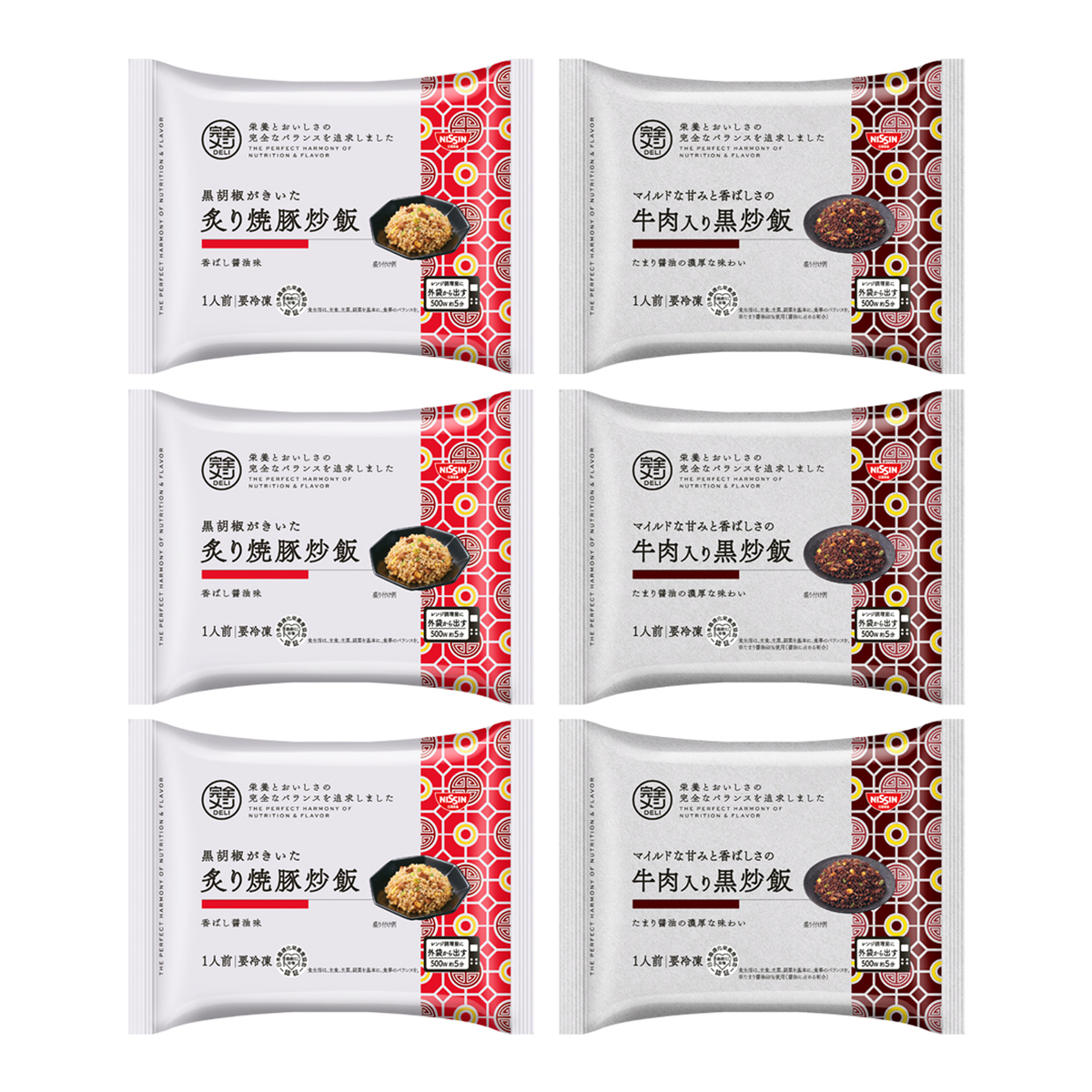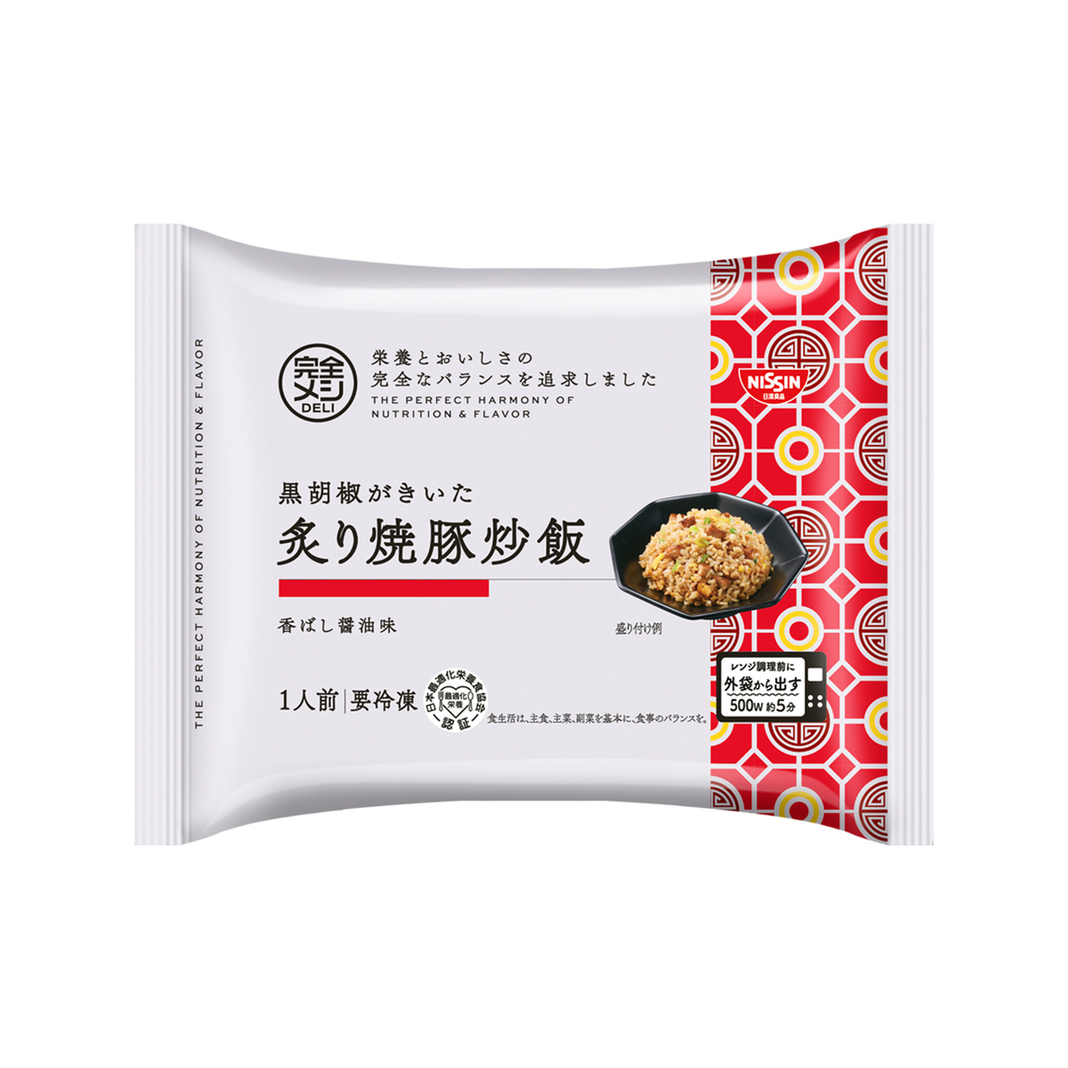 [アレルギー物質特定原材料8品目] 卵、小麦、乳 [セット内容] ・冷凍 完全メシ DELI 炙り焼豚炒飯 1食(290g)×3食 ・冷凍 完全メシ DELI 牛肉入り黒炒飯 1食(290g)×3食 [賞味期限] 出荷時点で賞味期限まで120日以上ある商品をお届けします [保存方法] 開封前:冷凍(ー18℃以下)で保存してください 開封後:お早めにお召し上がりください [お召し上がり方] 加熱してお召し上がりください ・調理方法:外袋から出してお皿に移して調理 1、外袋から取り出す 凍ったままの商品を袋からお皿に出してください 2、平らに盛る 3、電子レンジで加熱する 調理時間の目安 500W:約5分 600W:約4分30秒 ※ラップをかけずに電子レンジで加熱してください ※冷たい場合は10秒ずつ再加熱してください ※調理時間は機種により多少異なります [注意事項] ※調理時間は機種により多少異なります ※調理不良の原因になりますので、必要以上に加熱しないでください ※加熱後、電子レンジから取り出す際は、内容物が熱くなっておりますのでやけどにご注意ください <炙り焼豚炒飯> ※製品中の黒い粒は香辛料です ※製法上、米や具材に焦げがみられることがあります <牛肉入り黒炒飯> ※製法上、ごはんや具材に焦げがみられることがあります [原料原産地] 米(国産) [原産国] 日本 [原材料] 冷凍完全メシDELI 炙り焼豚炒飯 3食:米(国産)、鶏卵、ねぎ、粒状大豆たん白、焼豚、発酵調味料、食物繊維、コラーゲンペプチド、卵粉、食塩、砂糖、粉末しょうゆ、香辛料、なたね油、たん白加水分解物、酵母、納豆菌エキス入り食用油脂、いため油(なたね油、大豆油、豚脂)/トレハロース、塩化K、調味料(アミノ酸等)、 リン酸Ca、pH調整剤、酸化Mg、乳化剤、V.C、カラメル色素、リン酸Na、酸化防止剤(V.E)、パプリカ色素、ピロリン酸鉄、V.A、V.E、ナイアシン、V.D、パントテン酸Ca、V.B12、V.B6、V.B2、香辛料抽出物、V.B1、葉酸、(一部に小麦・卵・大豆・豚肉・ゼラチンを含む) 冷凍完全メシDELI 牛肉入り黒炒飯 3食:米(国産)、鶏卵、野菜(ミズクワイ、ねぎ)、しょうゆ、味付牛肉、粒状大豆たん白、ソテーオニオン、食物繊維、コラーゲンペプチド、卵粉、牛脂、オニオン調味料、砂糖、なたね油、食塩、たん白加水分解物、香辛料、酵母、納豆菌エキス入り食用油脂、いため油(なたね油、大豆油)/カラメル色素、トレハロース、塩化K、調味料(アミノ酸)、 リン酸Ca、乳化剤、pH調整剤、酸化Mg、V.C、香辛料抽出物、リン酸Na、酸味料、パプリカ色素、ピロリン酸鉄、V.A、酸化防止剤(V.E)、V.E、ナイアシン、V.D、V.B12、パントテン酸Ca、V.B6、V.B2、V.B1、葉酸、(一部に小麦・卵・乳成分・牛肉・大豆・ゼラチンを含む)