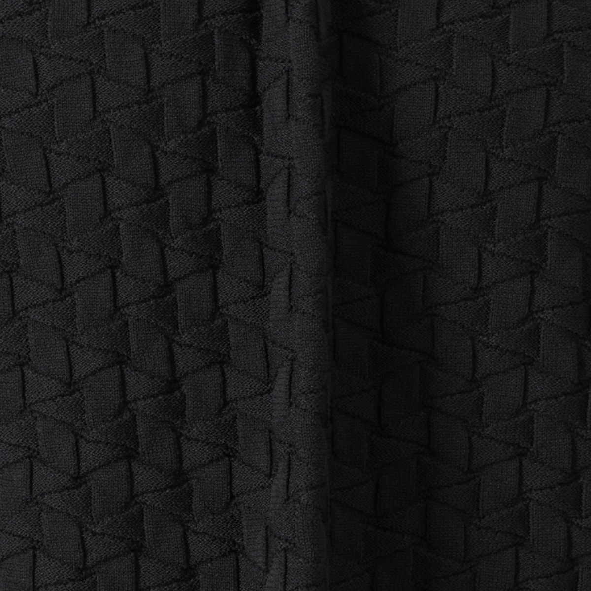 膨らみのあるポリエステルの糸を変形菱形柄に編み立てた目を惹くデザイン。編み物特有の素材感や柔らかな雰囲気で品ある大人らしさに。ゆったりめで着用しやすいリラックスシルエットを採用しました