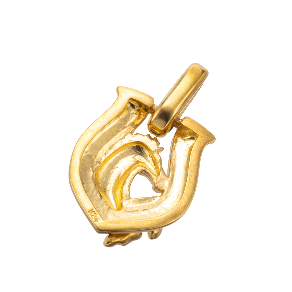 馬と馬蹄をデザインした純金のペンダントヘッドです。馬は「行動力」「成功」「出世」「名誉」「スピード」「勝利」などの象徴として知られ、馬蹄は西洋では幸運のお守りとされています