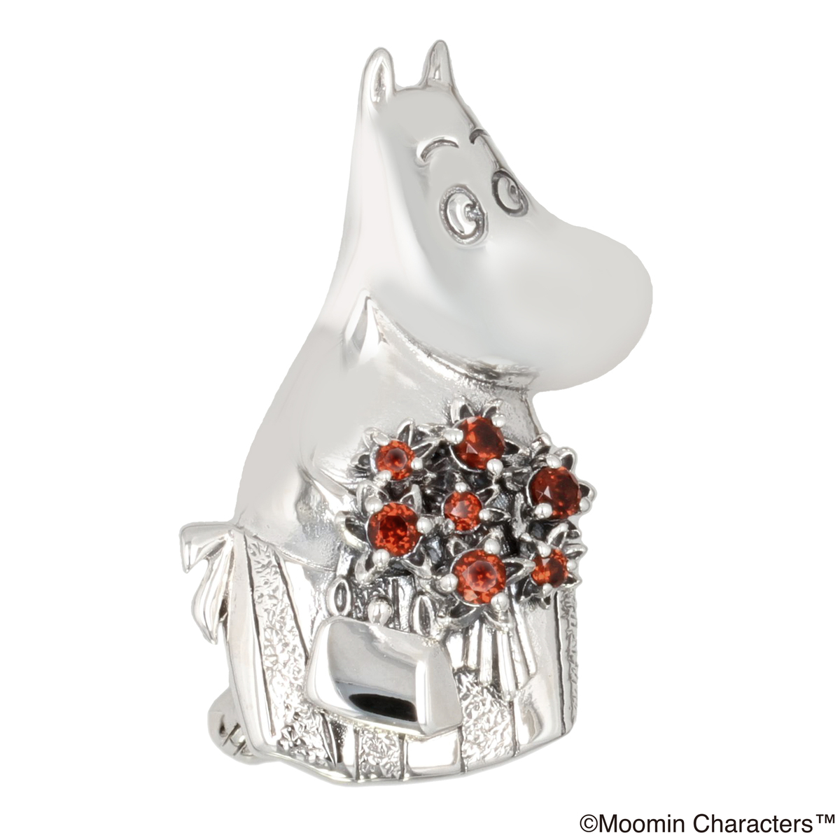 ムーミンママが大きな赤い花束を抱えた姿をデザインしたシルバー925のブローチ。あまり物事に動じることがないムーミンママの驚きの表情が可愛らしいデザインです