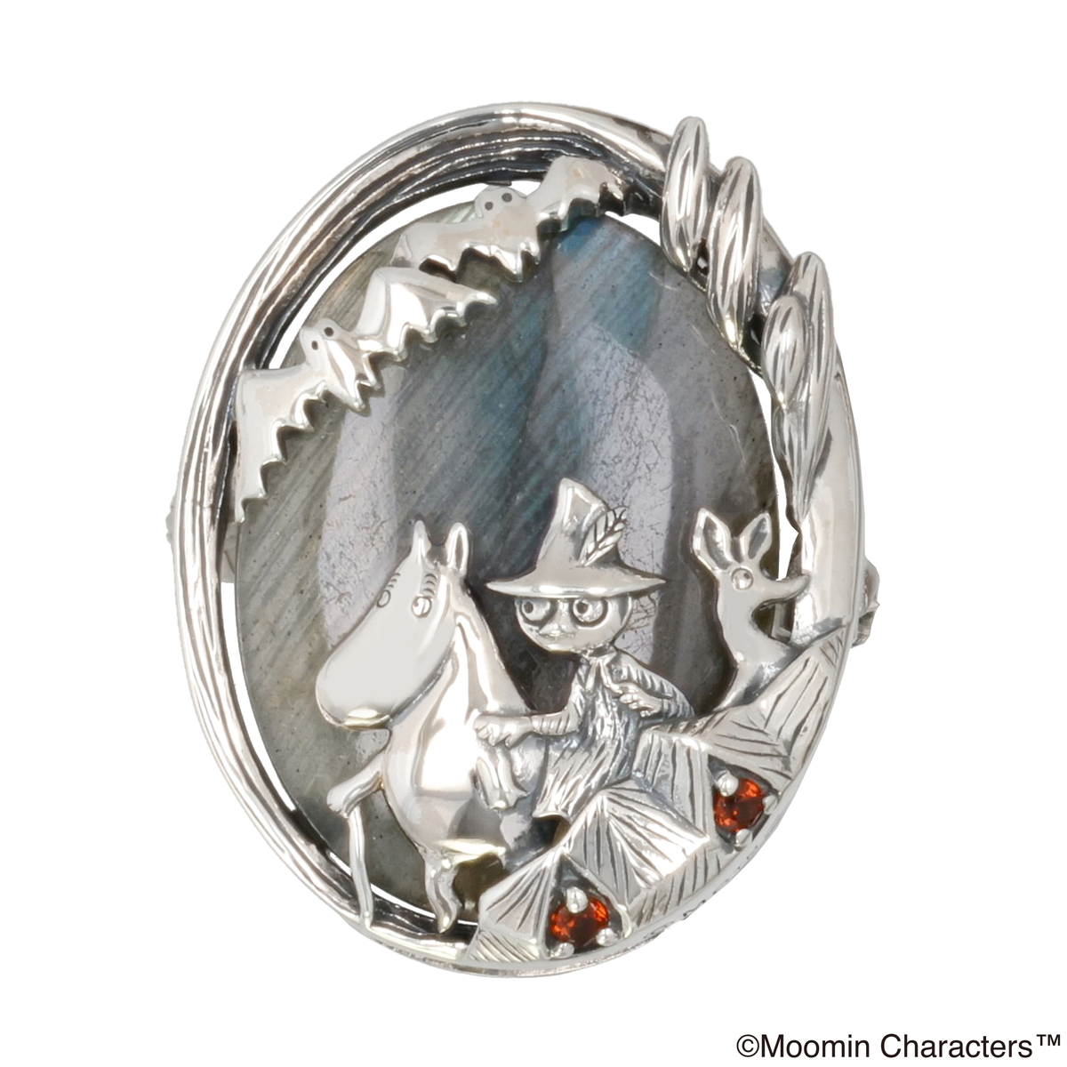 スナフキンからガーネットのある谷間へ行こうと散歩に誘われて、ごつごつとした岩ととげのある茂みの間をゆっくり進んでいく3人の様子を、繊細な作りと神秘的にキラめく大振りのフェルスパーで表現しました
