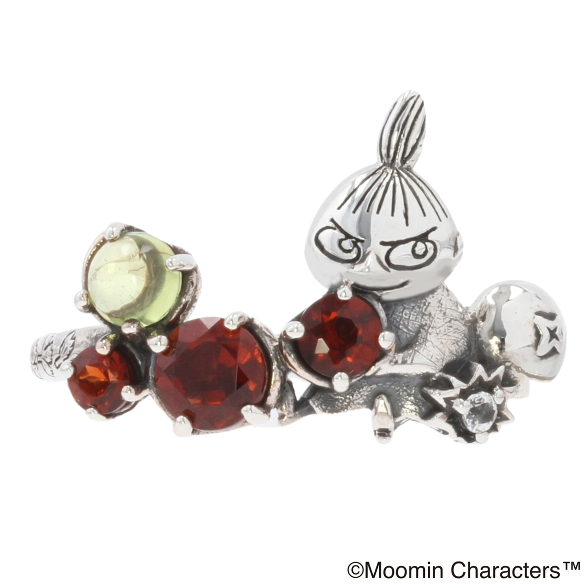赤く熟したコケモモにはカボションのガーネット、まだ熟していない実にはカボションのペリドットを使い、つやつやのおいしそうなコケモモに仕立てたデザイン。いっぱいのコケモモに埋もれるリトルミイをお手元でお楽しみください