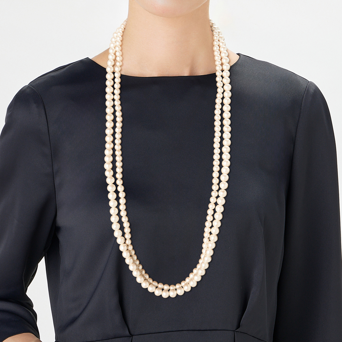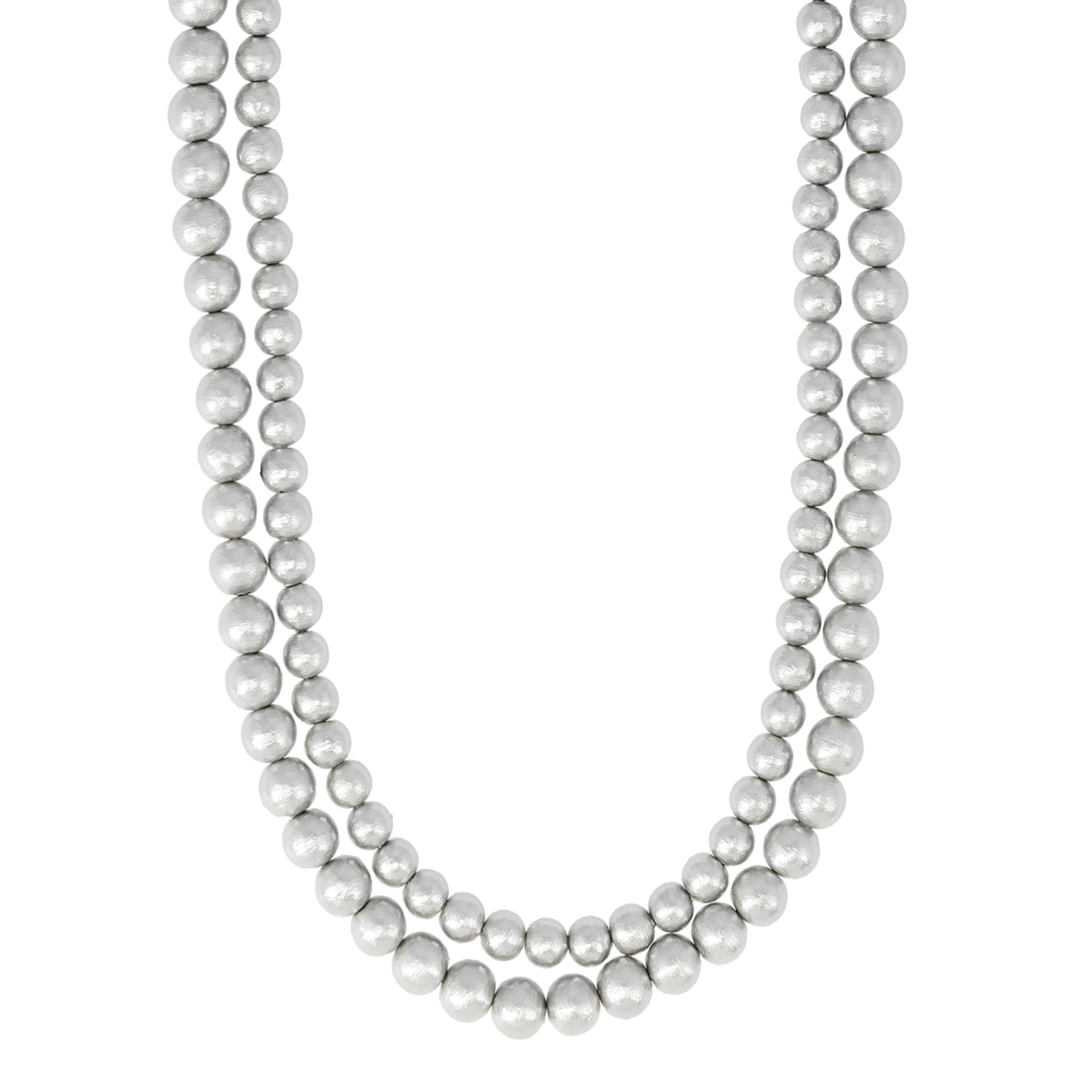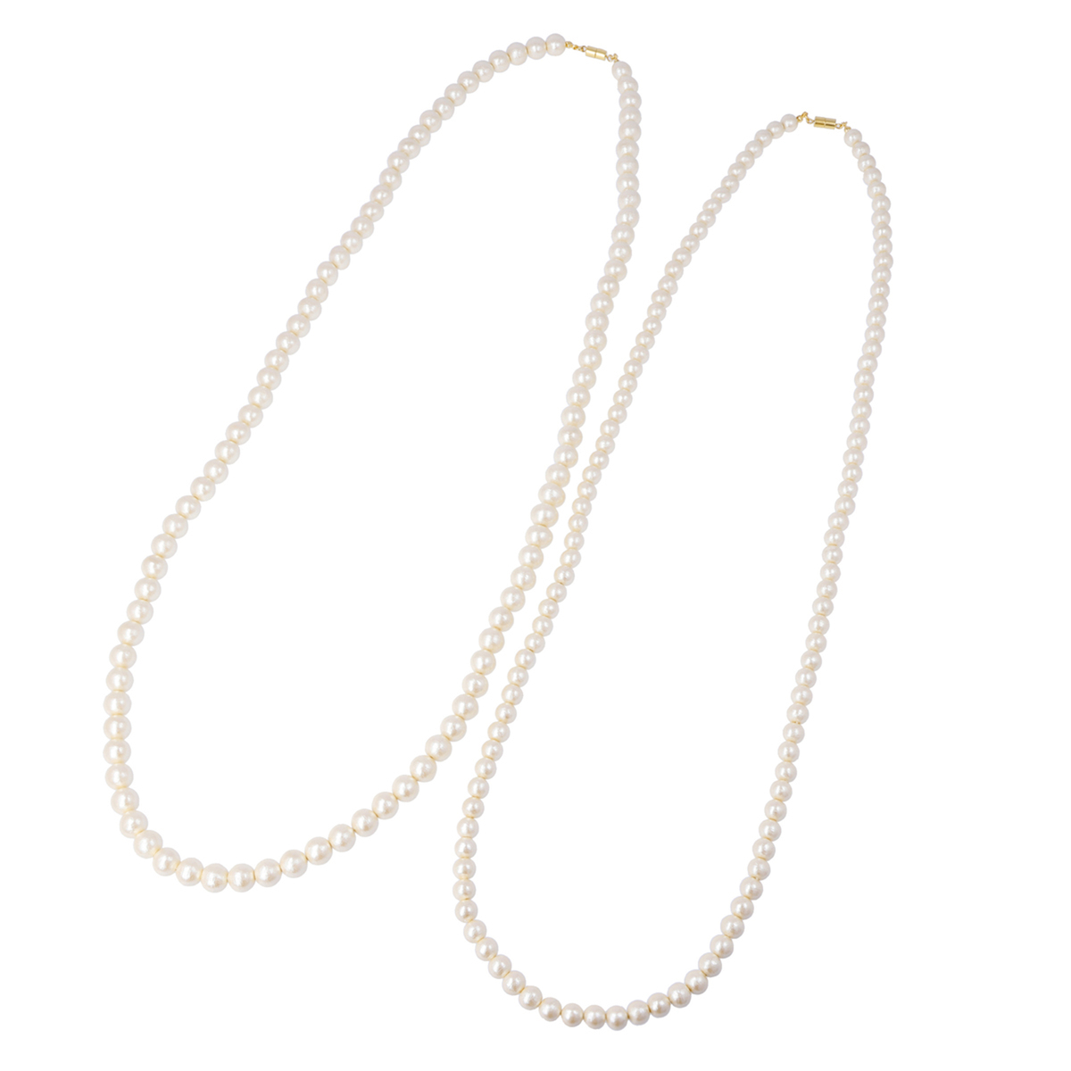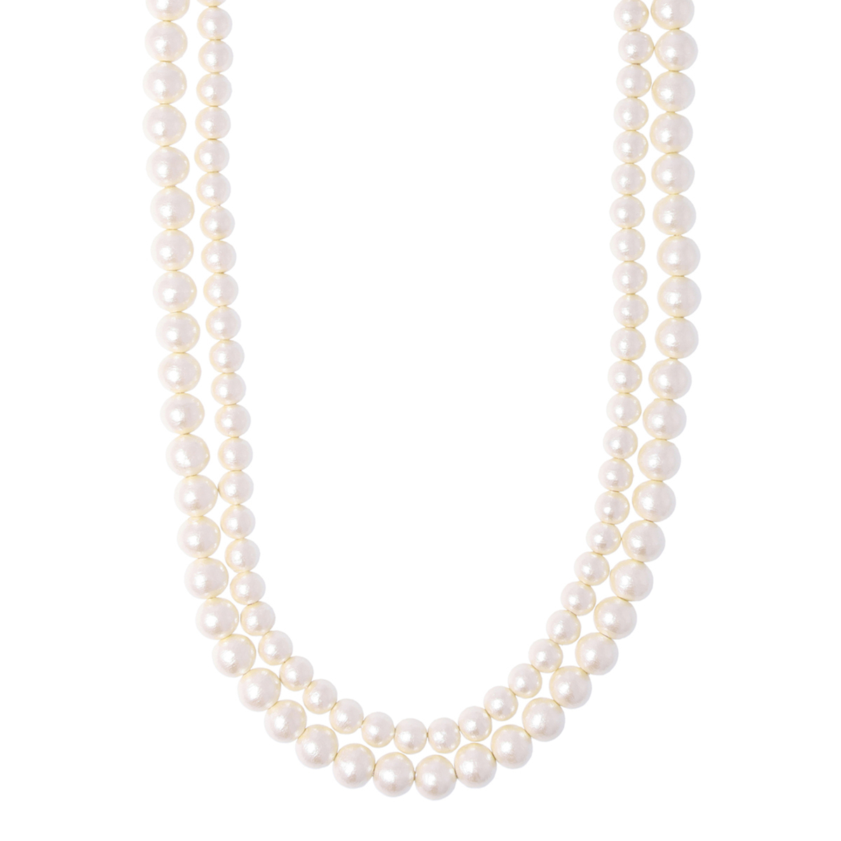 コットンパールを約200個近く使用した2連のネックレス。2連のロングで、1連にして、2重に巻いてショート丈に。またマグネットの留め具がくっつく仕様で、1本ずつ独立することもできます