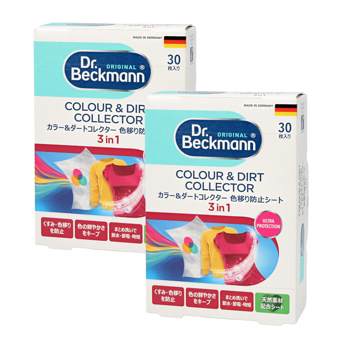 [使用目安] 1枚あたり容量5〜6kg ジーンズなど色の濃いものが多いときや、容量6kg以上の家庭用洗濯機は2枚 [使用方法] 1. 洗濯機に洗濯物と適量の洗剤を入れてください 2. 衣類の色の濃さ、色柄物の量の多さに合わせ、シートを1〜2枚入れて洗濯してください 3. 洗濯後はシートを取り除き、燃えるゴミとして捨ててください [注意事項] ※必ず衣類の洗濯表示と洗濯機の取扱説明書の指示に従ってください ※新品の色柄物は、必ず2・3度別に洗ってください ※洗濯機の容量以上に洗濯物を入れないでください ※染料が濃い衣類(濃い色のジーンズやシルク素材など)はシートを2・3枚、またカラー&ダートコレクターウルトラをおススメします ※大量の色素が出た場合、吸着しきれない場合がございます ※一度使用したシートは使わないでください ※湿気の多いところで保管しないでください ※用途以外に使用しないでください 【ドイツ製】 [セット内容] ドクターベックマン 色移り防止シート 30枚入×2
