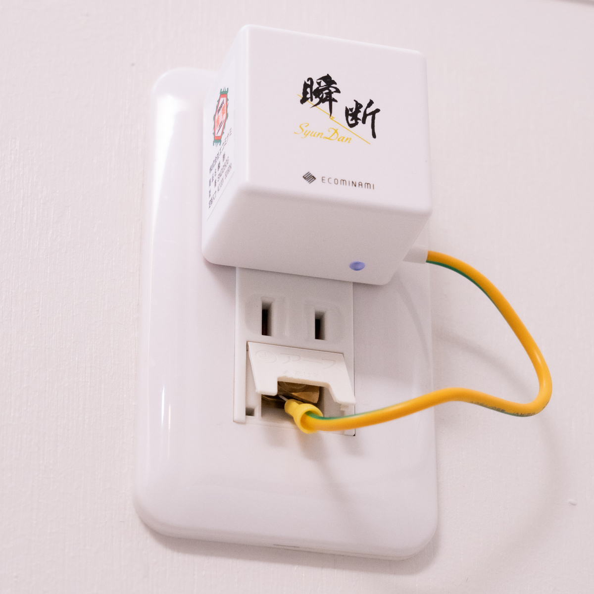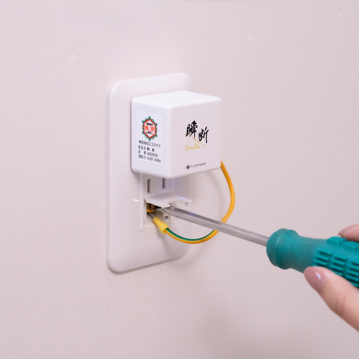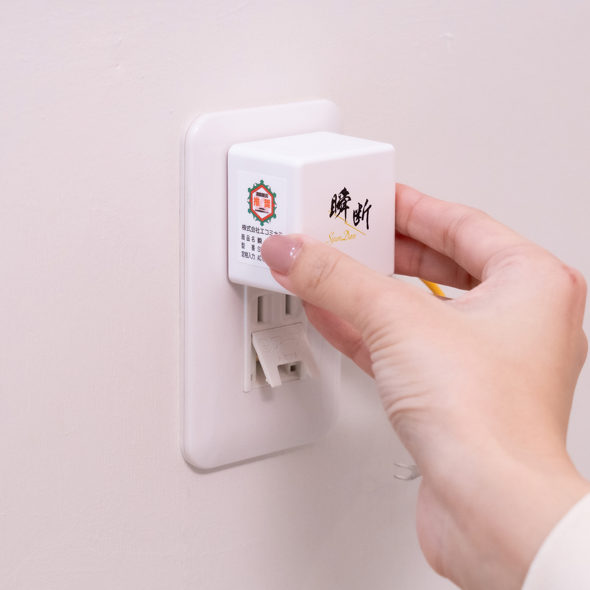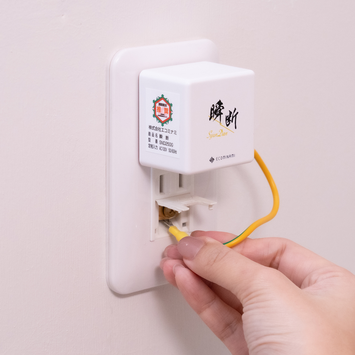 アース付きコンセントに差し込むだけで設置でき、工事は不要です(*2)。振り子の原理を応用した技術を用いた「感震電源遮断装置」として特許を取得しています(特許第7692236号)