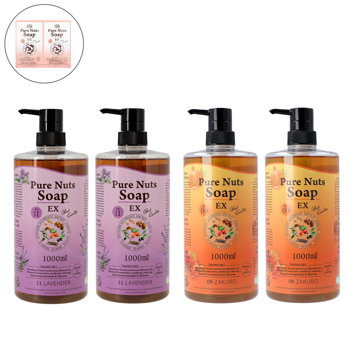 [セット内容] ・ナチュラセラ ピュアナッツソープEX 1000mL 2本セット×2 ・ナチュラセラ ピュアナッツソープ EX ホワイトローズ パウチ2包(プレゼント) [成分] 水、ヤシ脂肪酸K、グリセリン、カリ石ケン素地、サピンヅストリホリアツス果実エキス、アルガニアスピノサ核油、グリチルリチン酸2K、カニナバラ果実油、ホホバ種子油、オリーブ果実油、ヒドロキシプロピルメチルセルロース、トコフェロール、香料
