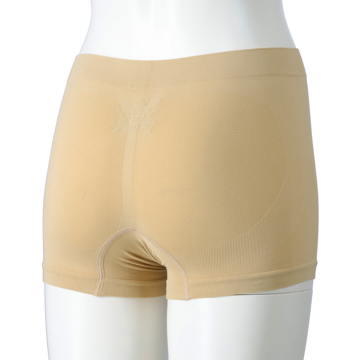 サイドの縫い目がない仕上がりで肌あたりが良く、アウターに響きにくいシームレスデザイン。さらにワイドウエストバンドが優しくフィット。履き口を締め付けすぎない優しい着け心地です