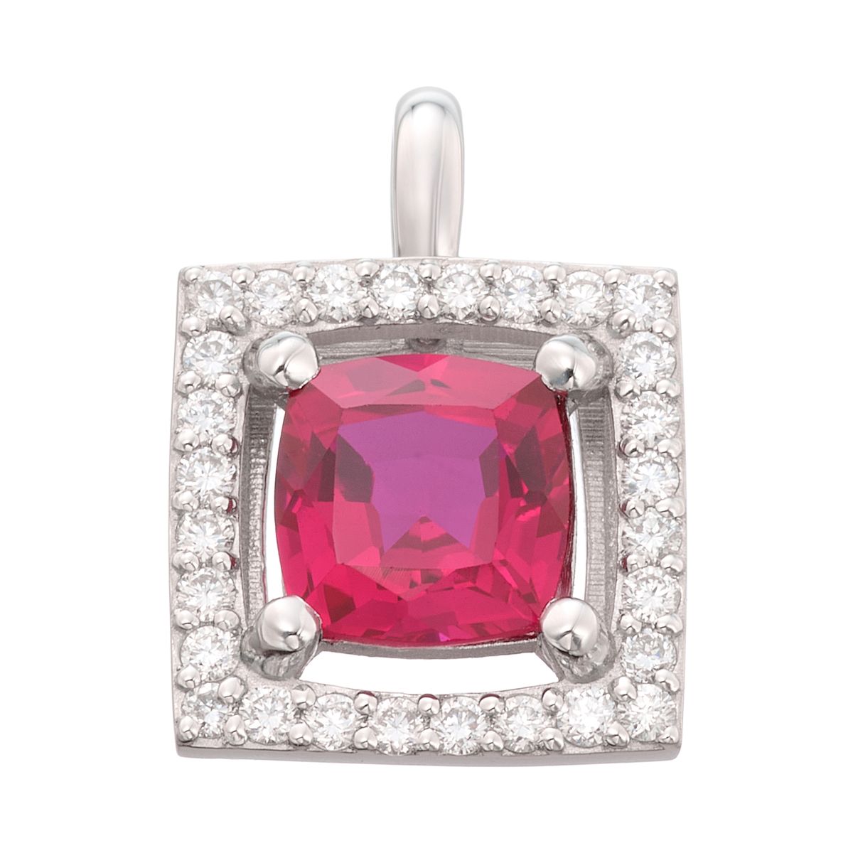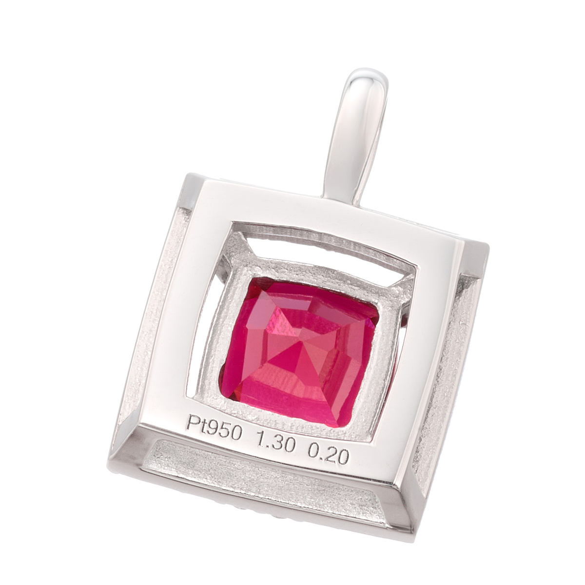 センターのラボグロウンルビーが、深く鮮やかな輝きを放つペンダントヘッド。スクエア状に配置されたラボグロウンダイヤモンドが、ラボグロウンルビーの深い輝きを引き立て胸元を彩ります。プラチナの上質な光沢と相まって、エレガントで華やかな仕上がりです