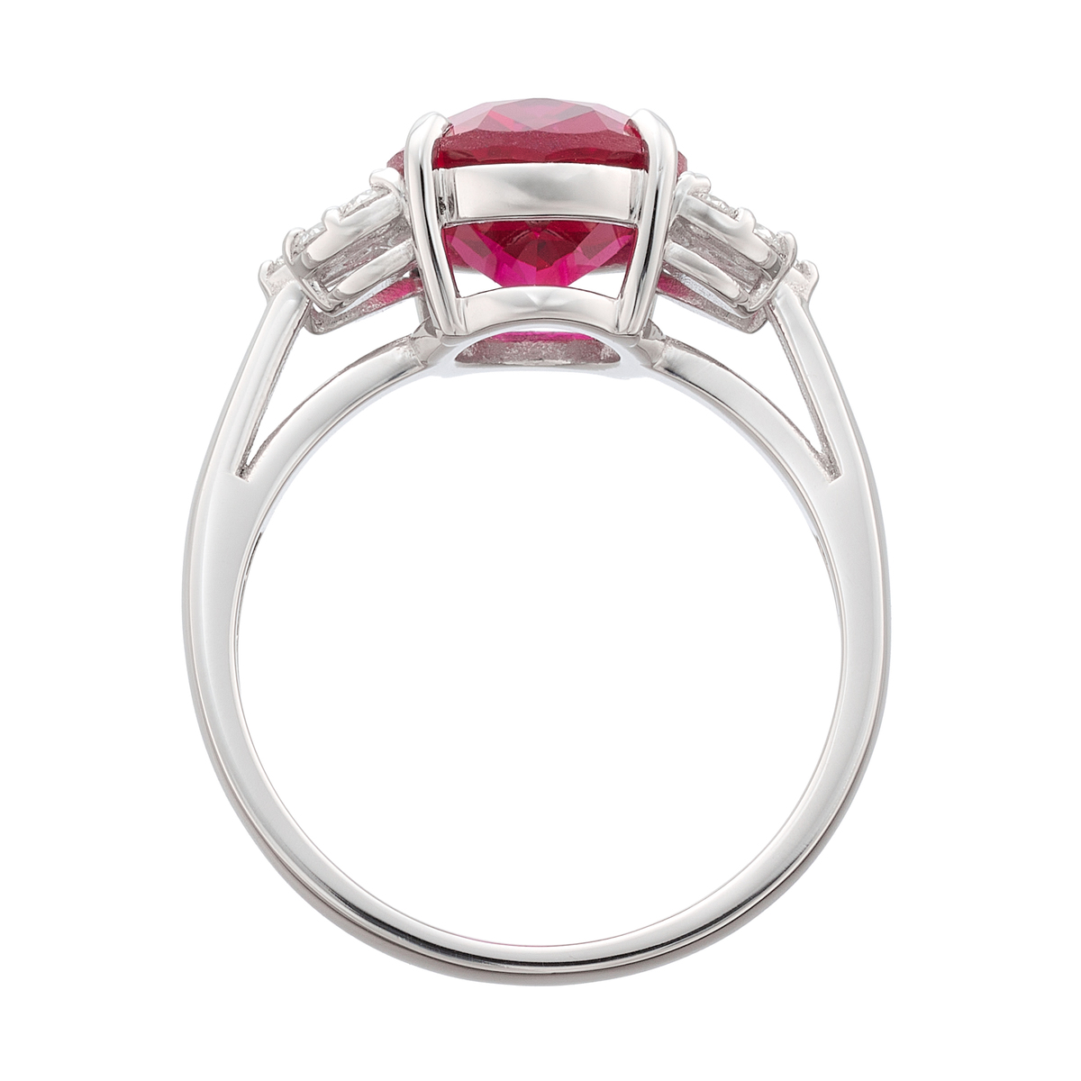 天然ルビーと実質的に同じ化学組成、結晶構造、物理的特性を持つ人工鉱物、ラボグロウンルビー。センターのラボグロウンルビーの、深く鮮やかな輝きをお楽しみ頂けます