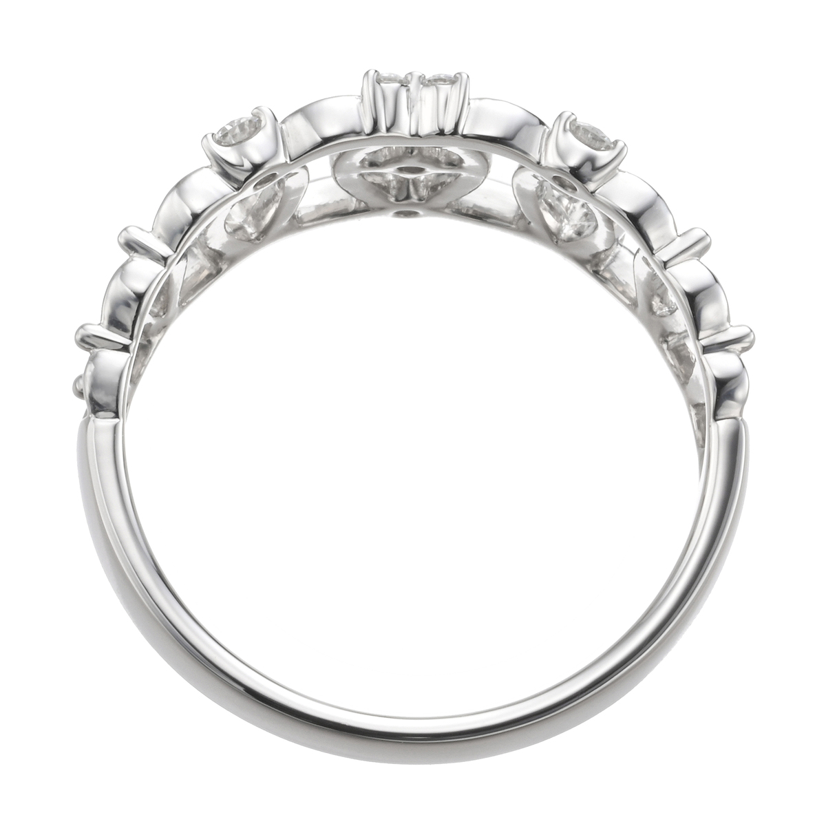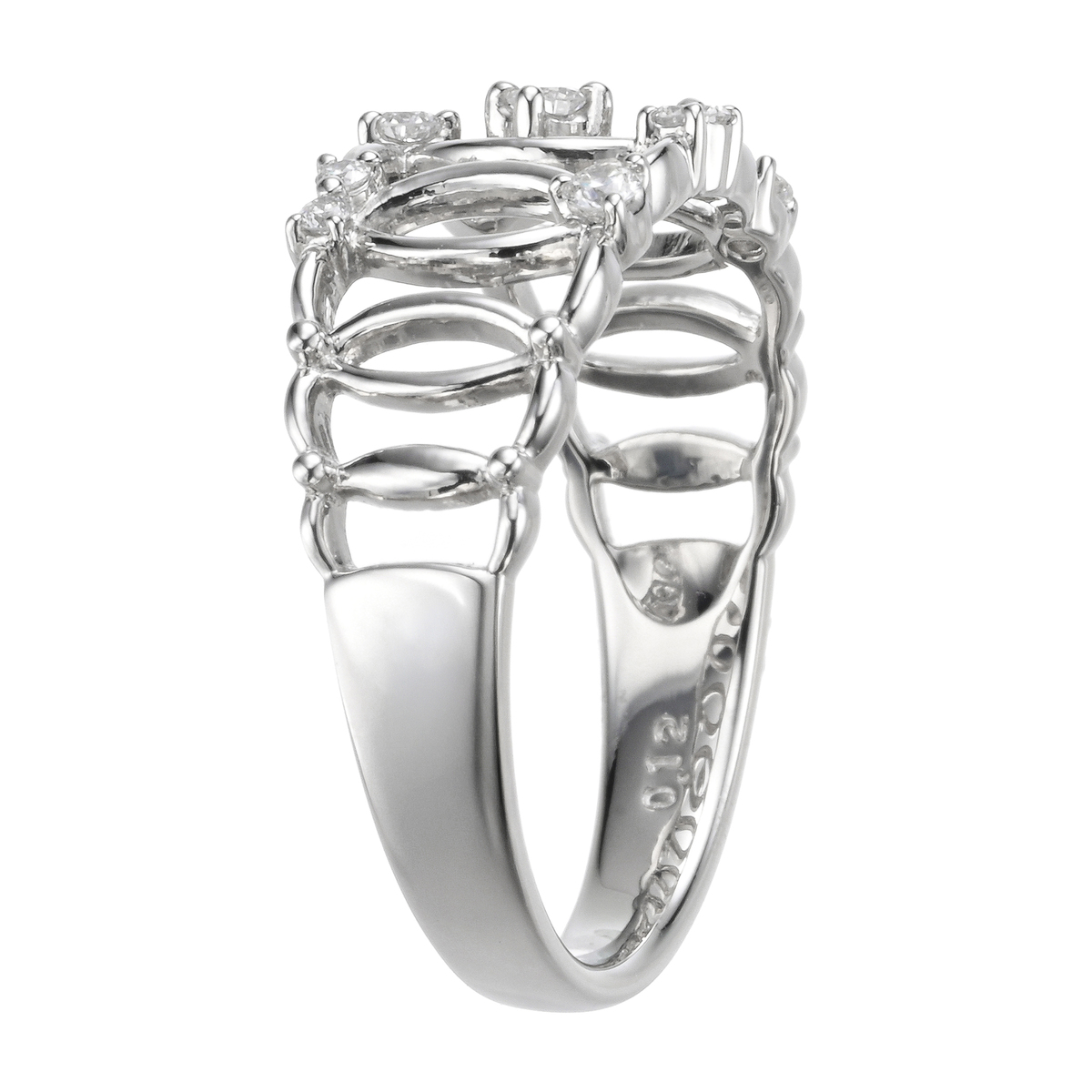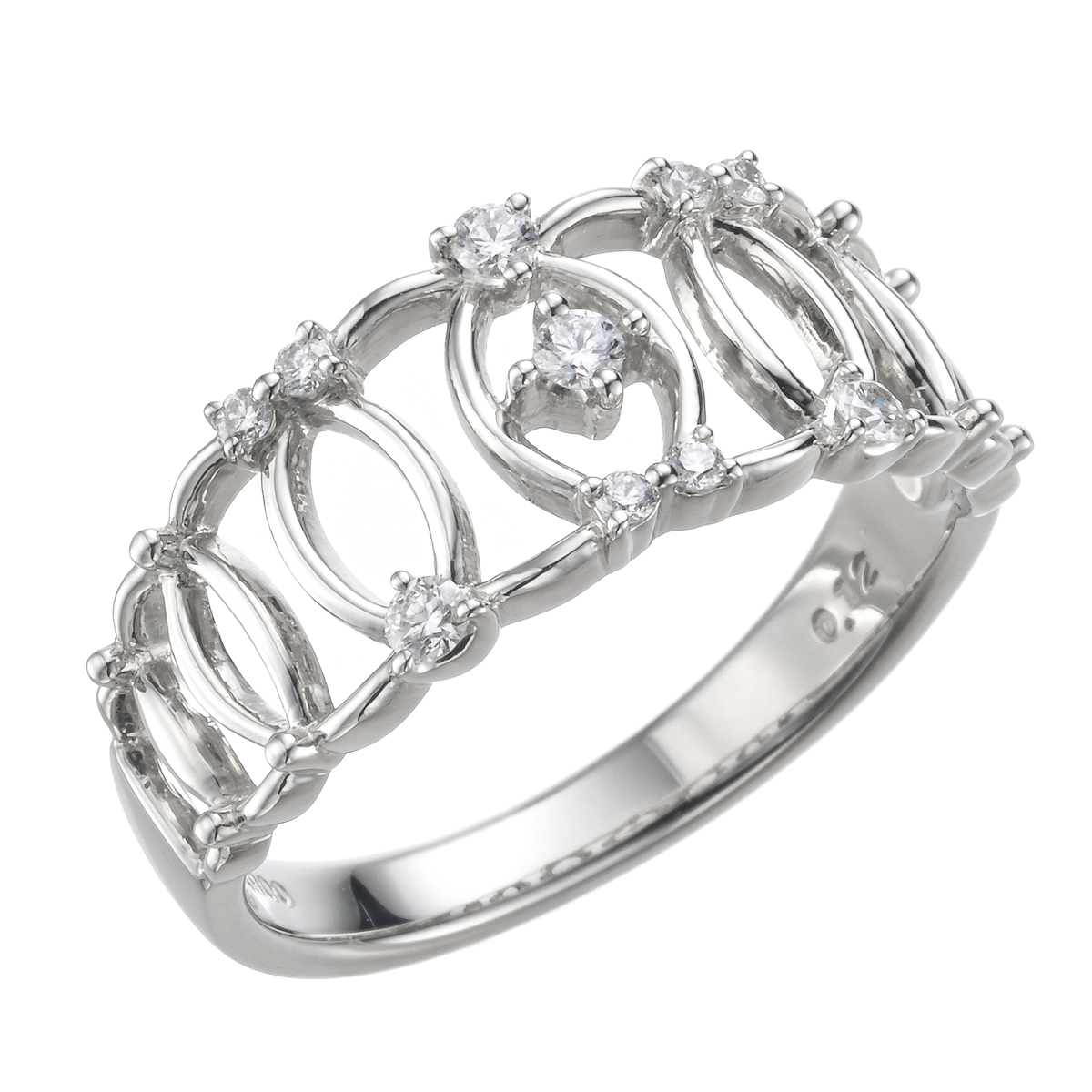 ダイヤモンドが10石輝くオープンワークリング。かぎ編みで編んだようなヨーロッパ風のレースを表現。縁には散りばめたダイヤモンドが優雅に光り、中央の大きいダイヤがアクセントに。幅のあるフォルムでありながら軽やかなデザインで、指周りを上品に演出します