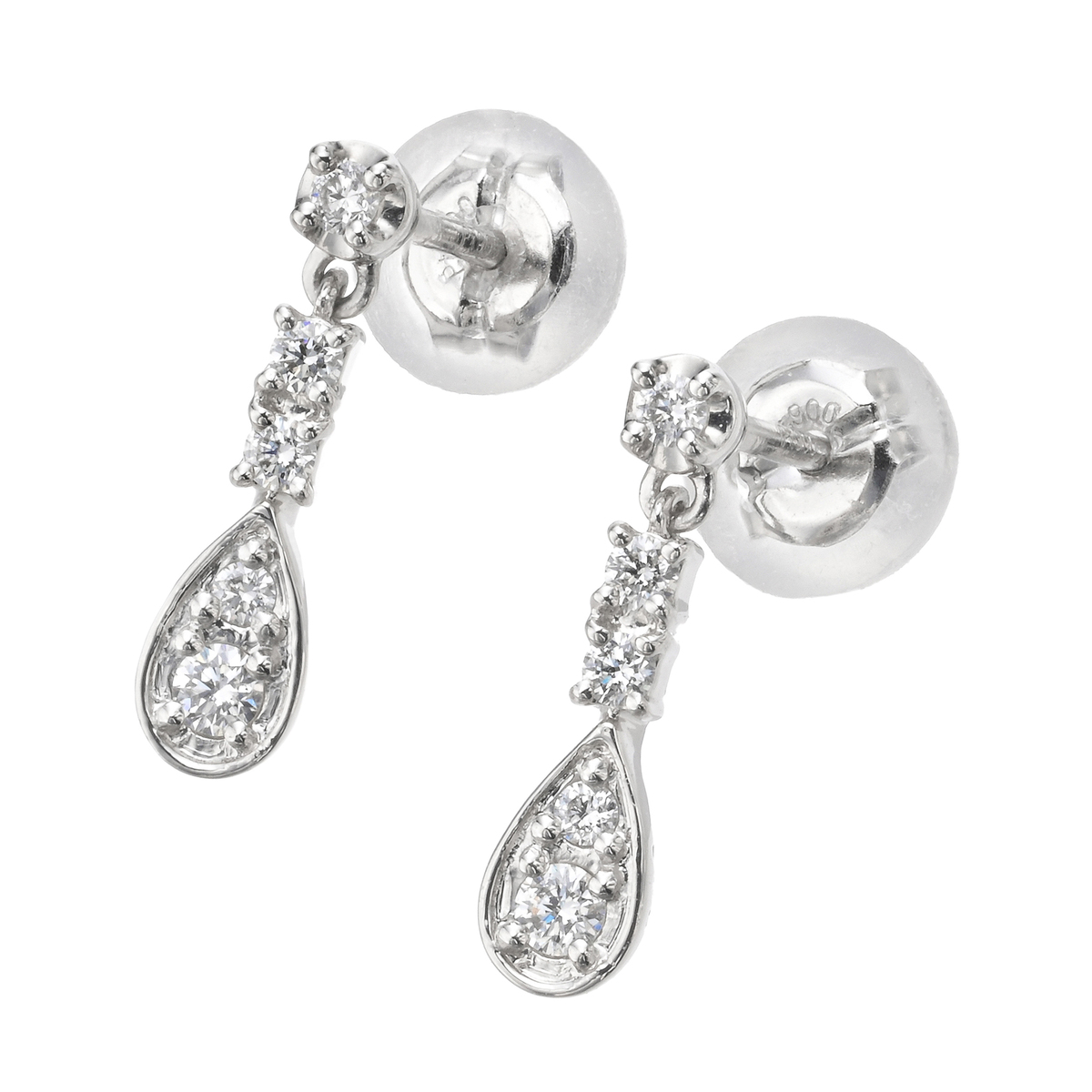 両耳合計10石のダイヤモンドを贅沢にあしらったスイングピアス。しずくが揺れるデザインで、動くたびにキラキラと輝きます。デイリーから特別なシーンまで装いを選ばず、洗練された輝きを演出します