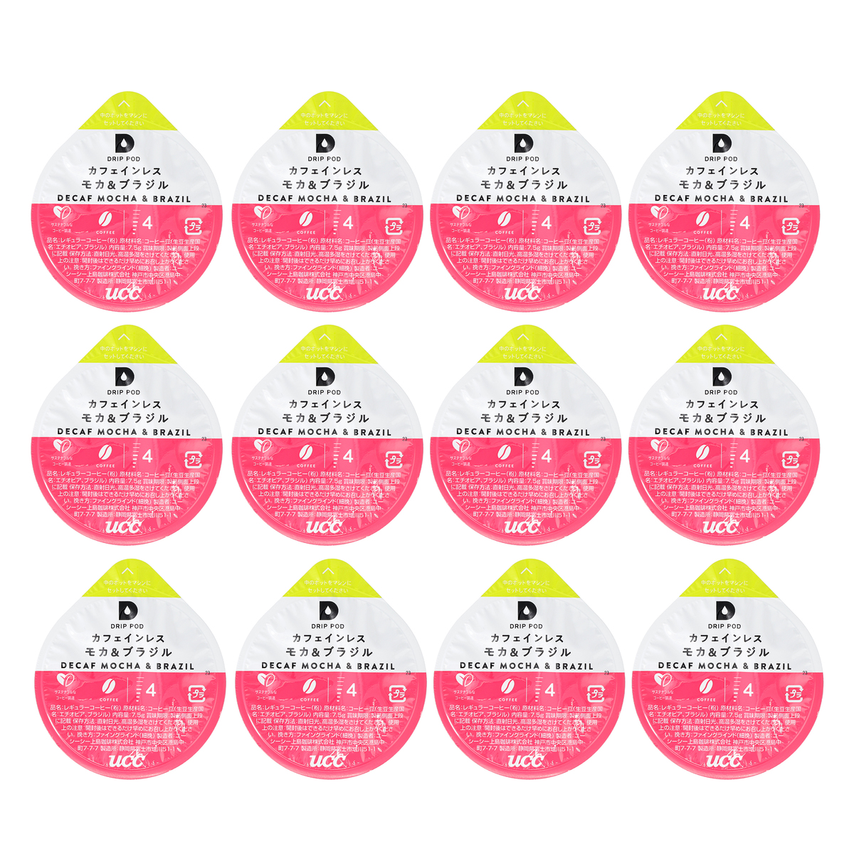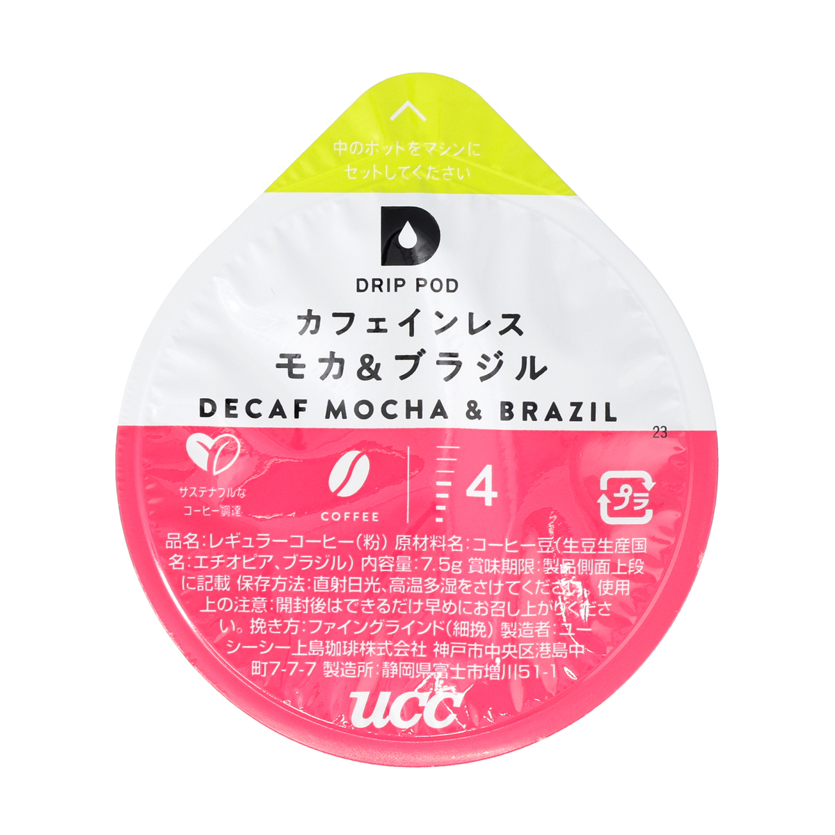 [アレルギー物質特定原材料8品目] なし [商品内容] 90g(7.5g×12個) [保存方法] 開封前:直射日光、高温多湿をさけてください 開封後:できるだけ早めにお召し上がりください [お召し上がり方] 専用抽出マシンの湯量を4(140ml)に合わせ、コーヒー抽出モードを選択してドリップすることをおすすめしますが、お好みに応じてご調整ください [注意事項] ※この商品には専用の抽出マシンが必要となります。それぞれのマシンの使用方法については、取扱説明書をご覧ください ※マシンの説明書に従って正しく安全にお使いください ※コーヒーを抽出する際、火傷にご注意下さい ※ポッド天面部の色のついた点はコーヒー粉が挟まったものです。安心してお召し上がり下さい ※コーヒーから発生するガスや気温の影響で膨張する場合がありますが、品質には問題ありません [原料原産地] コーヒー豆(生豆生産国名:エチオピア、ブラジル) [原産国] 日本 [原材料] コーヒー豆(生豆生産国名:エチオピア、ブラジル)