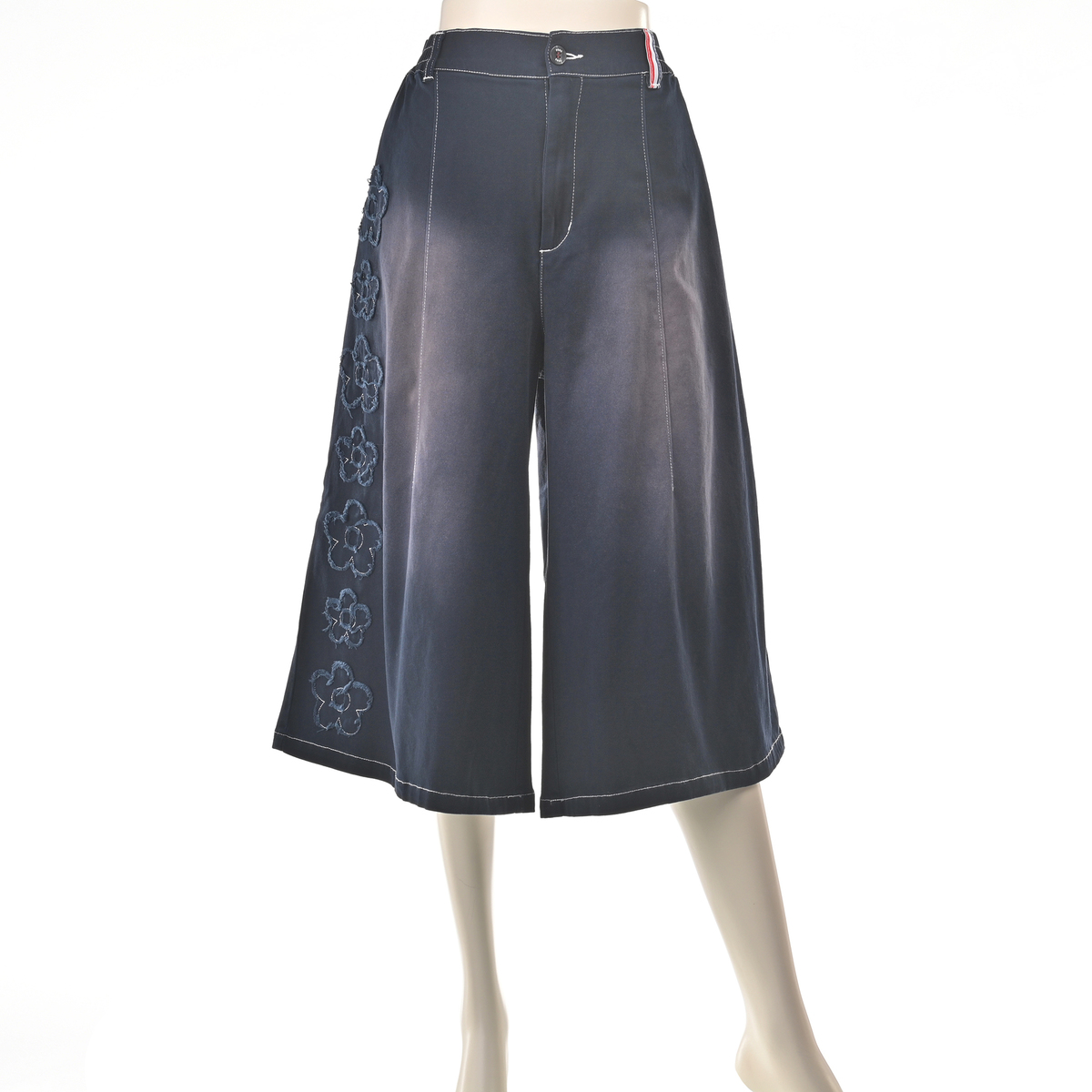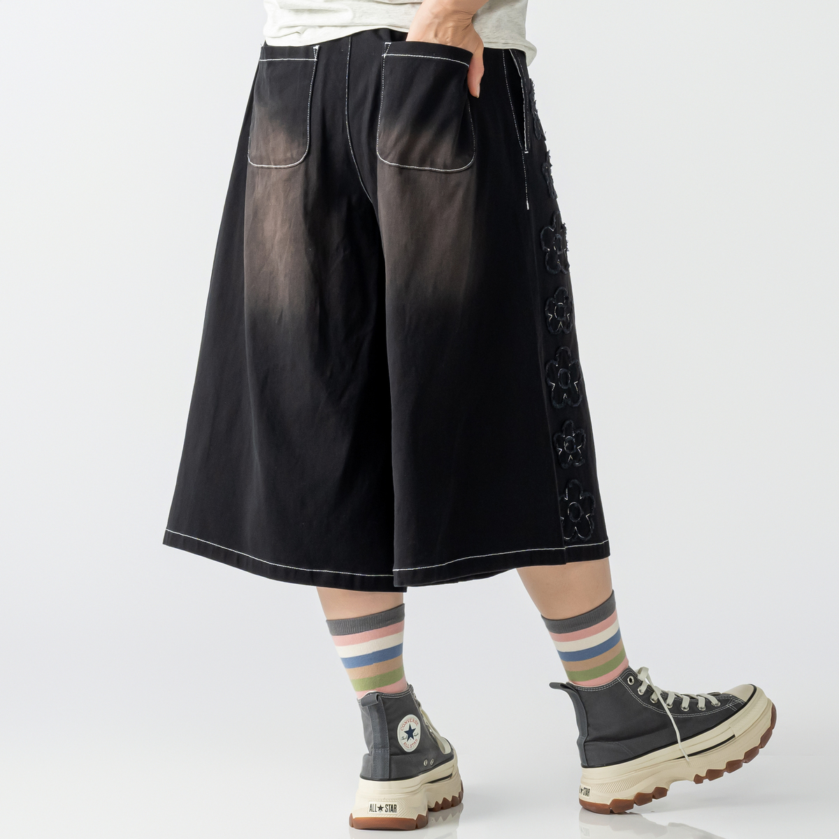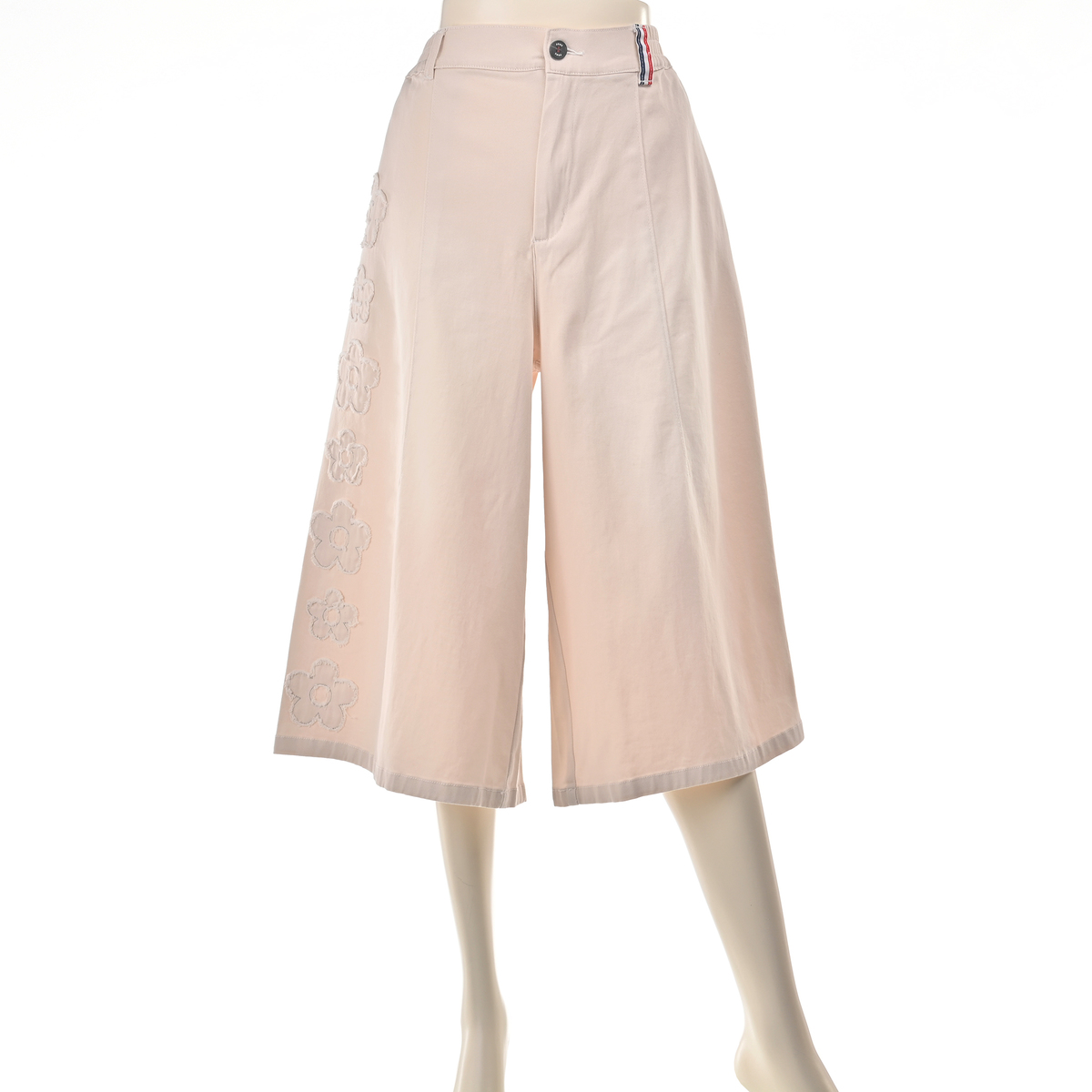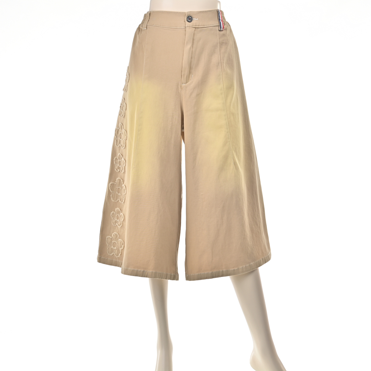 前右足の脇にフラワーモチーフをあしらったハーフパンツ。フラワーアップリケの生地端は切りぱなし仕様です。コーディネートのアクセントになり、綿ストレッチ素材でカジュアルに穿いていただけます