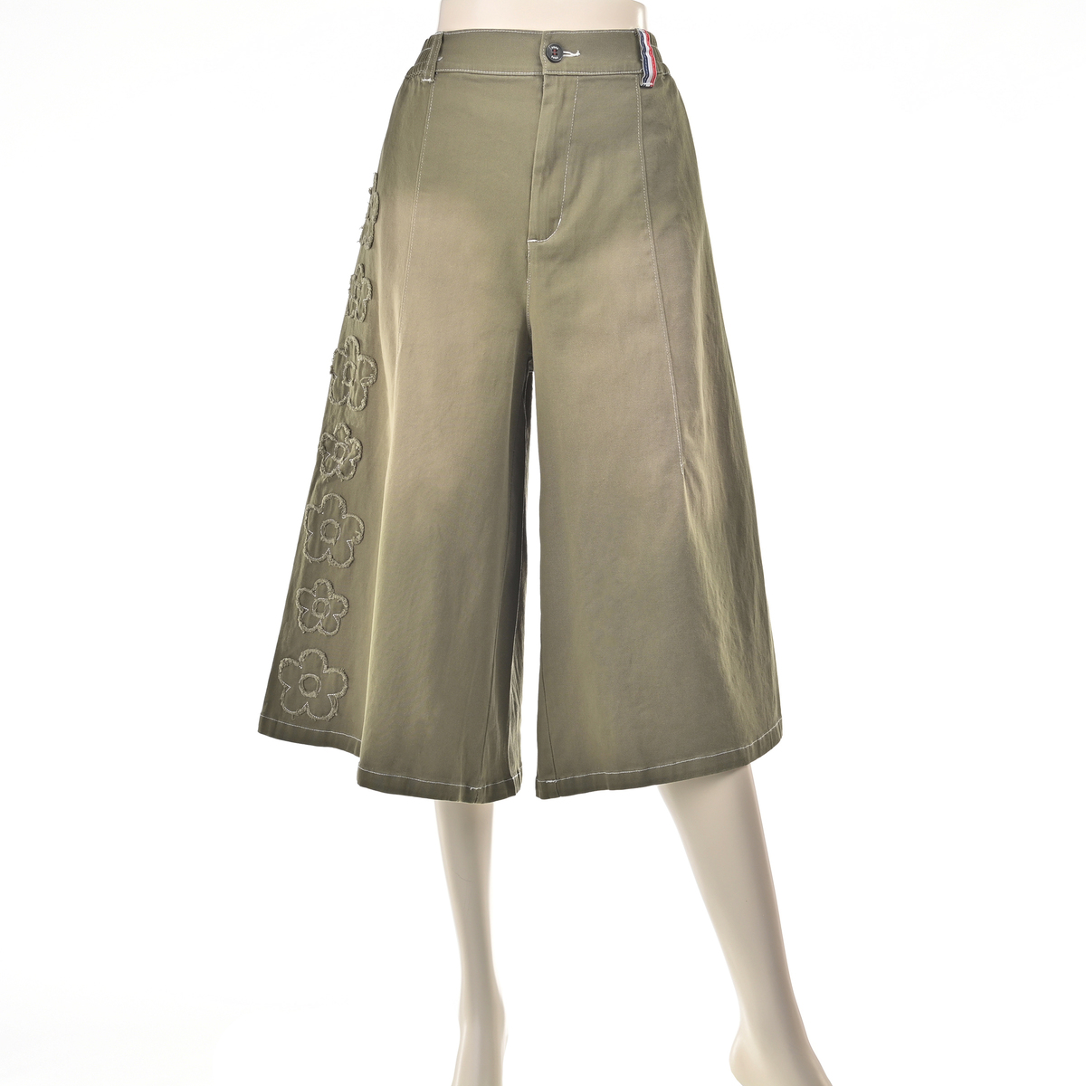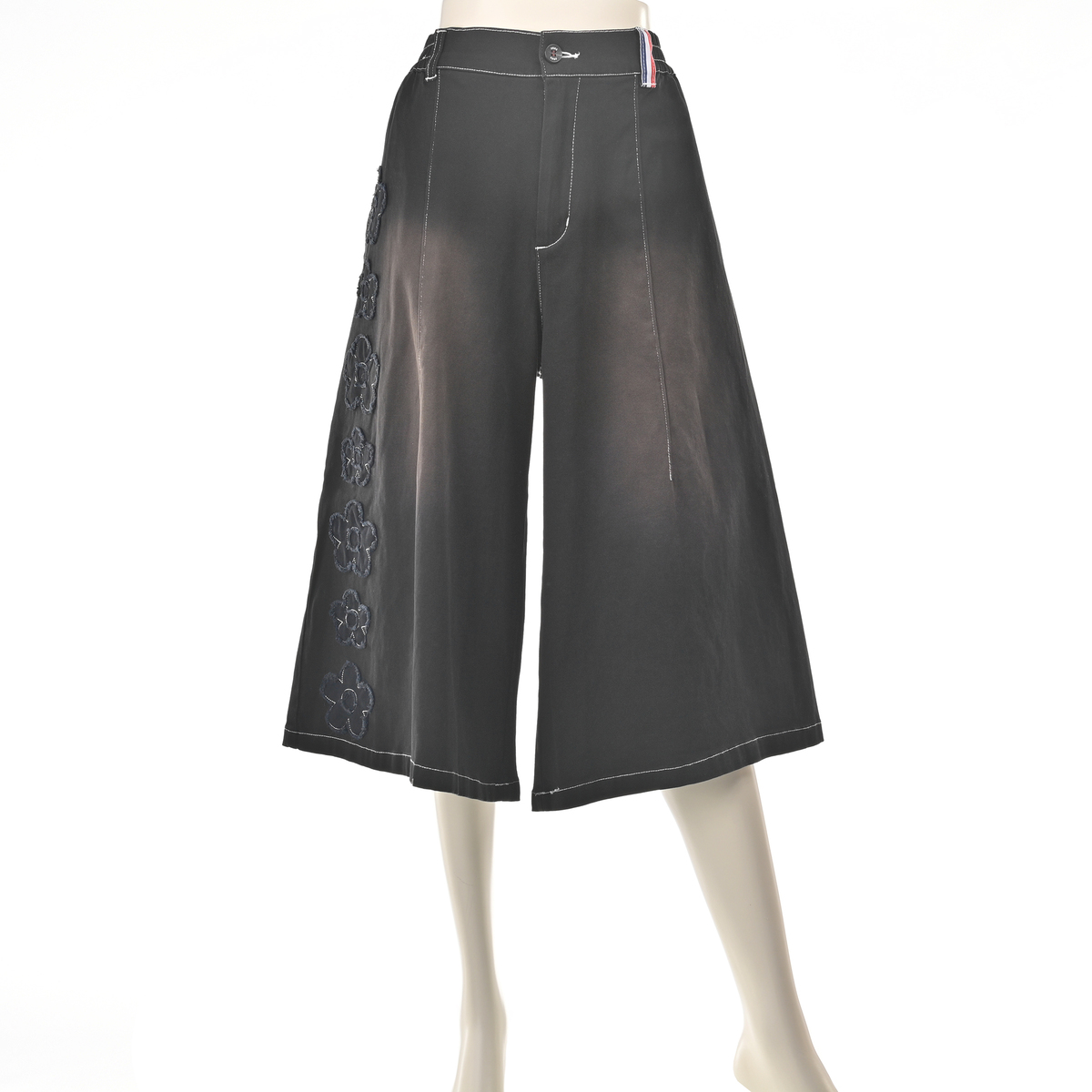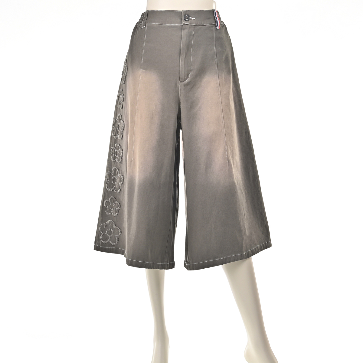 前右足の脇にフラワーモチーフをあしらったハーフパンツ。フラワーアップリケの生地端は切りぱなし仕様です。コーディネートのアクセントになり、綿ストレッチ素材でカジュアルに穿いていただけます