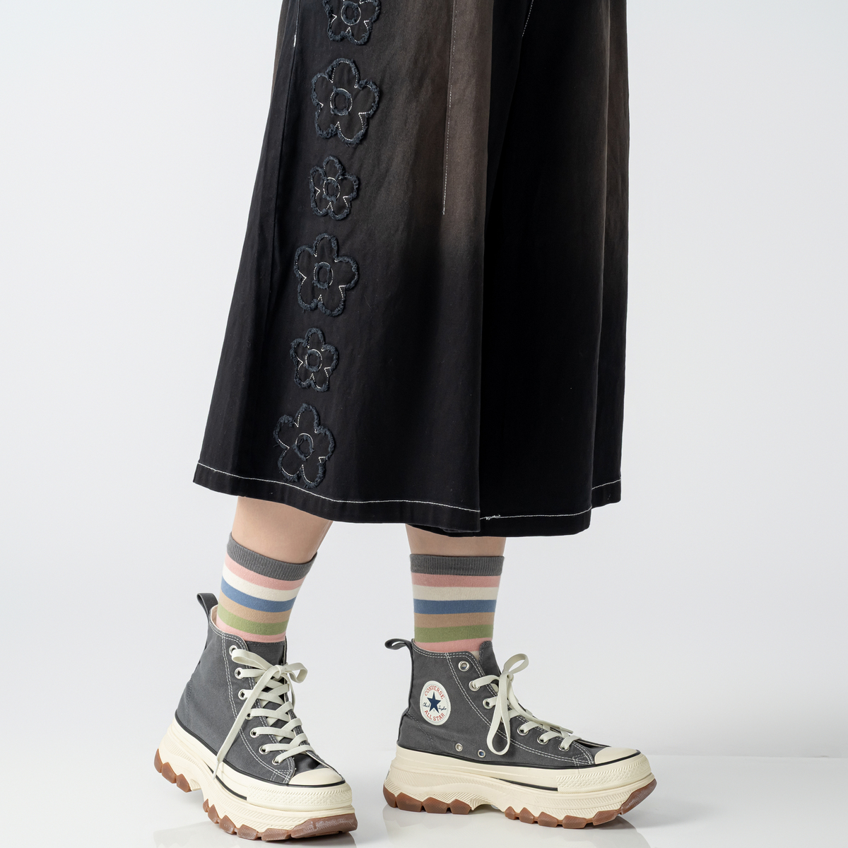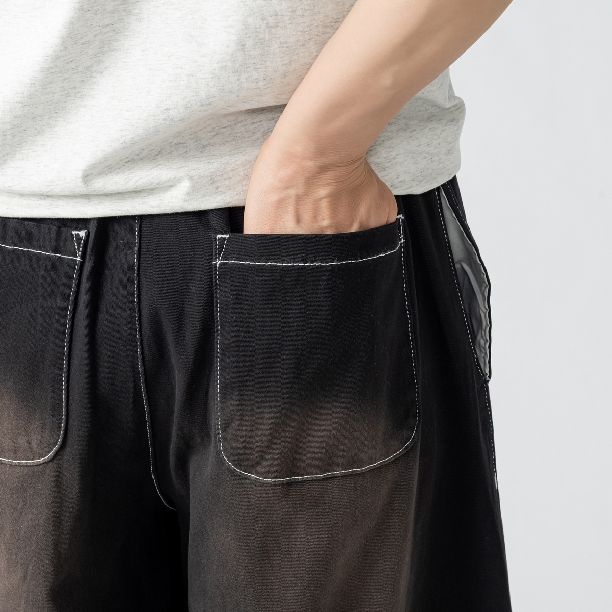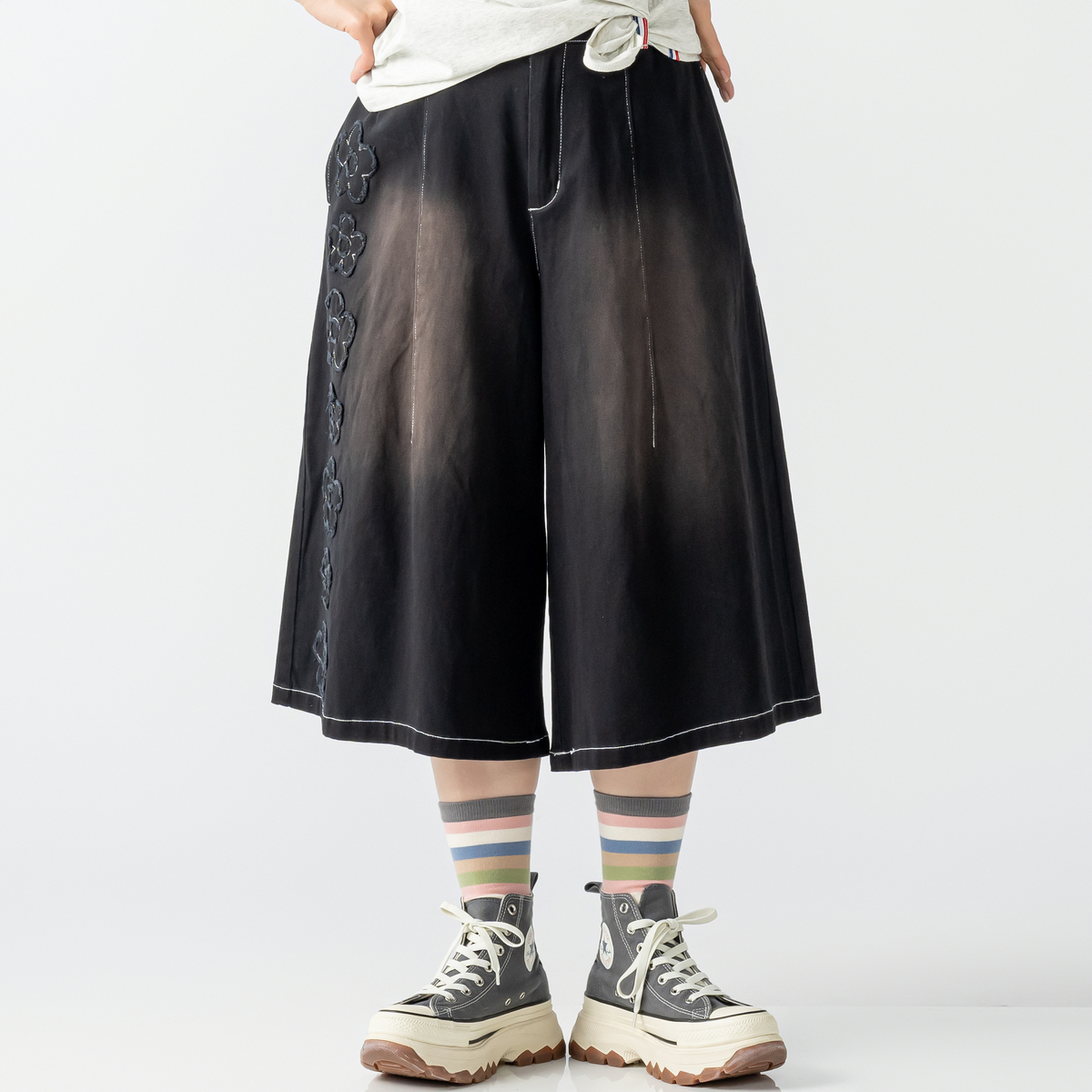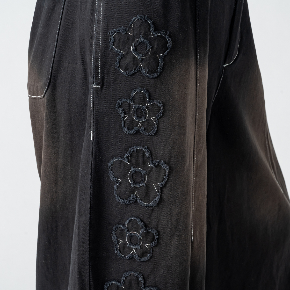 前右足の脇にフラワーモチーフをあしらったハーフパンツ。フラワーアップリケの生地端は切りぱなし仕様です。コーディネートのアクセントになり、綿ストレッチ素材でカジュアルに穿いていただけます