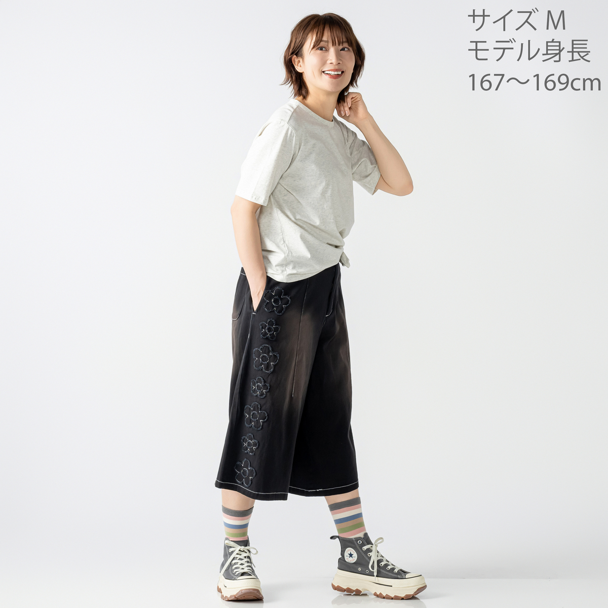 No. 755106 PERSONS ウォッシュ加工フラワーアップリケハーフパンツ