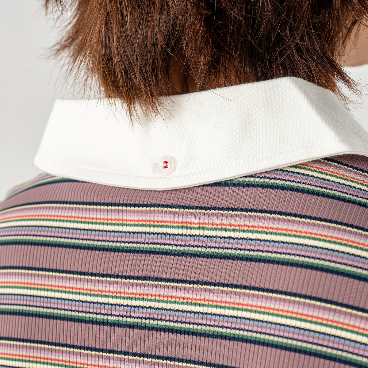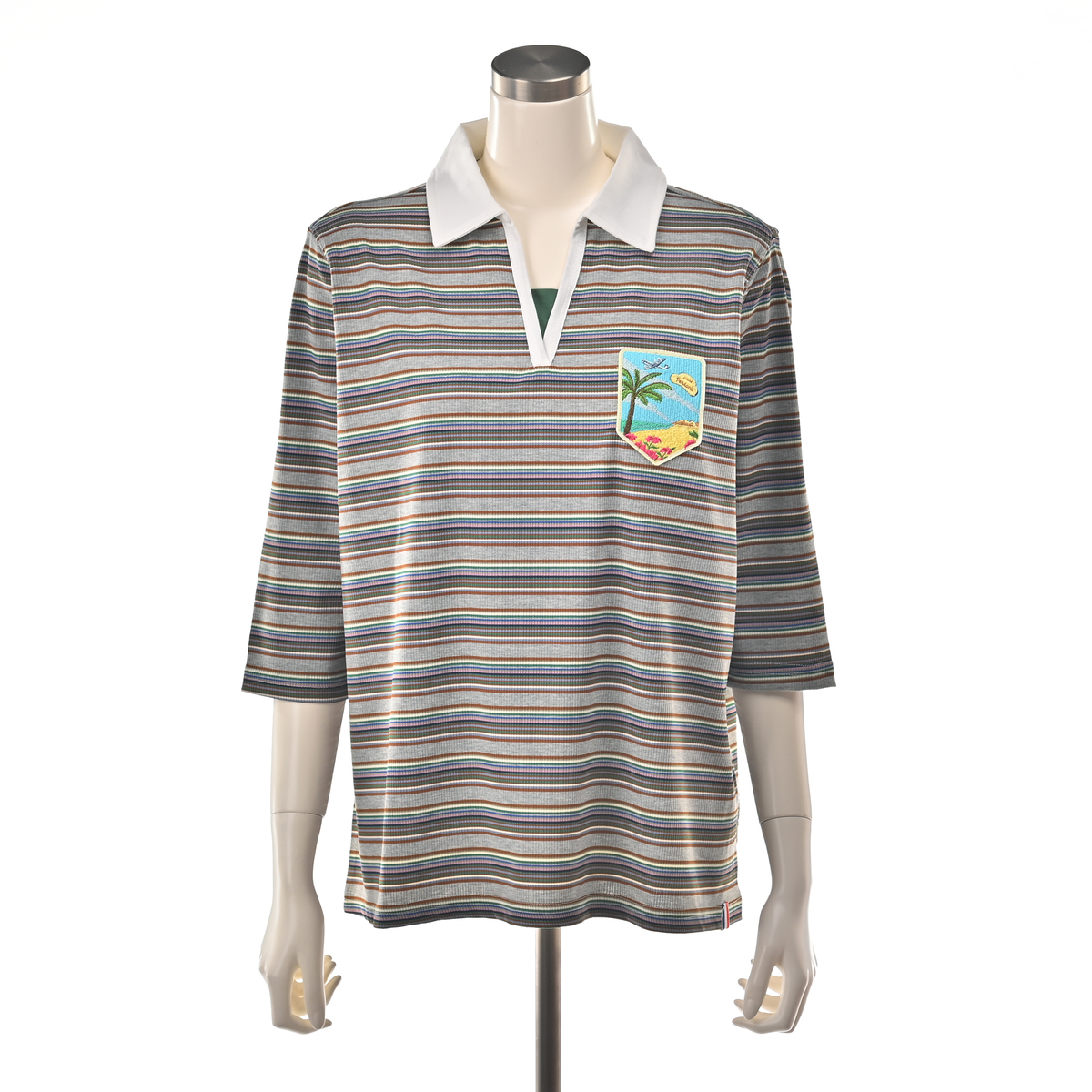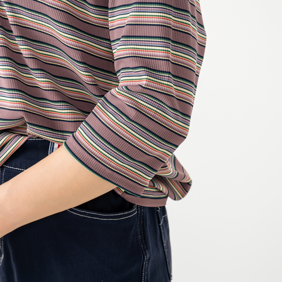 多色使いのテレコボーダー素材を使用したスキッパー衿のトップス。配色の衿が顔周りをすっきり見せてくれます