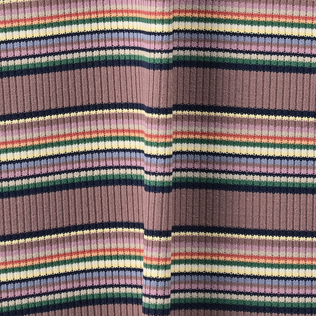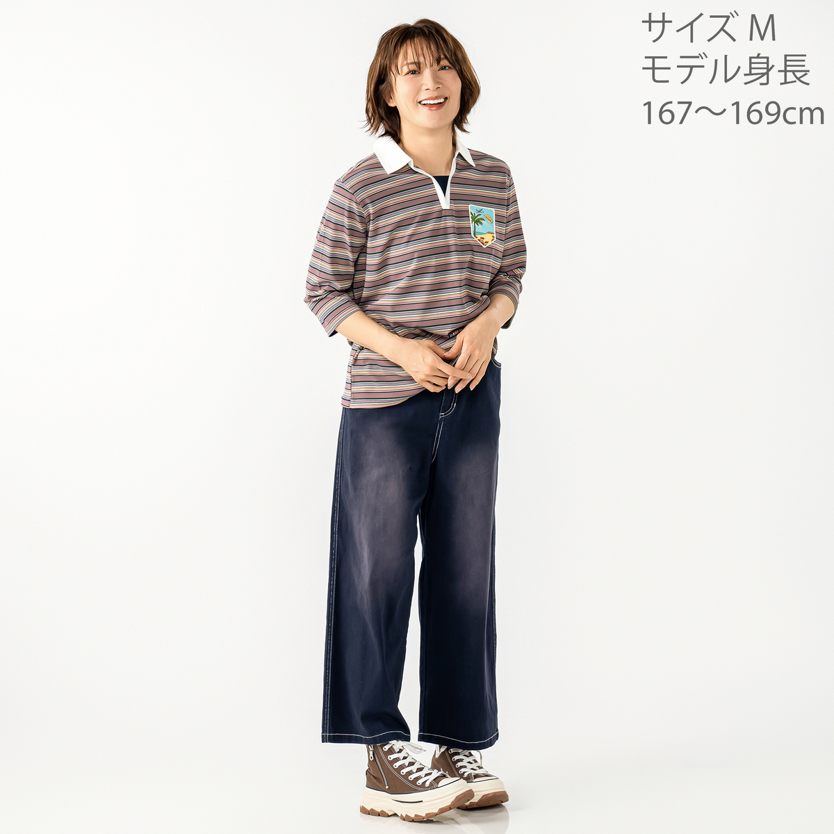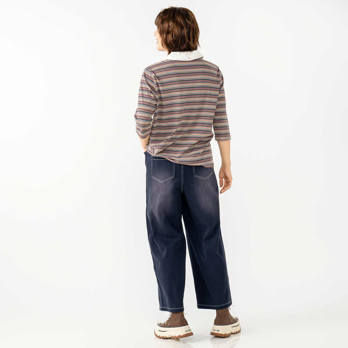 多色使いのテレコボーダー素材を使用したスキッパー衿のトップス。配色の衿が顔周りをすっきり見せてくれます