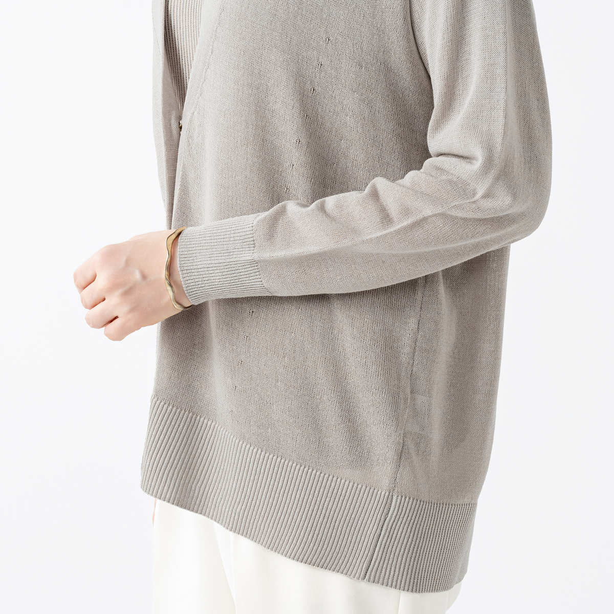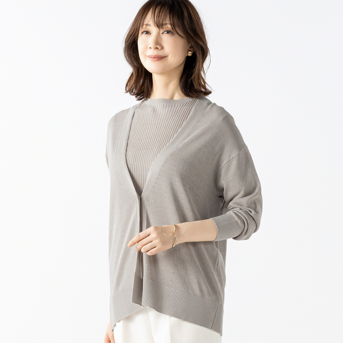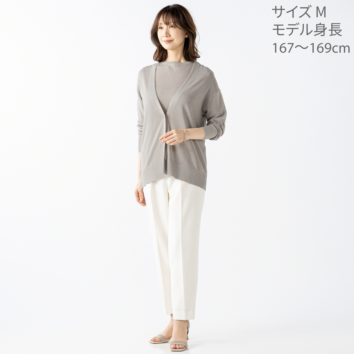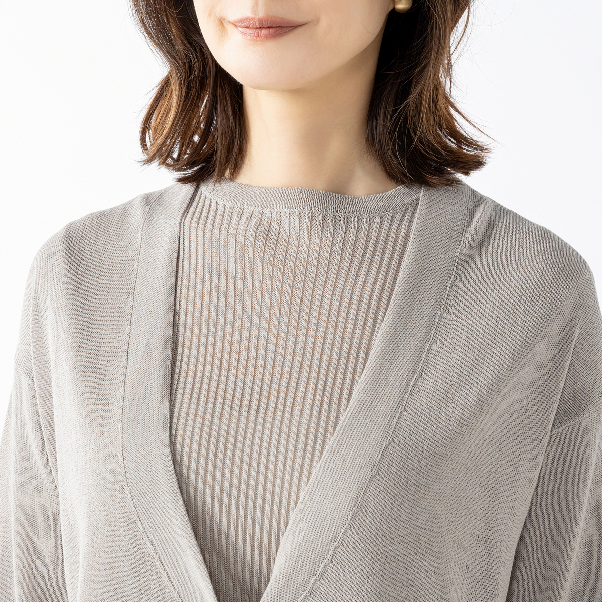 麻混素材を使用したニットアンサンブル。カーディガンは天竺編みのフラットな表情で、前開きのストレートラインが縦長シルエットを強調し、自然な肩落ちがリラックス感ときちんと感を両立。冷房対策や夏の羽織りとしても活躍します