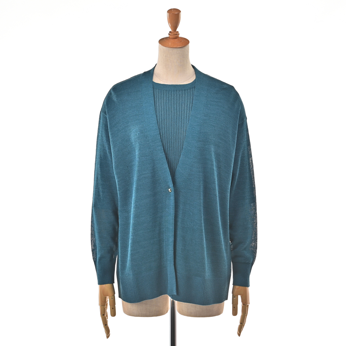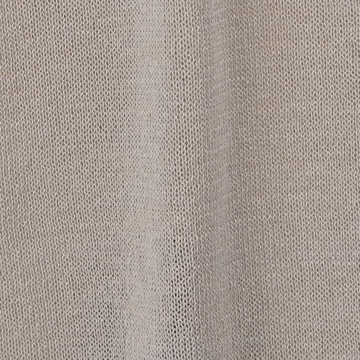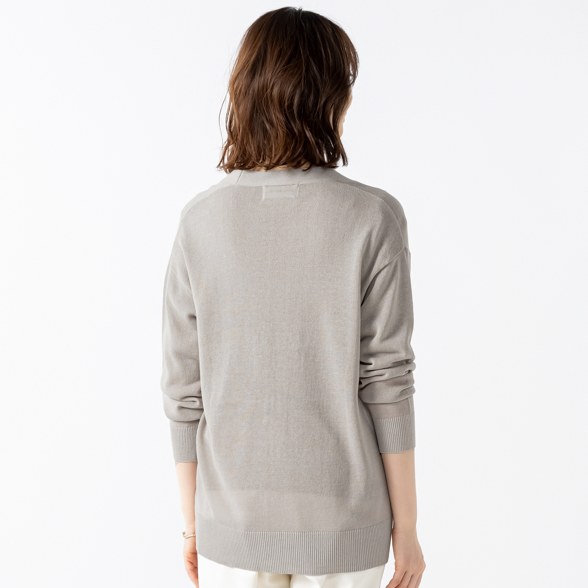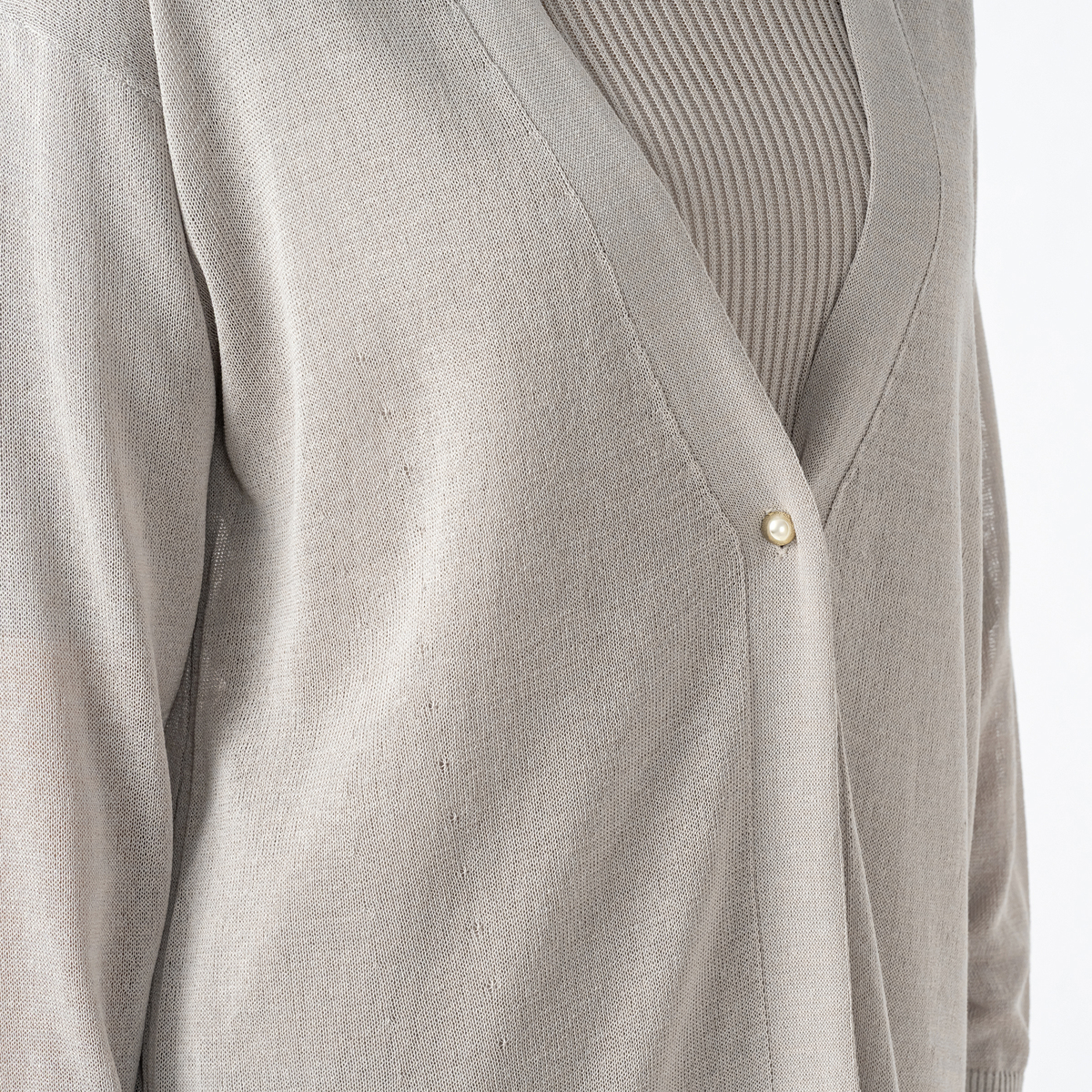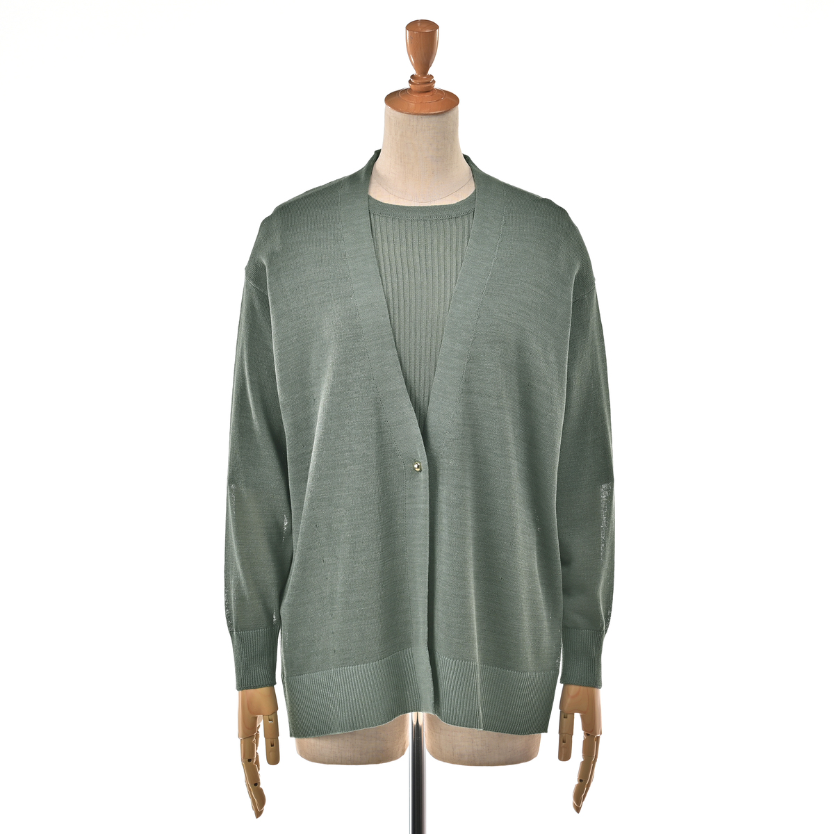 麻混素材を使用したニットアンサンブル。カーディガンは天竺編みのフラットな表情で、前開きのストレートラインが縦長シルエットを強調し、自然な肩落ちがリラックス感ときちんと感を両立。冷房対策や夏の羽織りとしても活躍します