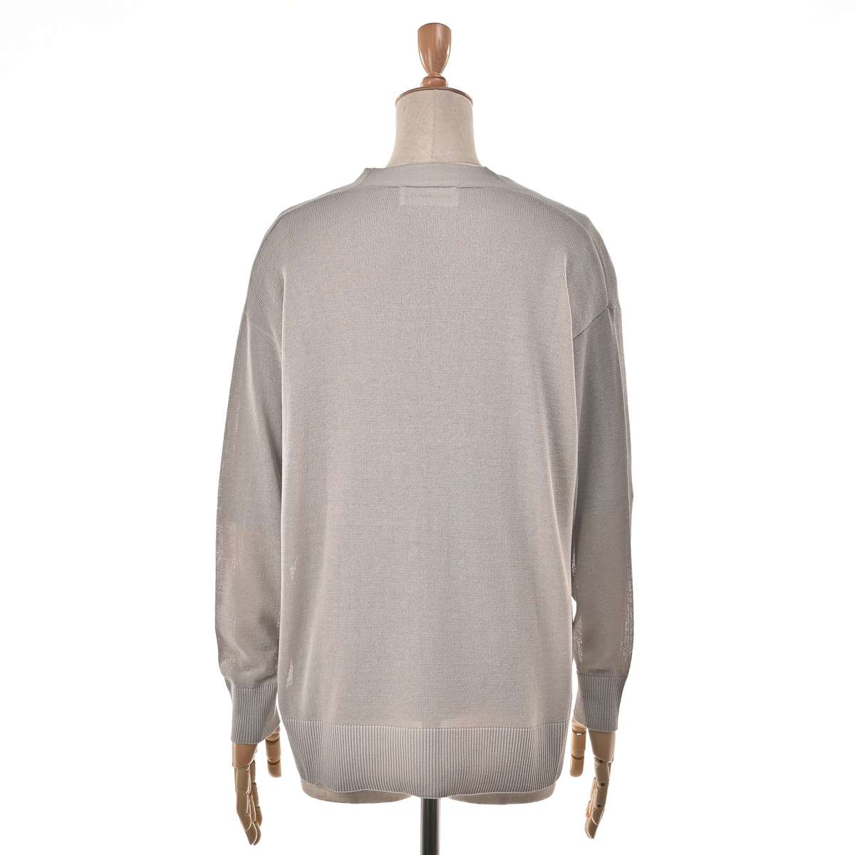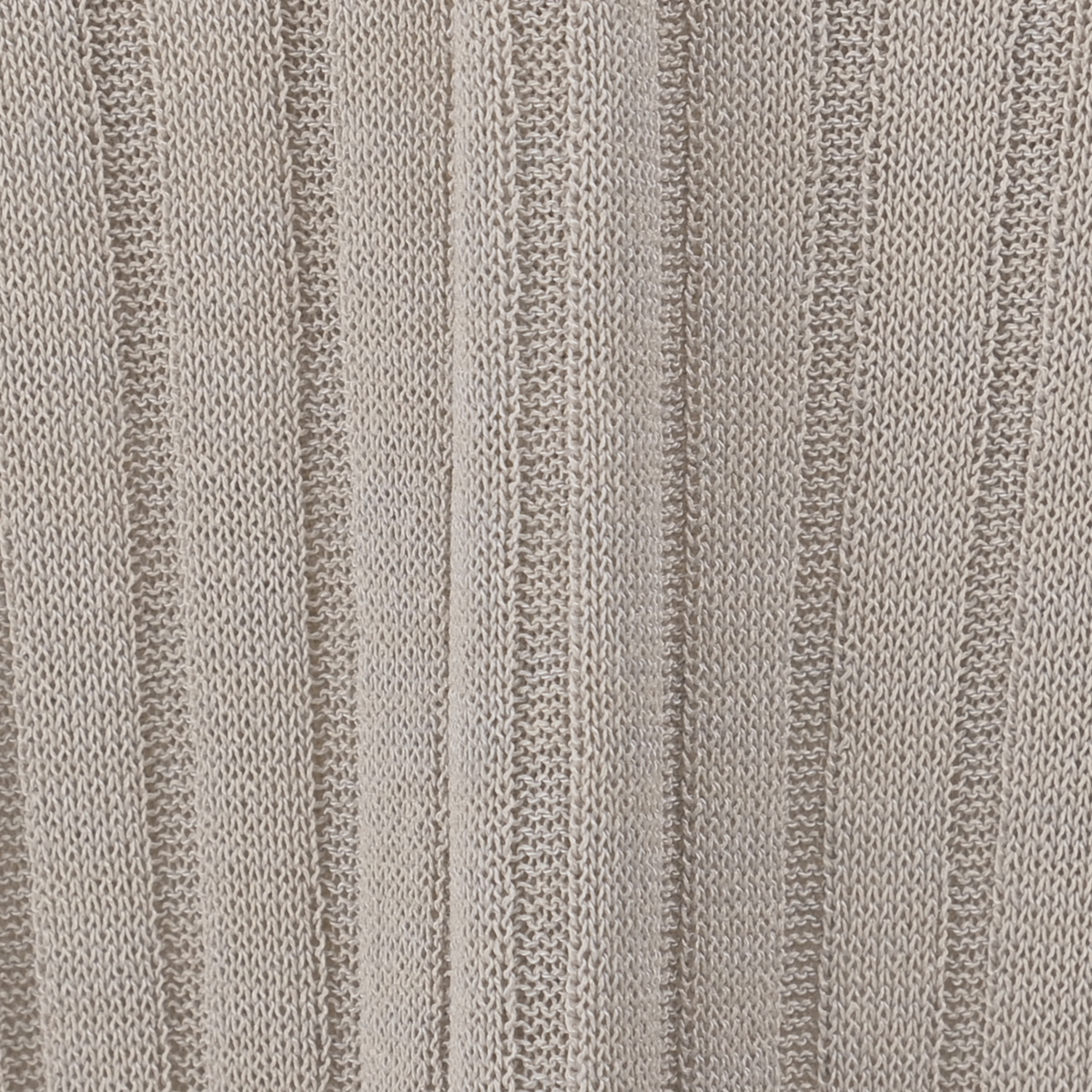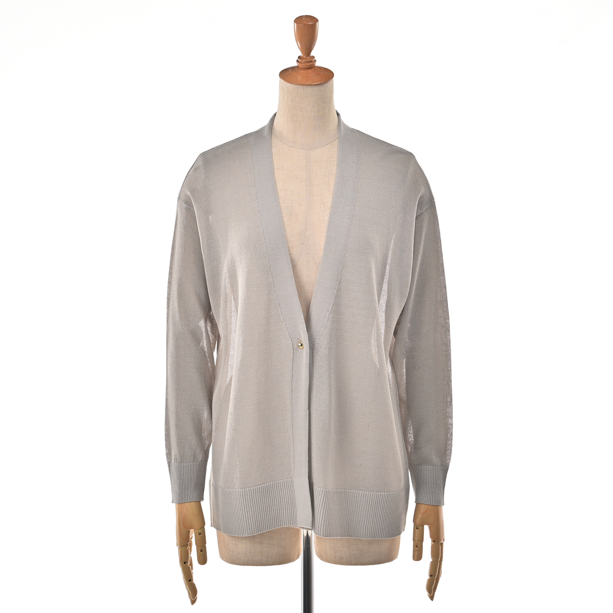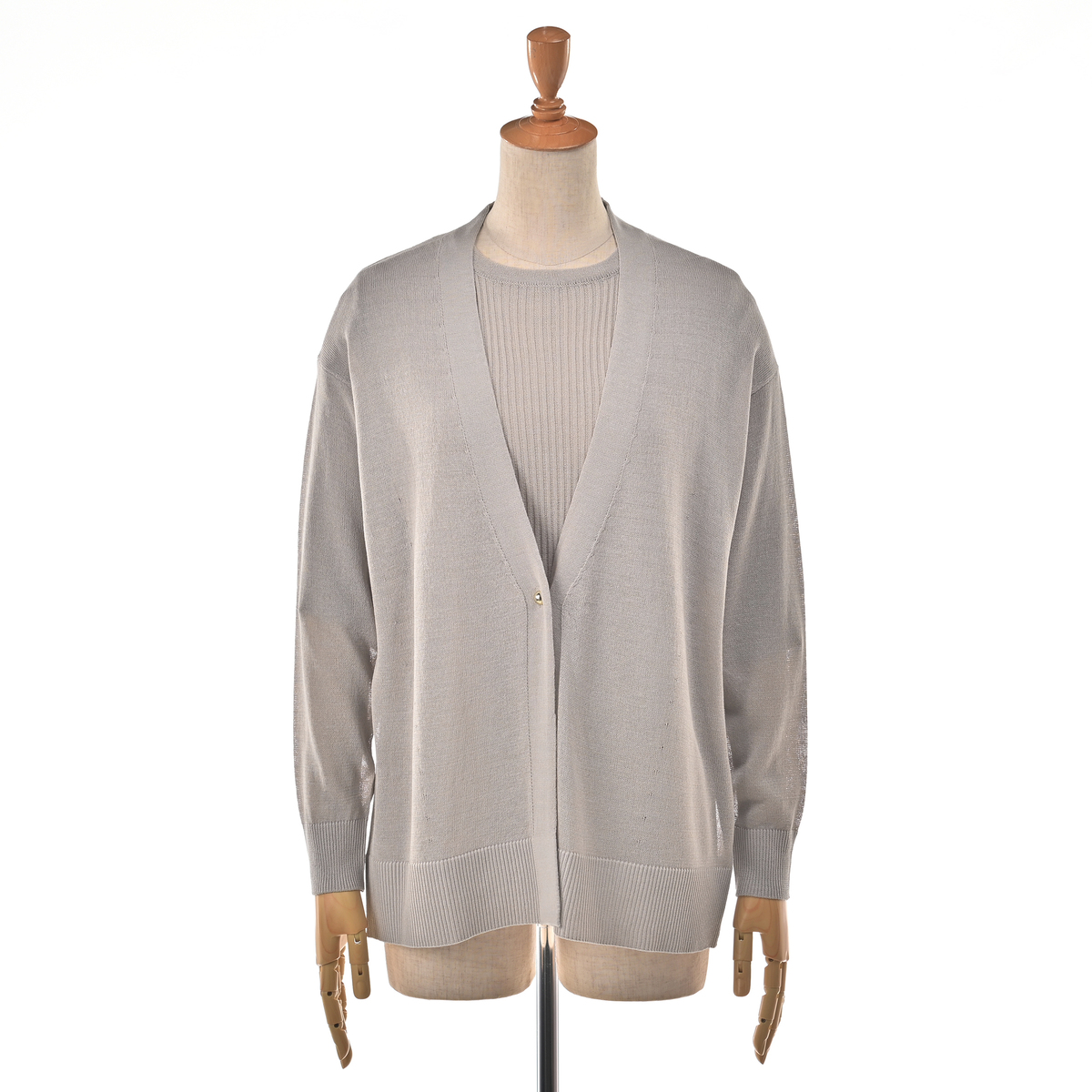 麻混素材を使用したニットアンサンブル。カーディガンは天竺編みのフラットな表情で、前開きのストレートラインが縦長シルエットを強調し、自然な肩落ちがリラックス感ときちんと感を両立。冷房対策や夏の羽織りとしても活躍します