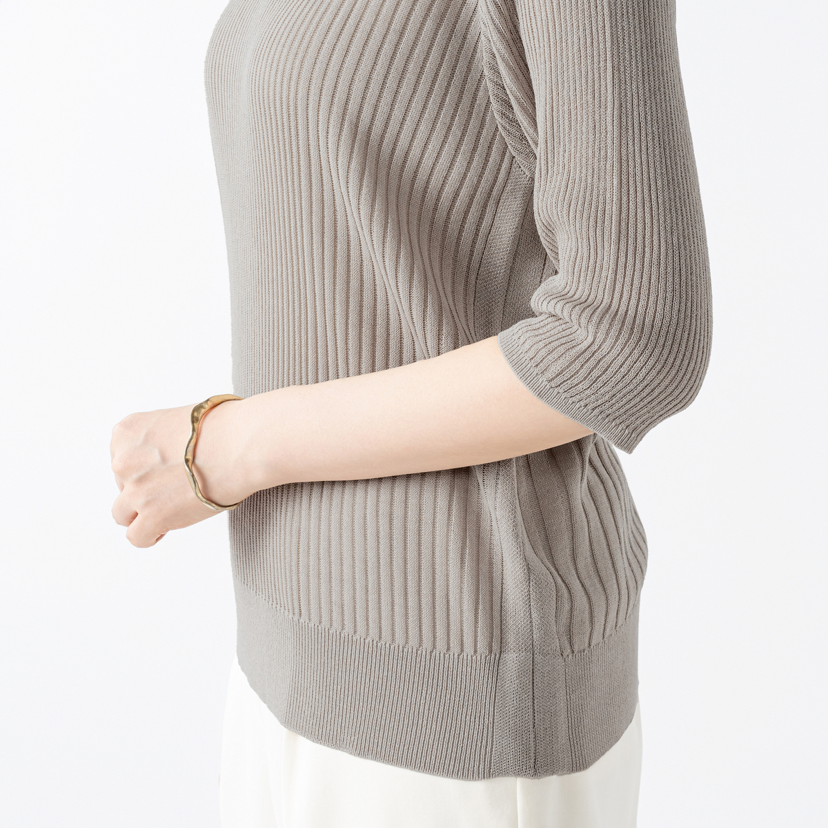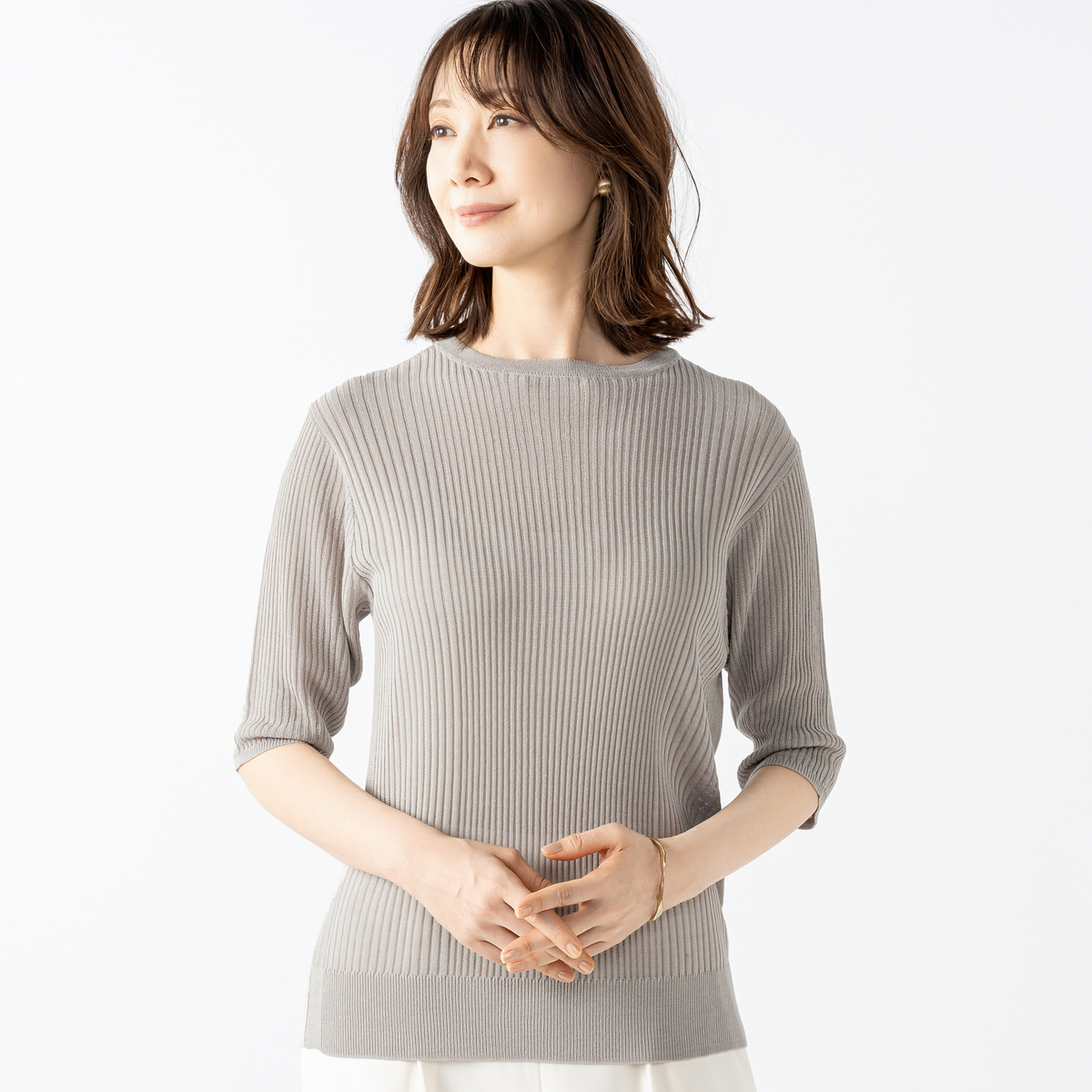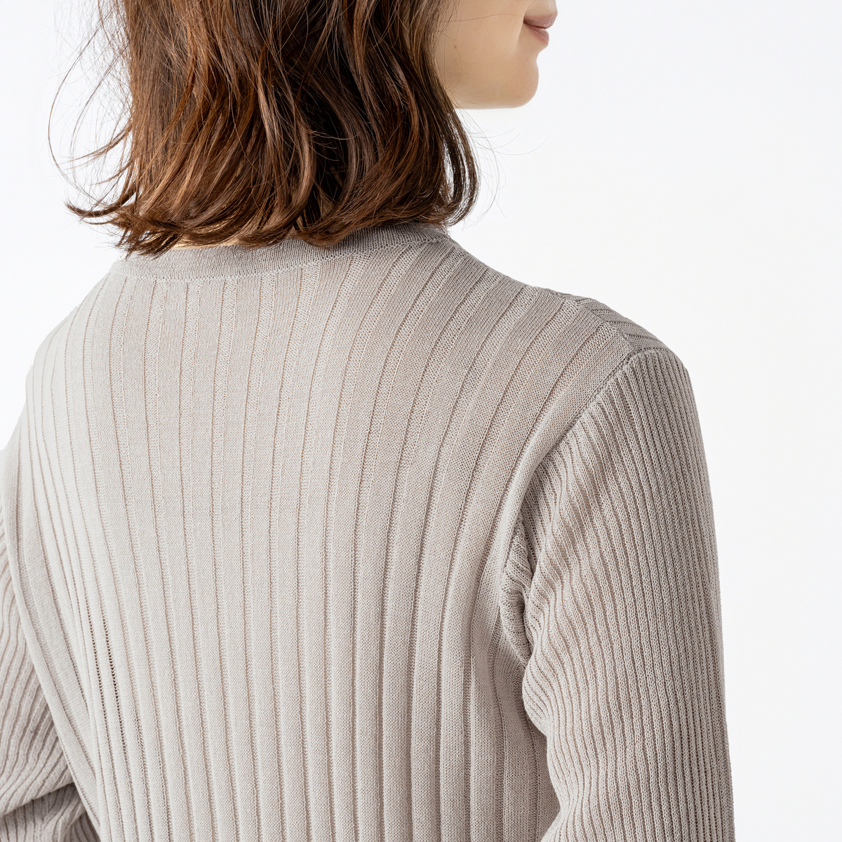 ワイドリブのインナーは縦ラインを強調し、すっきりとした印象に。ワントーンでまとめることで上品さが際立ち、編地のコントラストによる立体感も魅力。単品でも使いやすく、シーンに合わせて幅広く活用できます